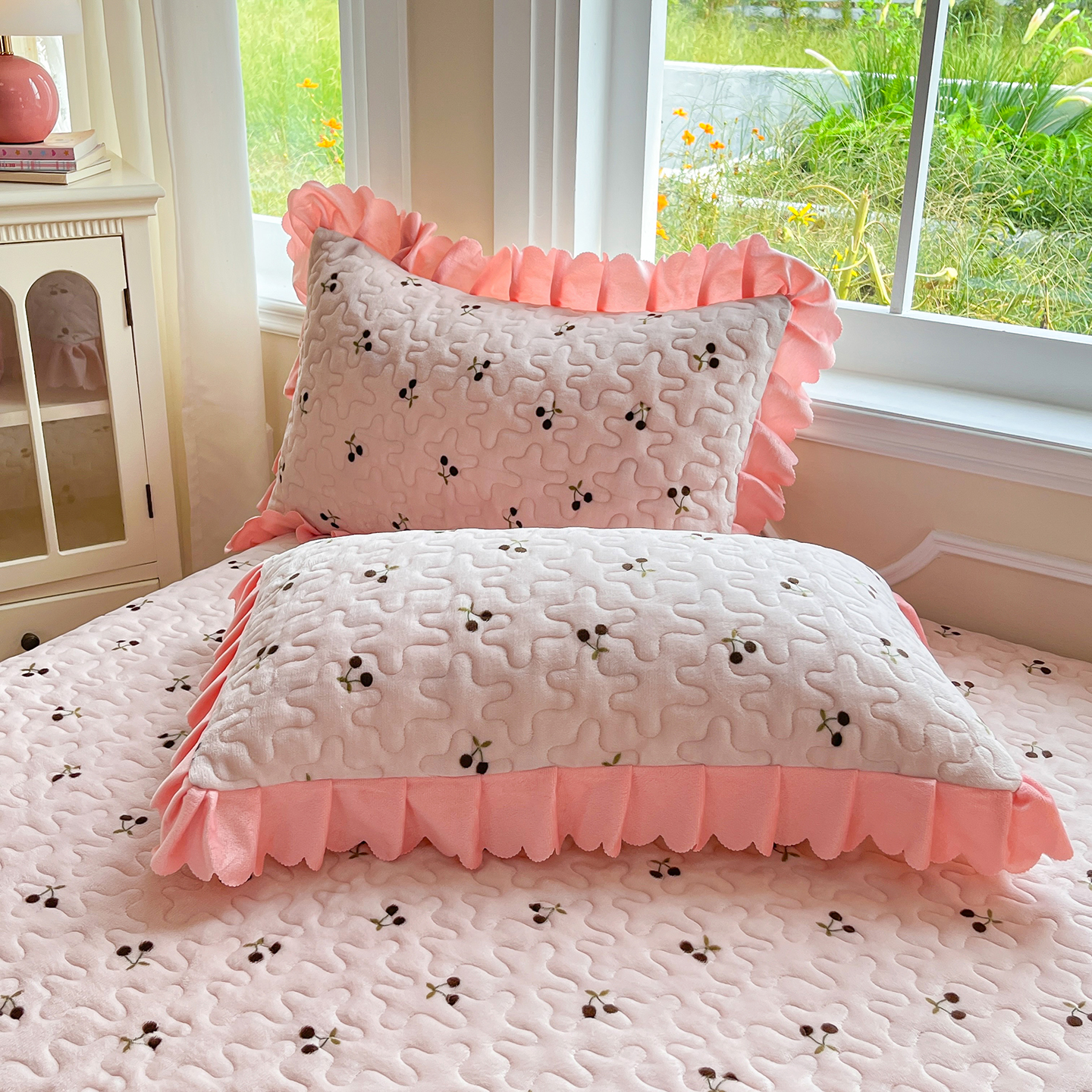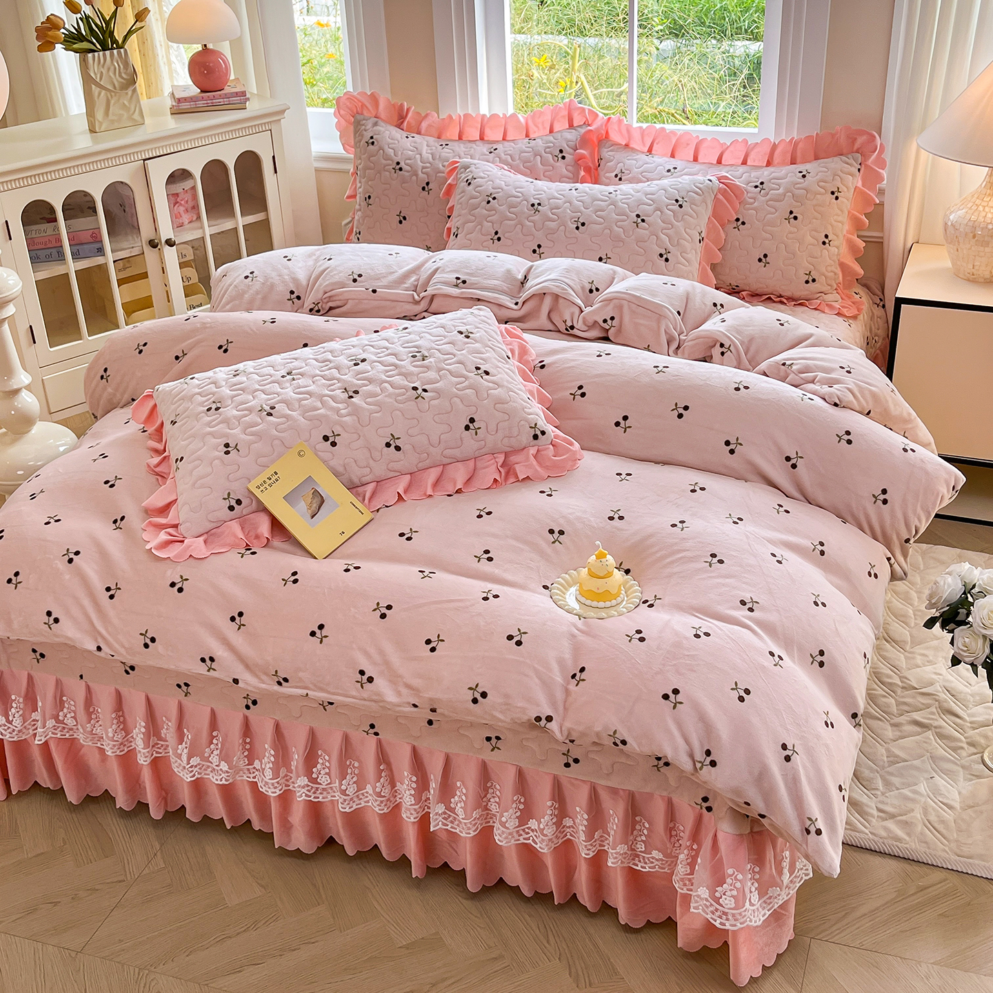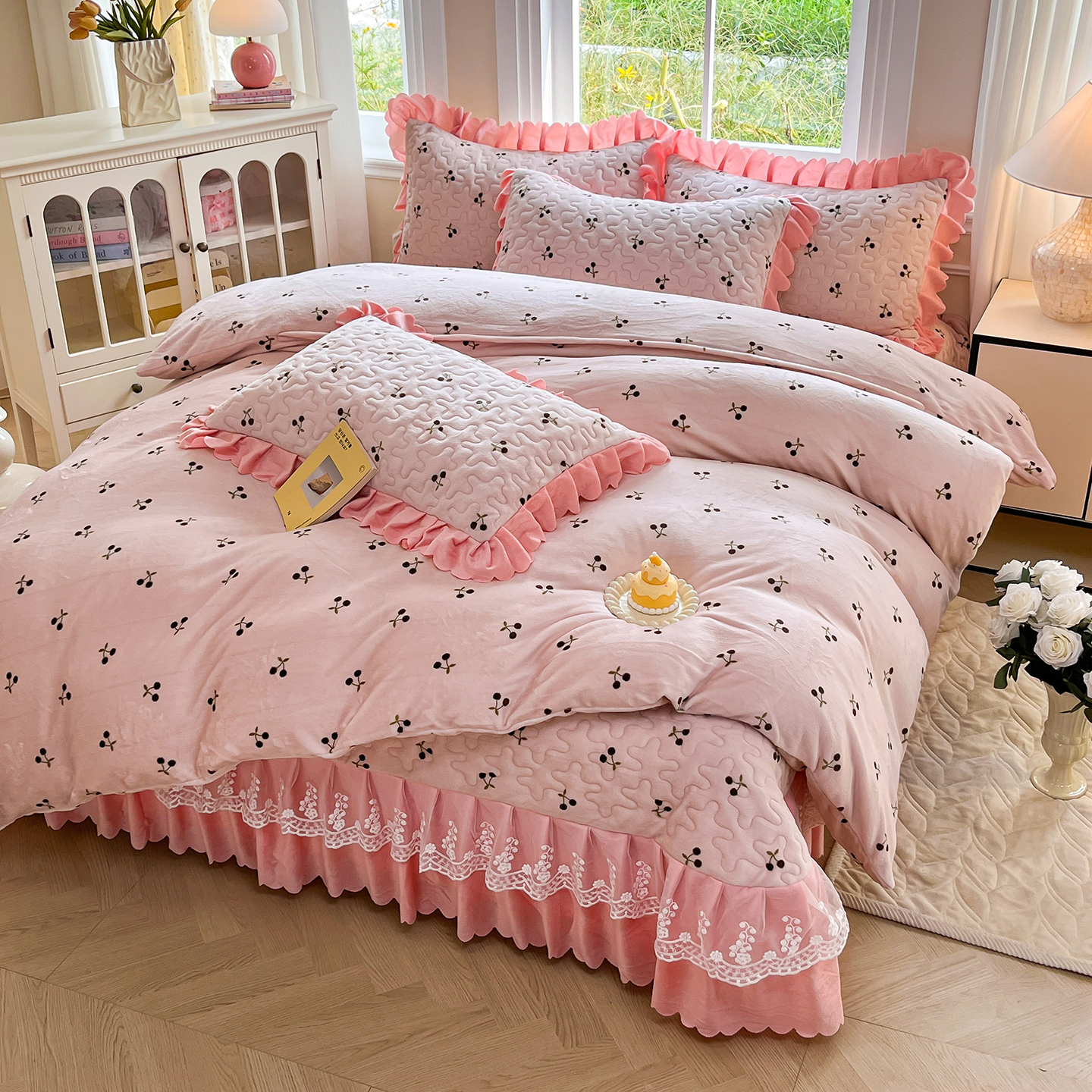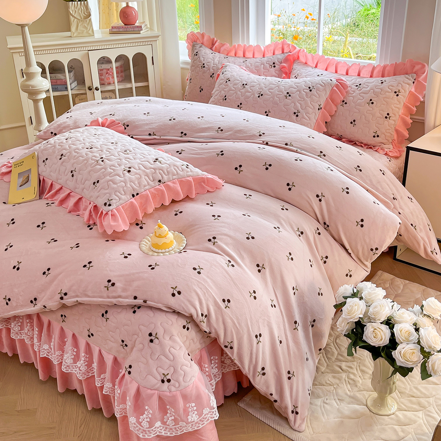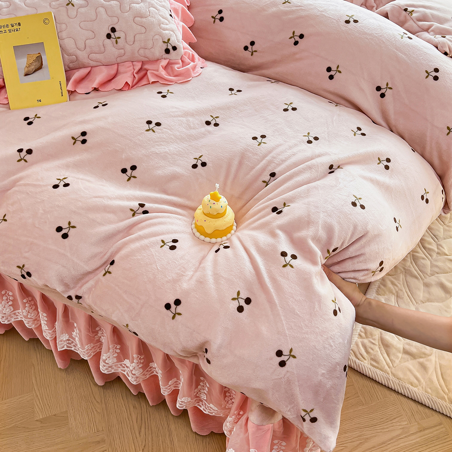 当前位置: 91家纺网 > 商品网购 > 床品套件 > 四件套 > 牛奶绒四件套 > 提花大世界 2025新款爆款高克重牛奶绒印花夹棉蕾丝花边床盖床三件四件套 樱桃玉