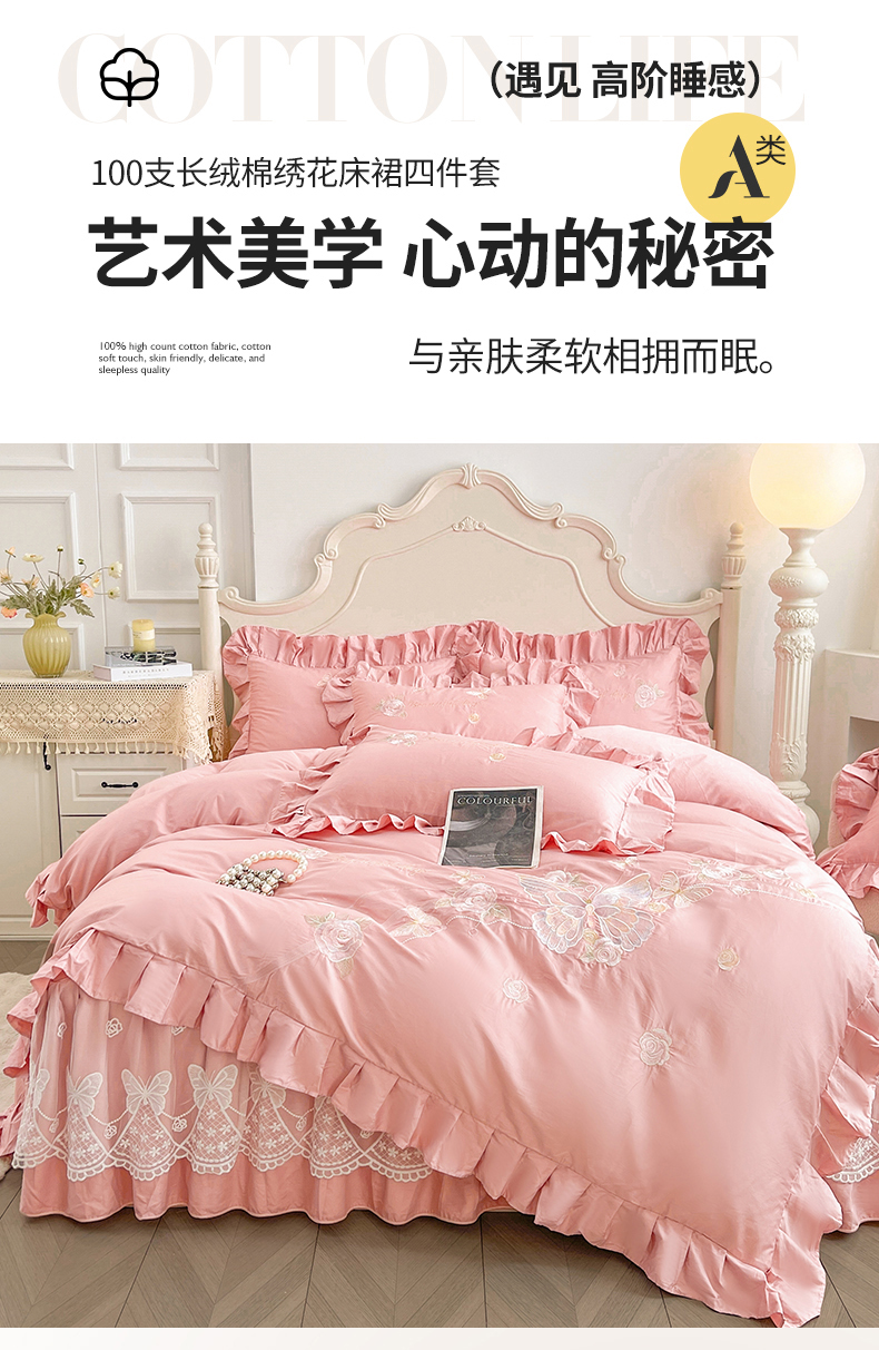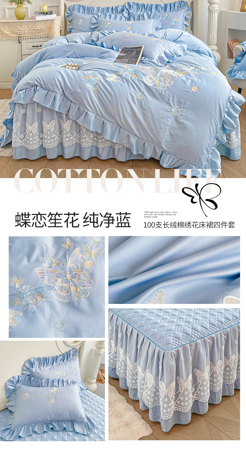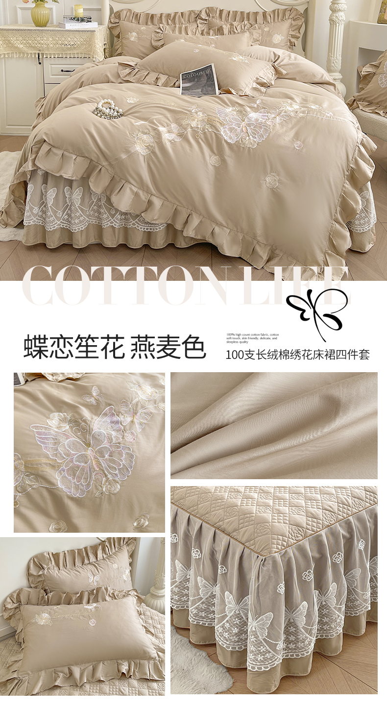 当前位置: 91家纺网 > 商品网购 > 床品套件 > 多件套 > 多件套 > 宜凡家纺 2025新款长绒棉绣花床裙床裙四件套--蝶恋笙花系列 蝶恋笙花 燕麦色