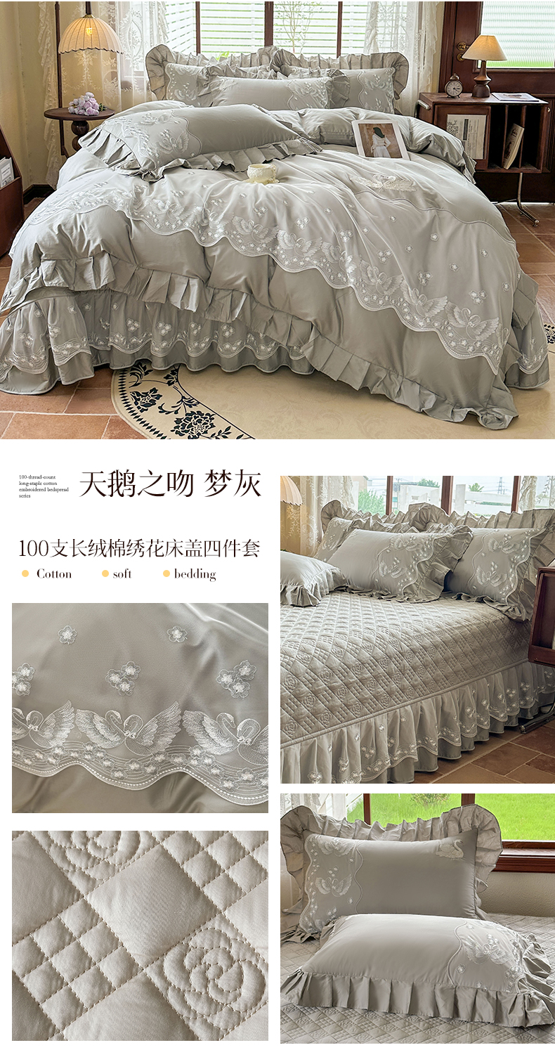 商品名称:宜凡家纺 2025新款长绒棉绣花夹棉床盖四件套--天鹅之吻系列 天鹅之吻 奶玉