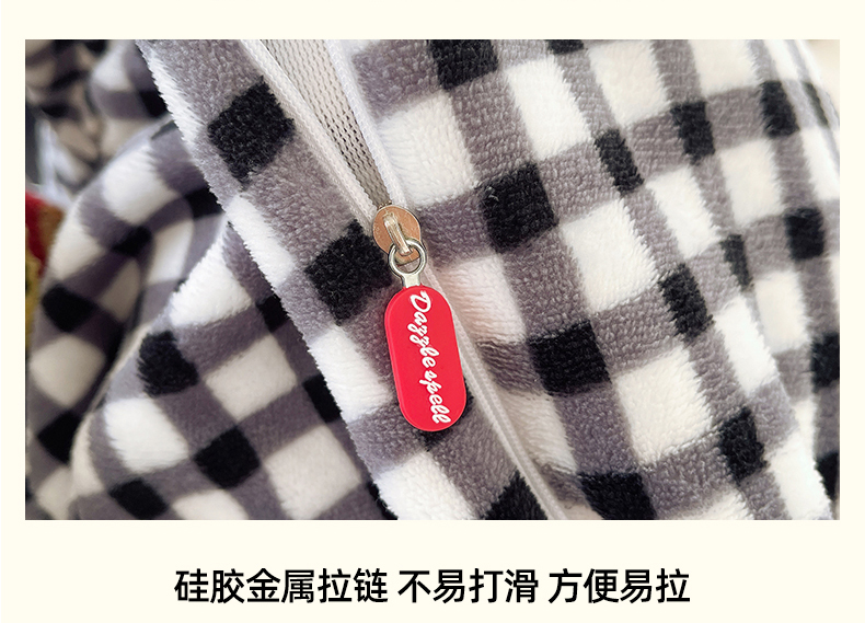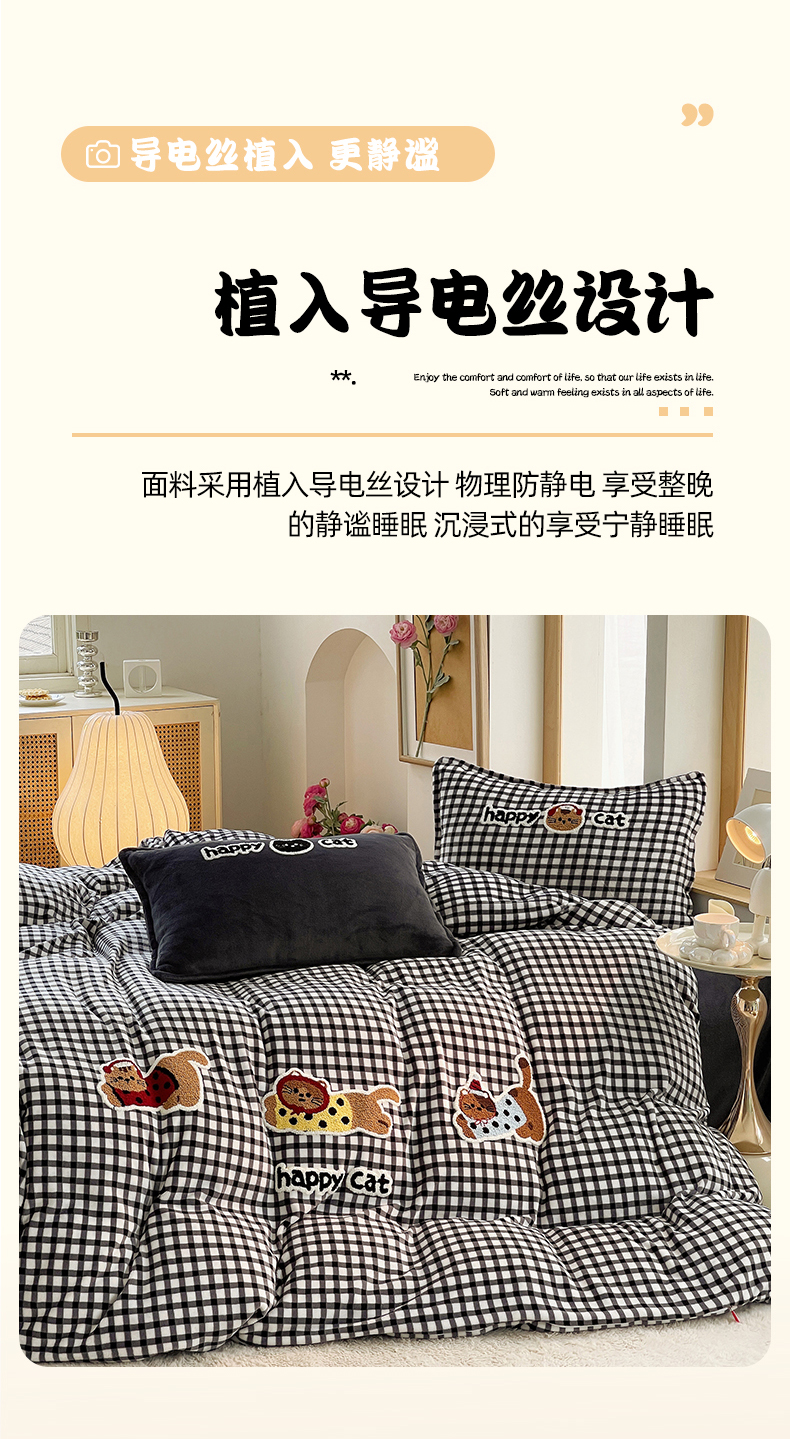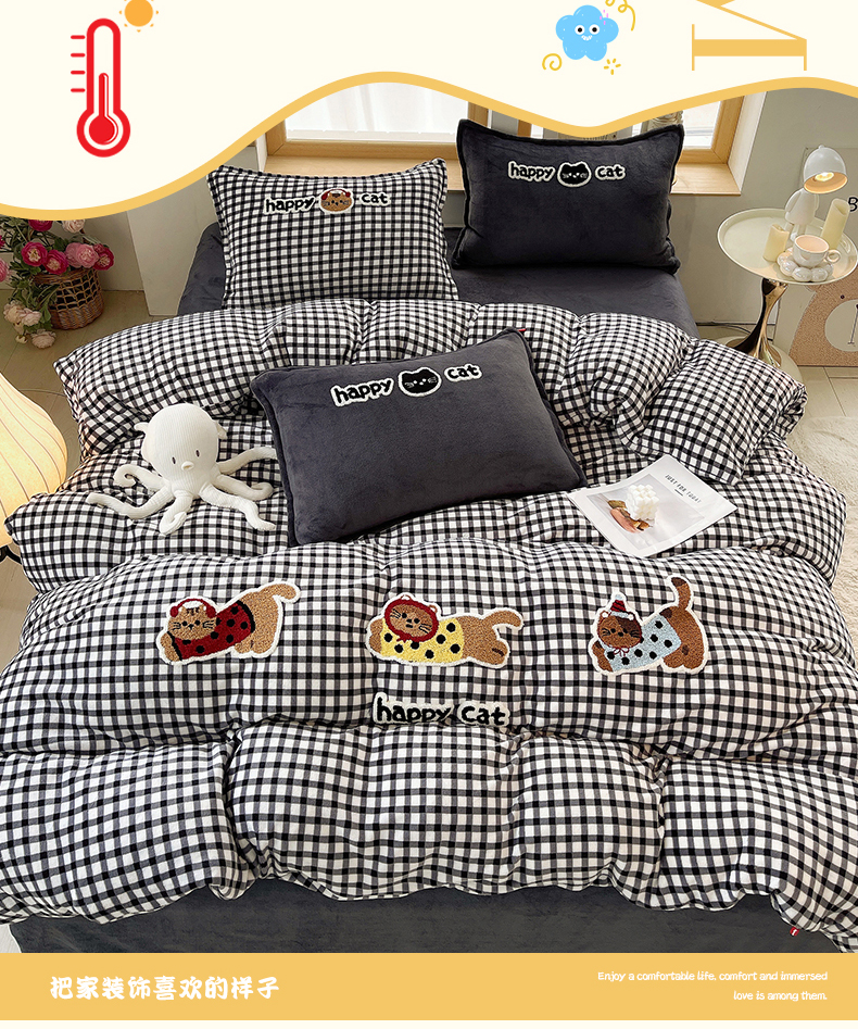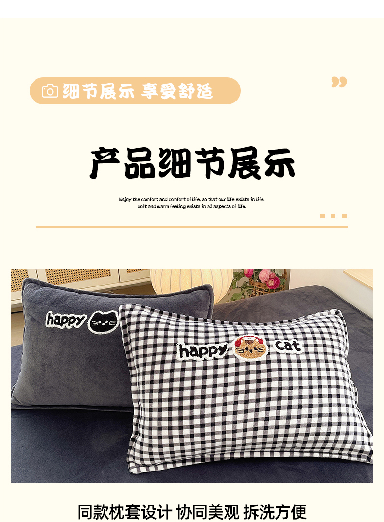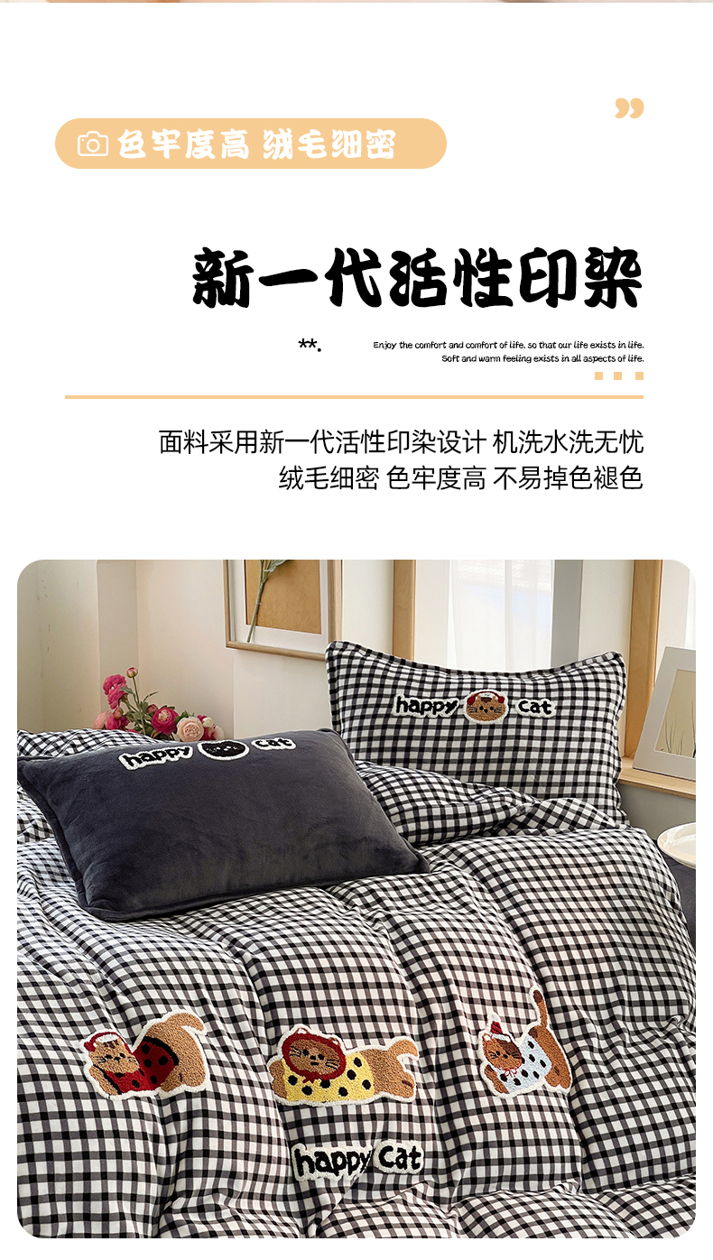 商品名称:炫拼家纺 2025新款高克重牛奶绒格子卡通毛巾绣加厚四件套-糖宝系列 糖宝-喵了个咪