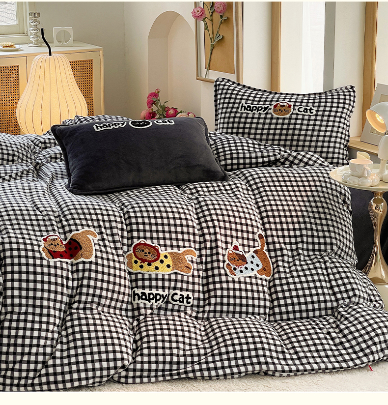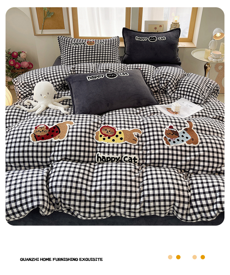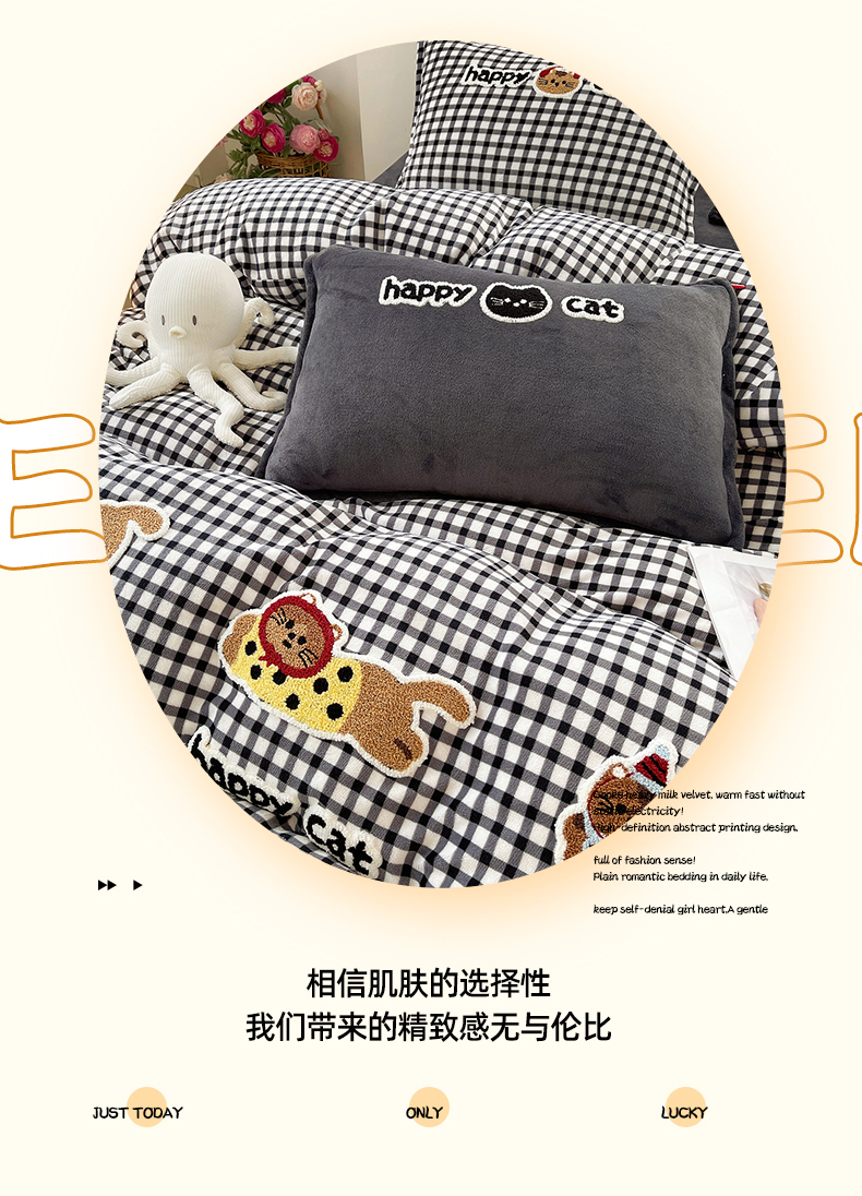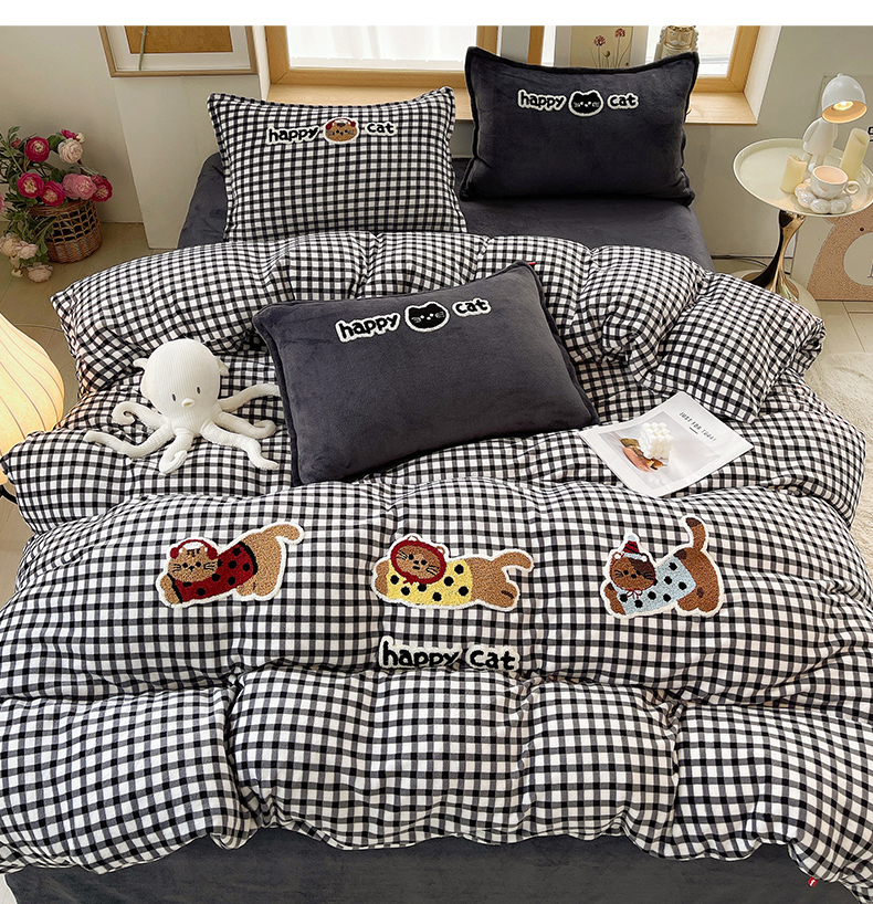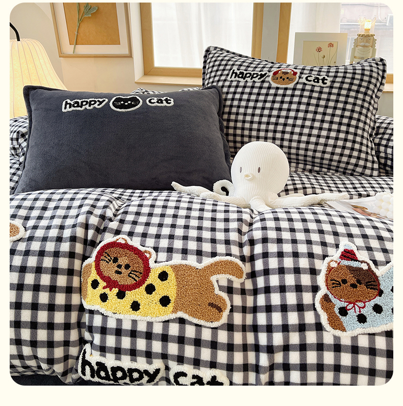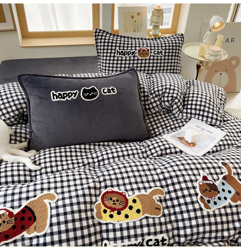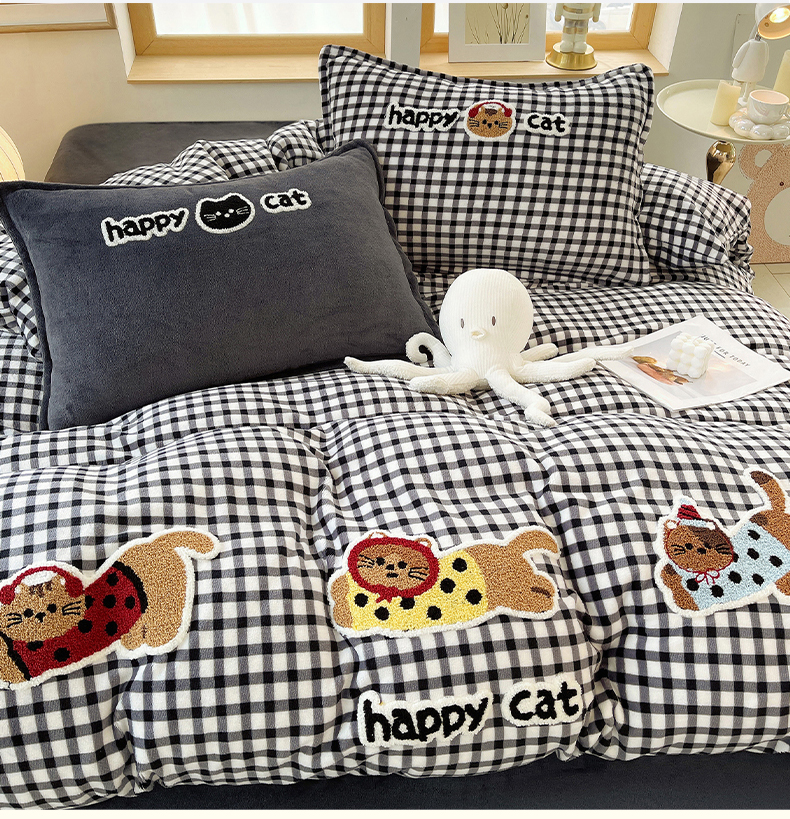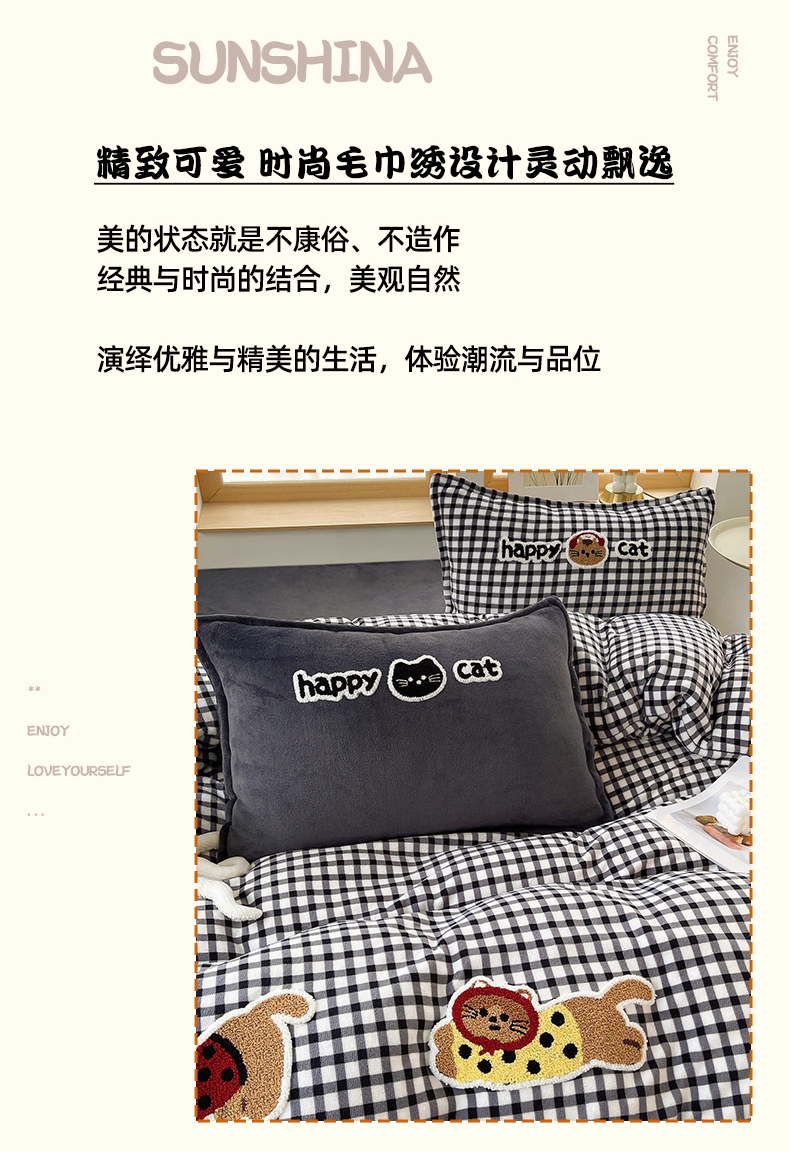 炫拼家纺 2025新款高克重牛奶绒格子卡通毛巾绣加厚四件套-糖宝系列 糖宝-喵了个咪