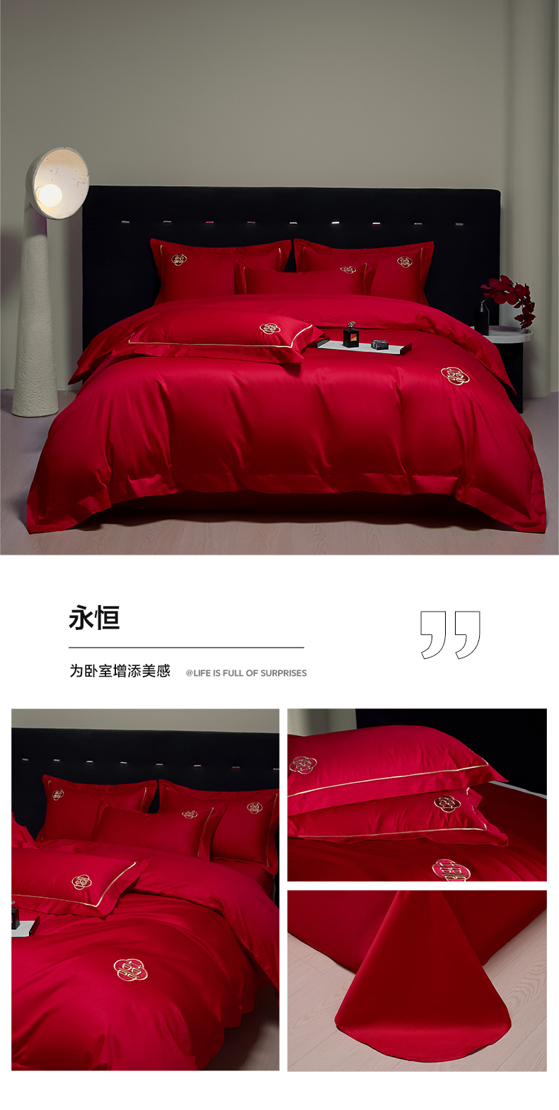 (总)欧乐蒂 2025新款亲肤棉刺绣花边婚庆四件套-浪漫花季,浪漫花季-红,浪漫花季-金