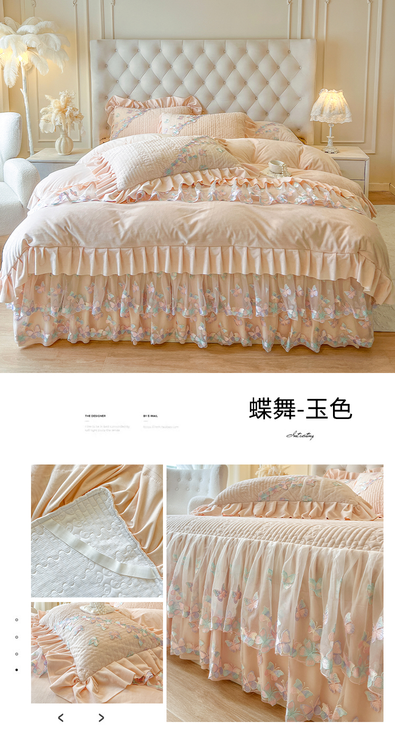 商品名称:瑞宝 2025新款宝宝绒重工刺绣花边床裙四件套-梦蝶 梦蝶-蜜粉(控价 318起)