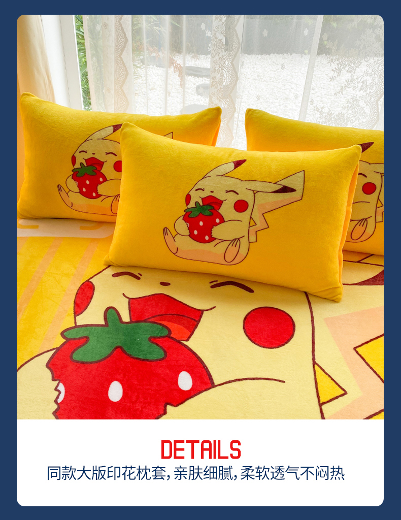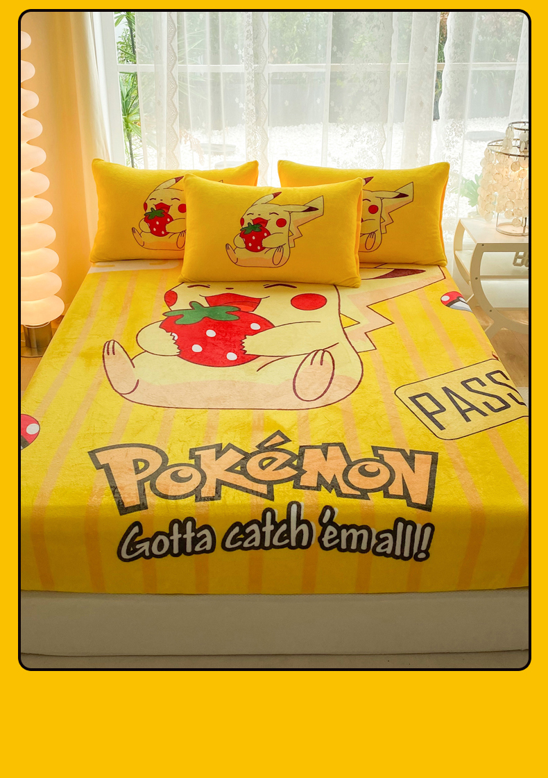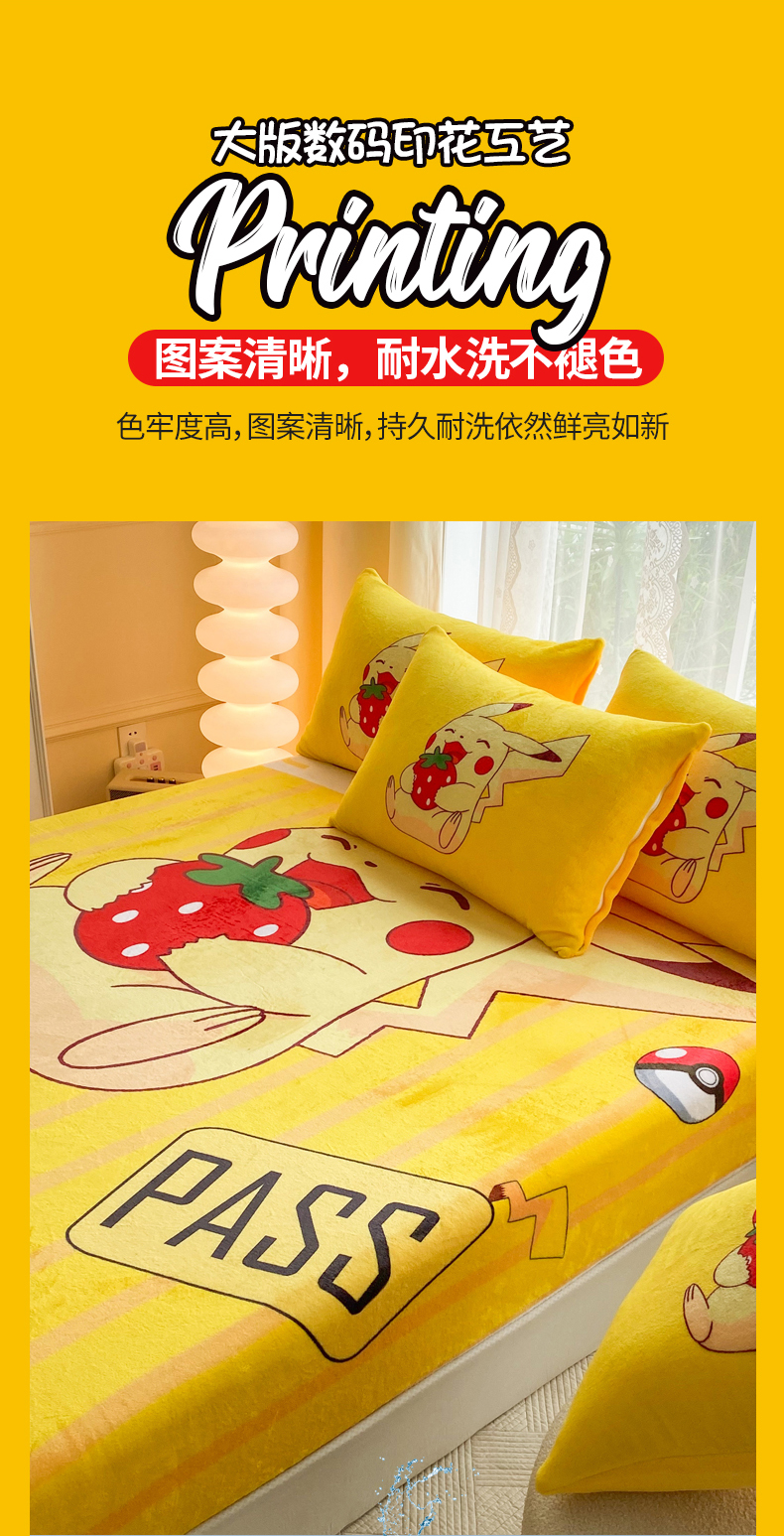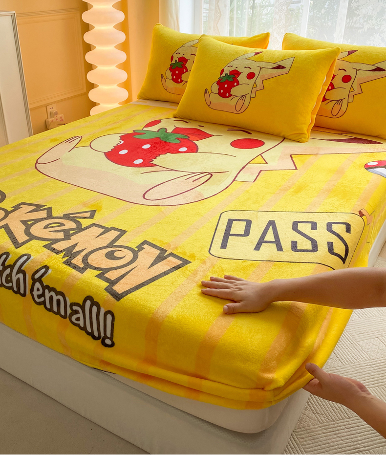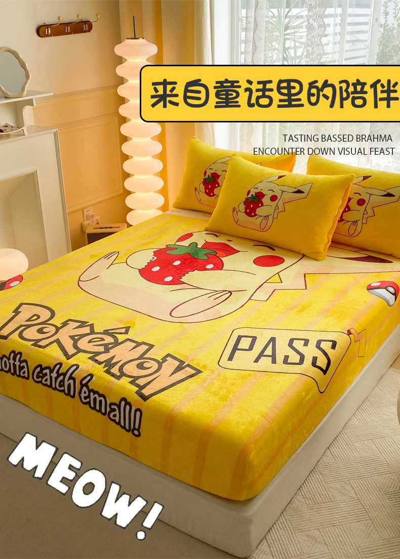 一电 外贸2025新款卡通珊瑚绒床笠单件床罩冬季加厚牛奶绒床垫保护罩全包床单套 草莓皮卡丘