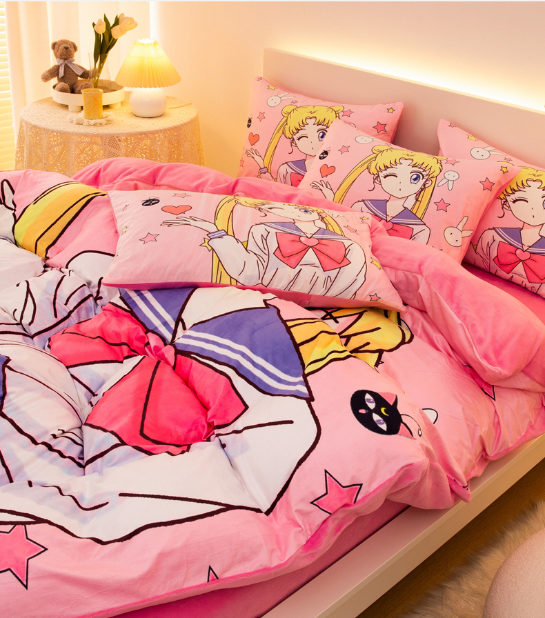 一电 2025外贸跨境电商儿童卡通床上四件套亲肤牛奶绒学生三件床单被套加大珊瑚宝宝卡通单被套3 爱心美少女
