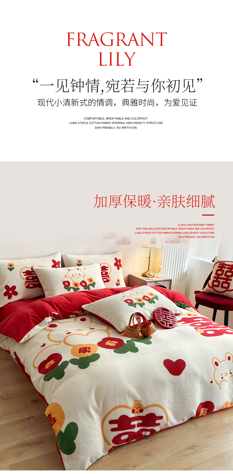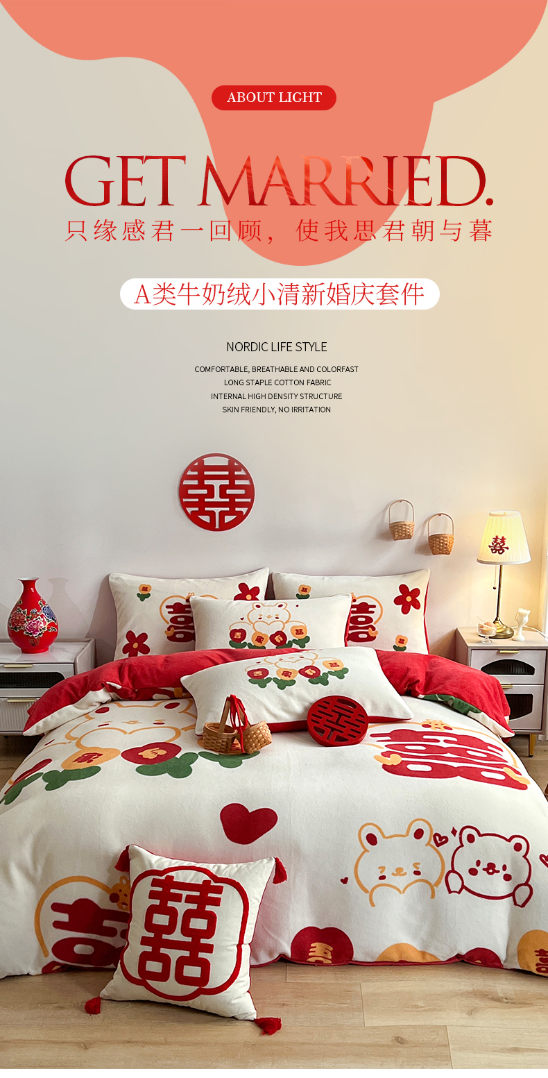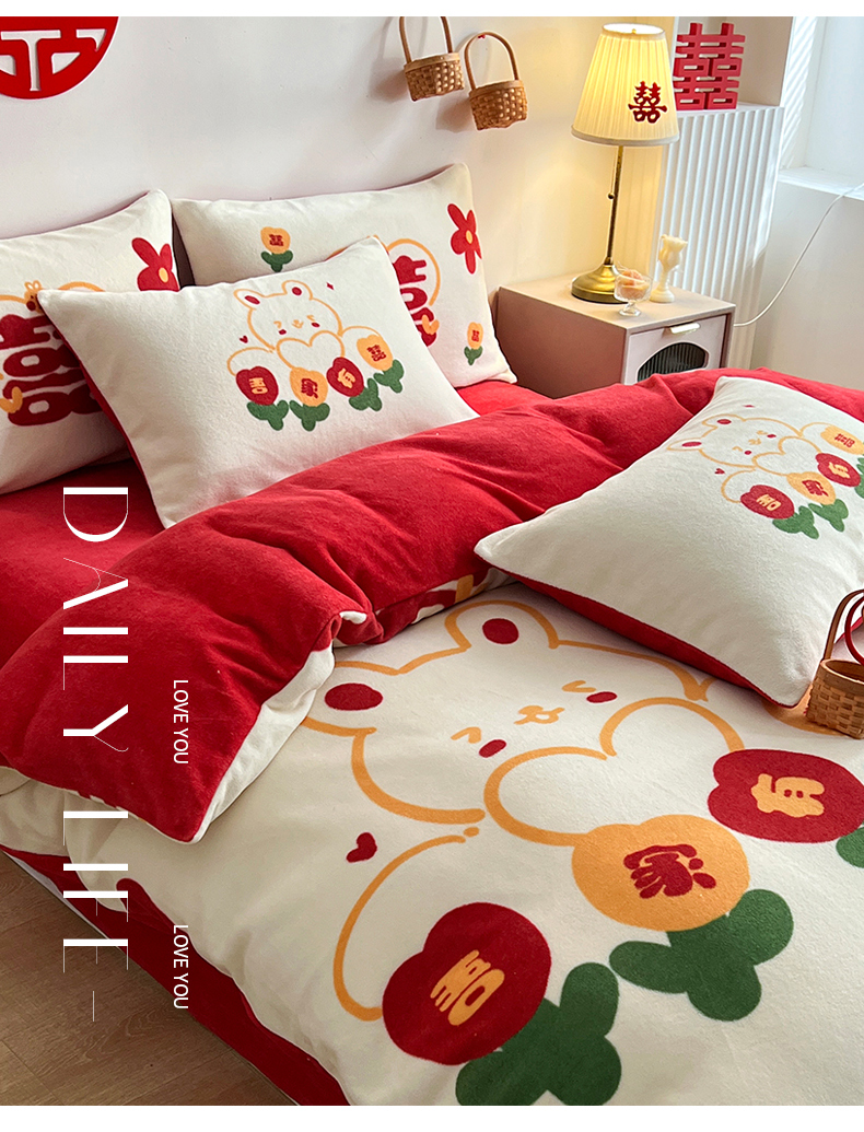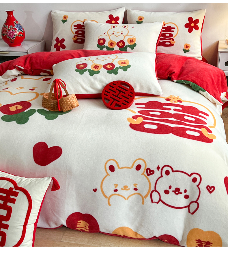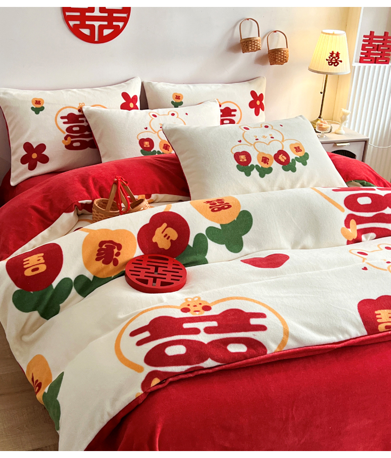 商品名称:一电 2025新款网红花婚庆牛奶绒四件套结婚喜被大红色新婚被罩婚嫁妆被套床单 吾家有喜