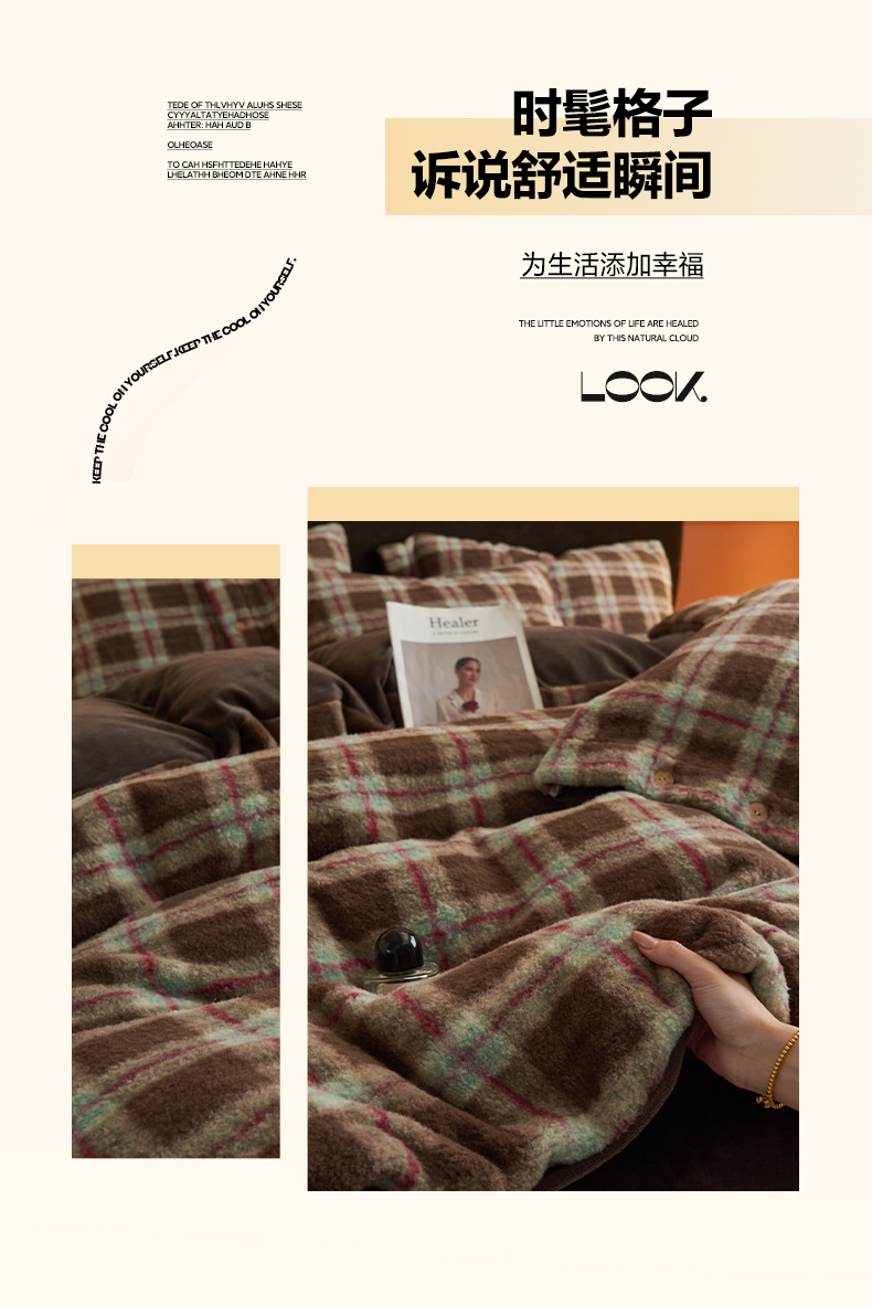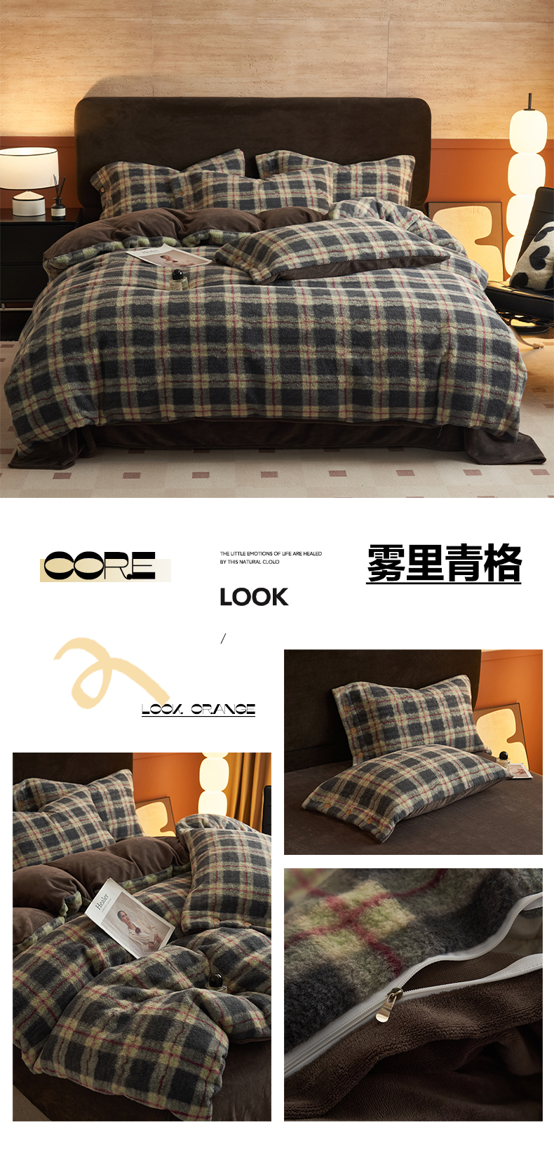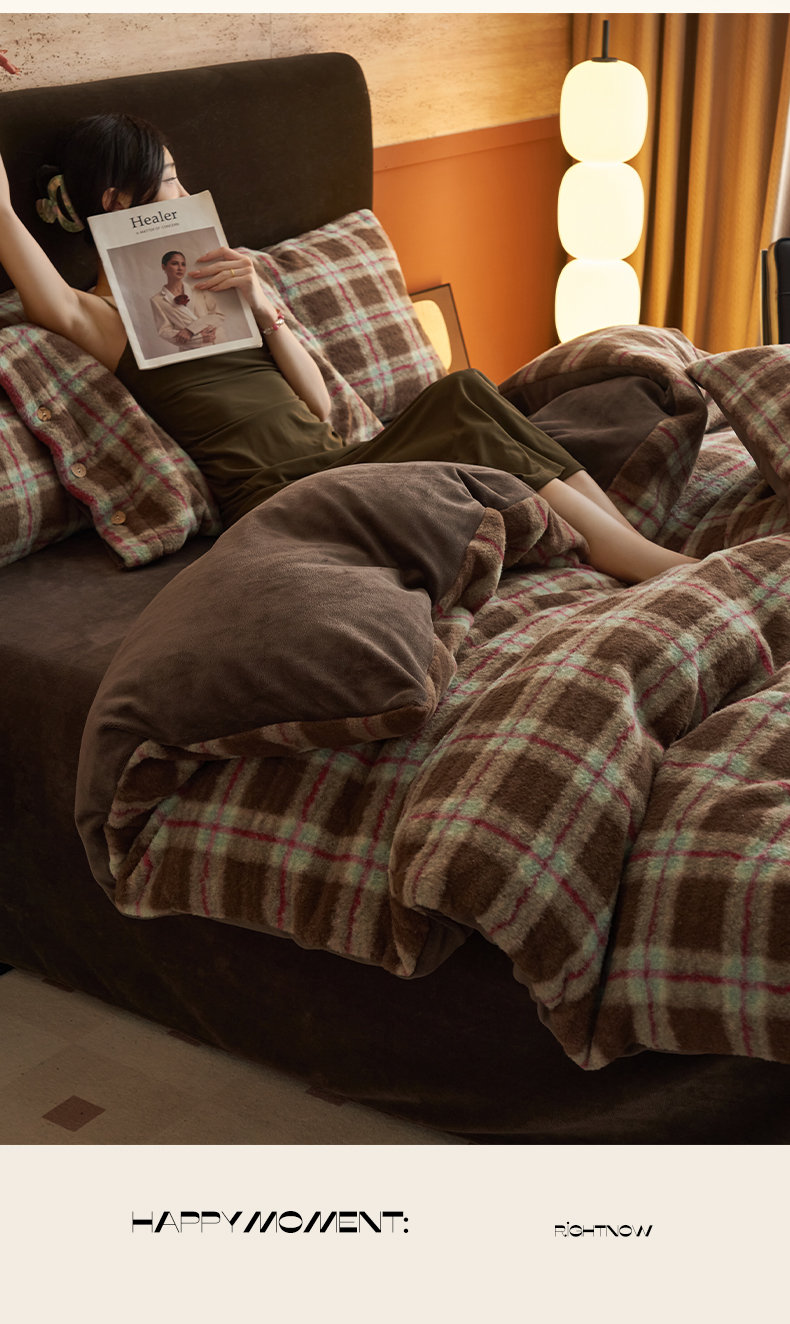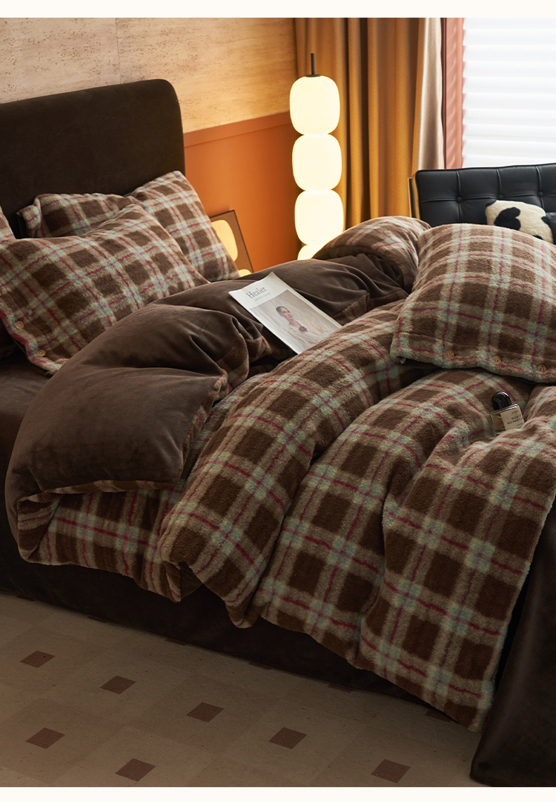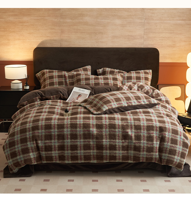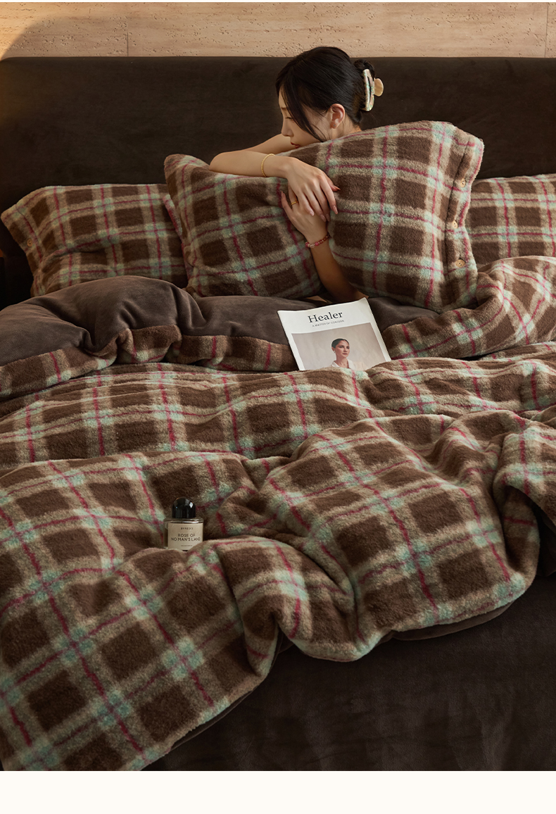 商品名称:早晨家纺 2025新款230g羊驼绒复古格牛奶绒四件套 慕池格