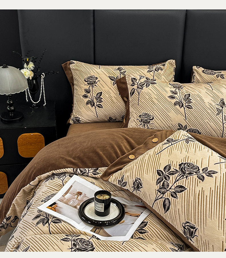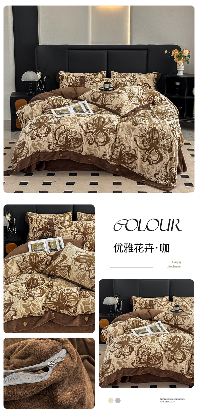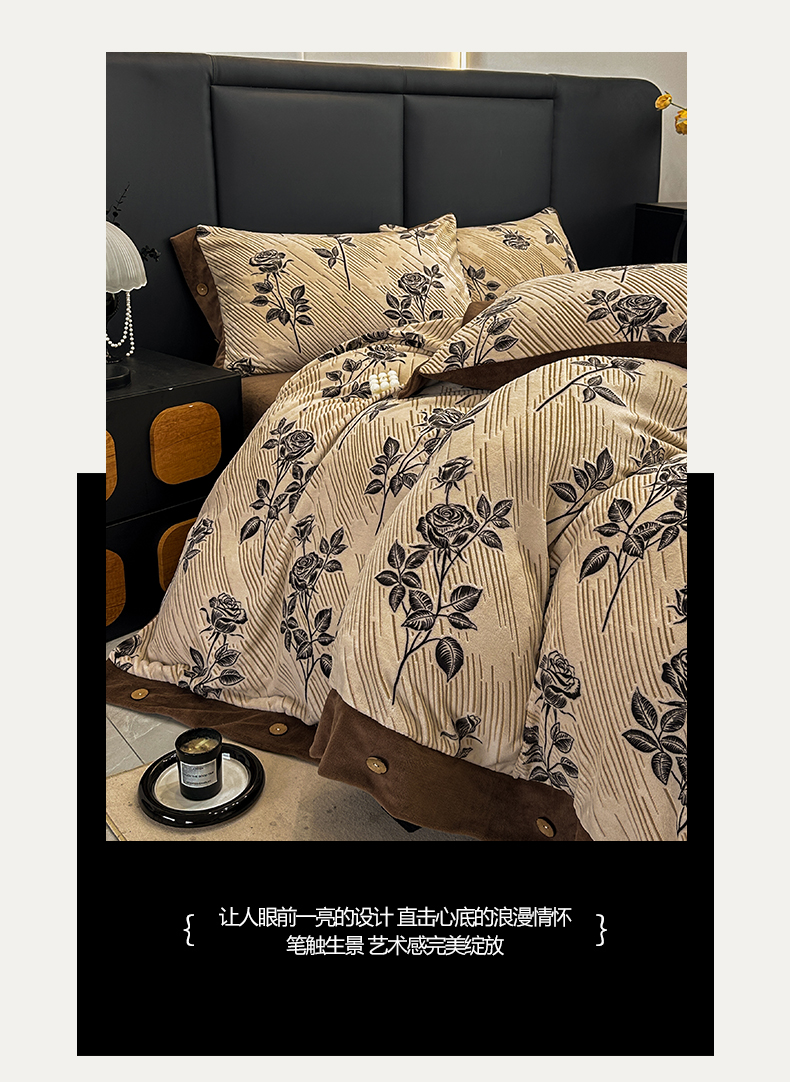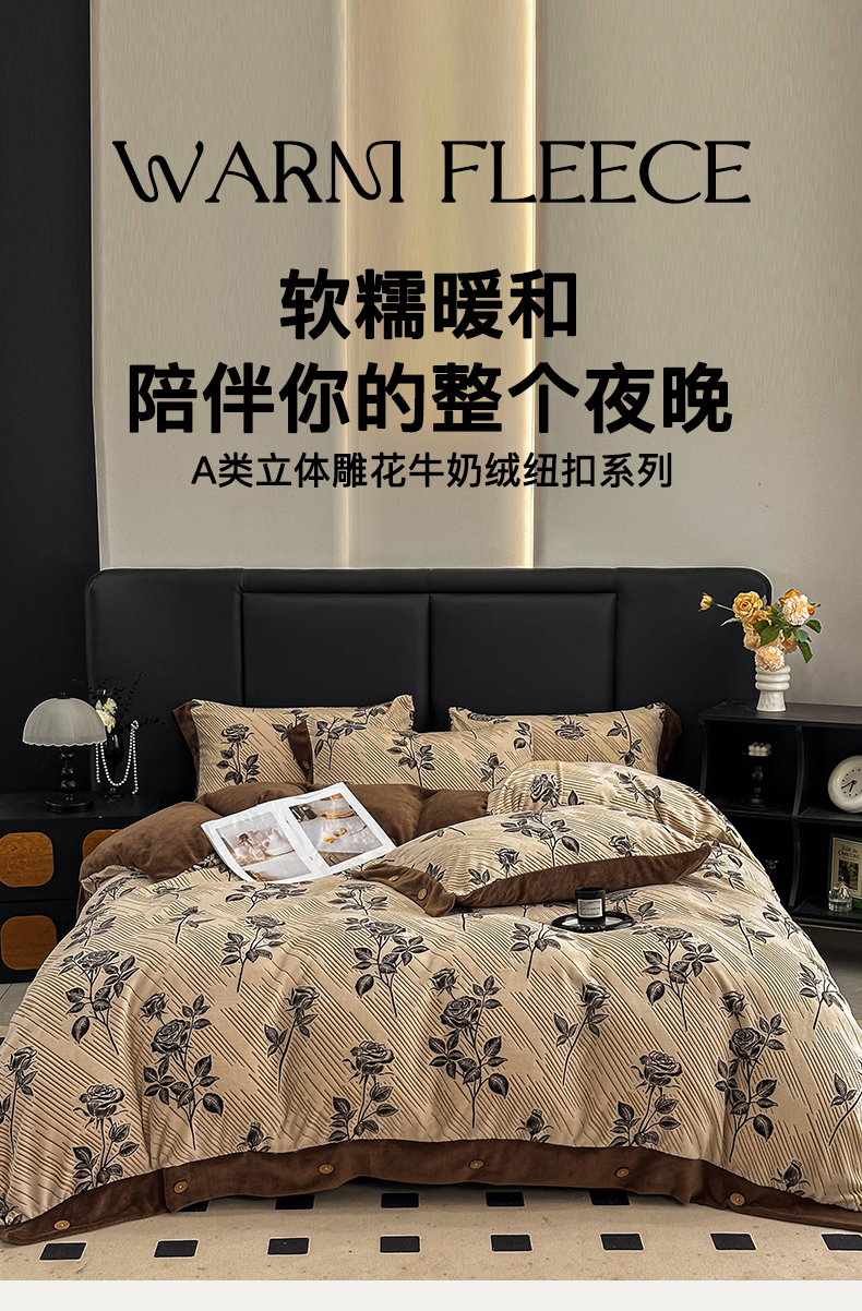 (总)晚爱家纺(原晚安家居) 2025新款宽边纽扣款雕花绒四件套烂花立体雕花牛奶绒,寒冬-粉,西西里,琥珀流光,优雅花卉-灰,玫瑰花香灰,夜半花香,玫瑰之约-咖,叶语悠然,优雅花卉-咖