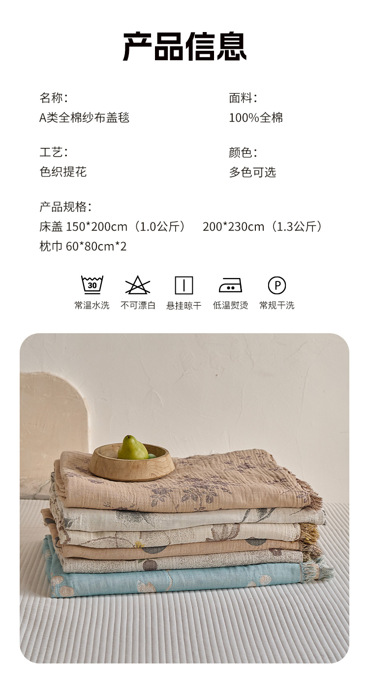 (总)沐瑟家纺 2025新款简约风多功能纱布盖毯纱布毯子毛巾被床盖沙发巾单毯枕巾枕套三件套,H本色,H橙色,H咖色,大马士革本色