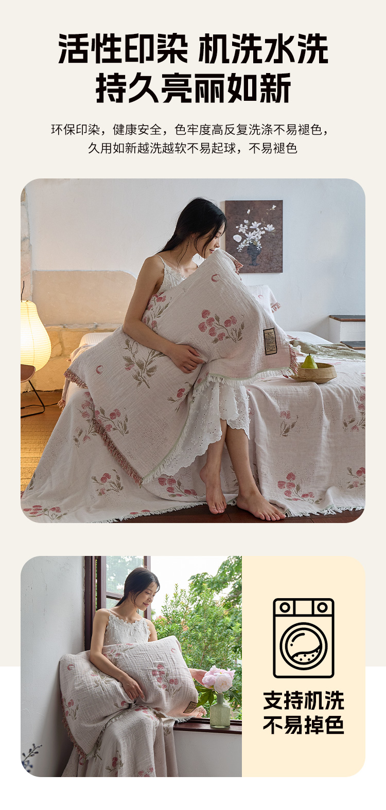 商品名称:沐瑟家纺 2025新款四层纱布全棉流苏毯子纱布床盖毛巾被纯棉棉纱夏凉被午睡盖毯三件套 白芷