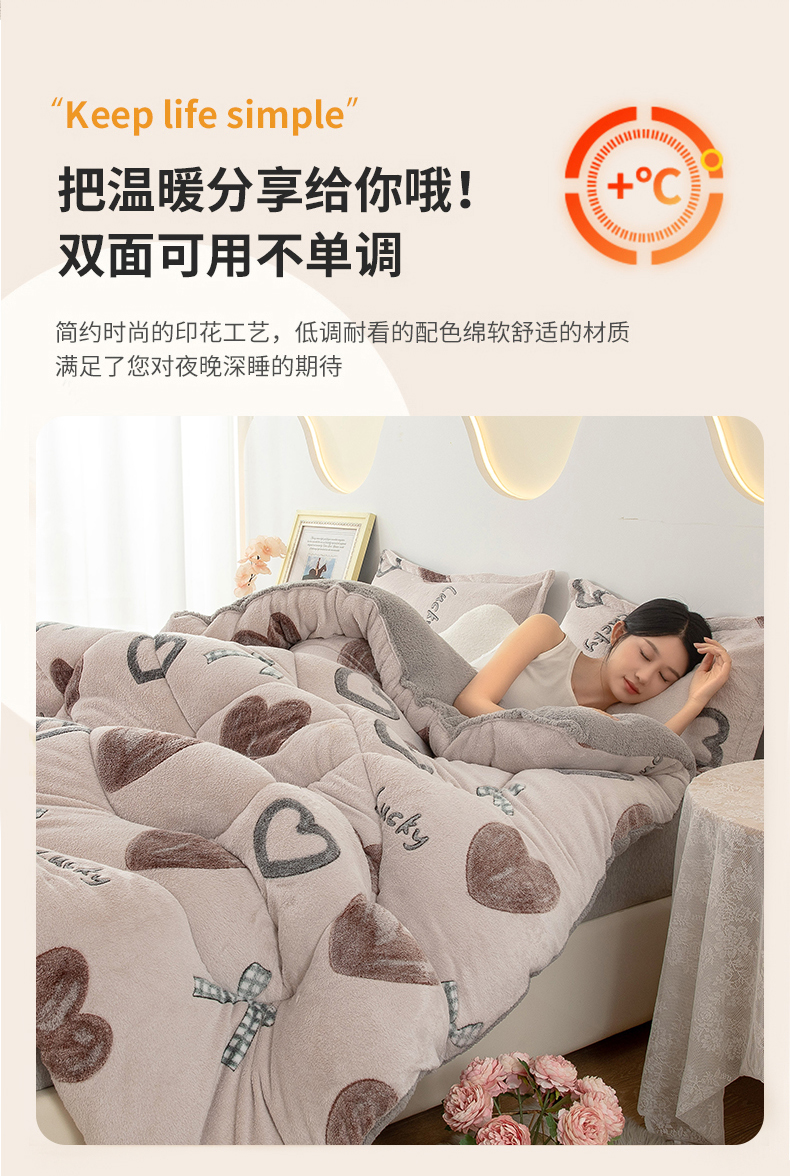 当前位置: 91家纺网 > 商品网购 > 被子 > 冬被 > 悦织湾家纺 2025暖绒冬季被子A面雪花绒牛奶绒塔芙绒B面羊羔绒加厚速暖2025新款跨境出口外贸电商热销款可定做 雪花绒心心相印