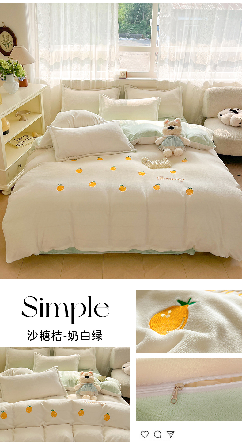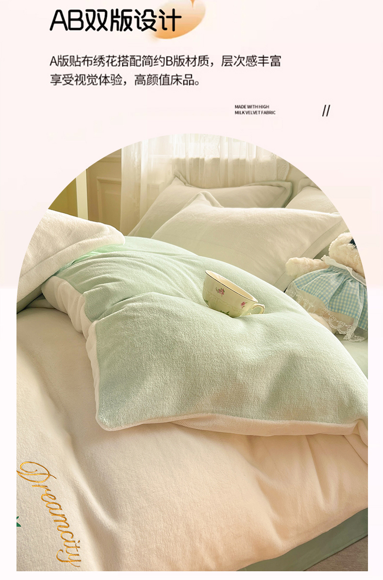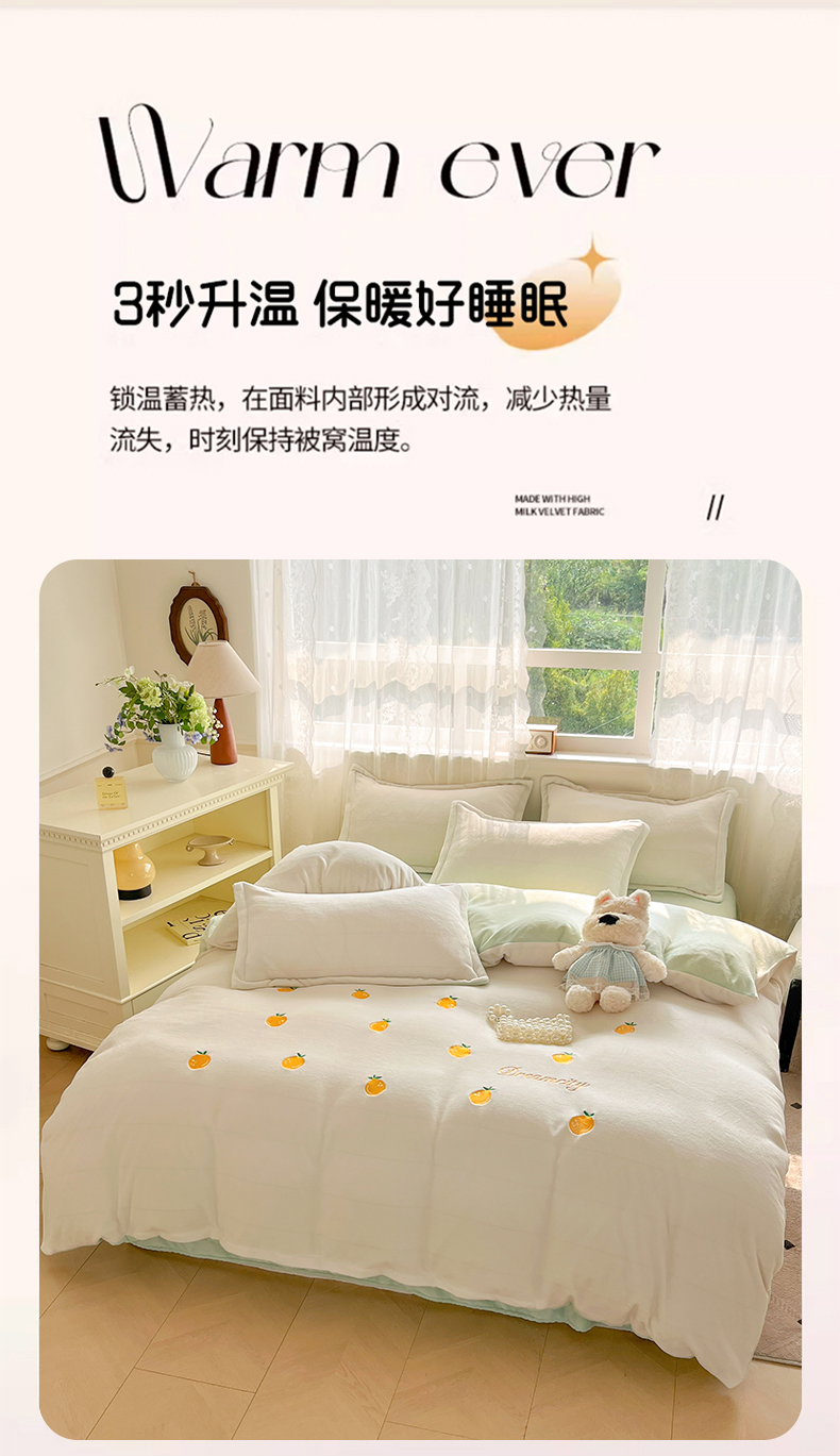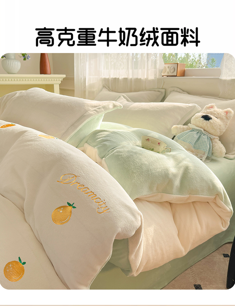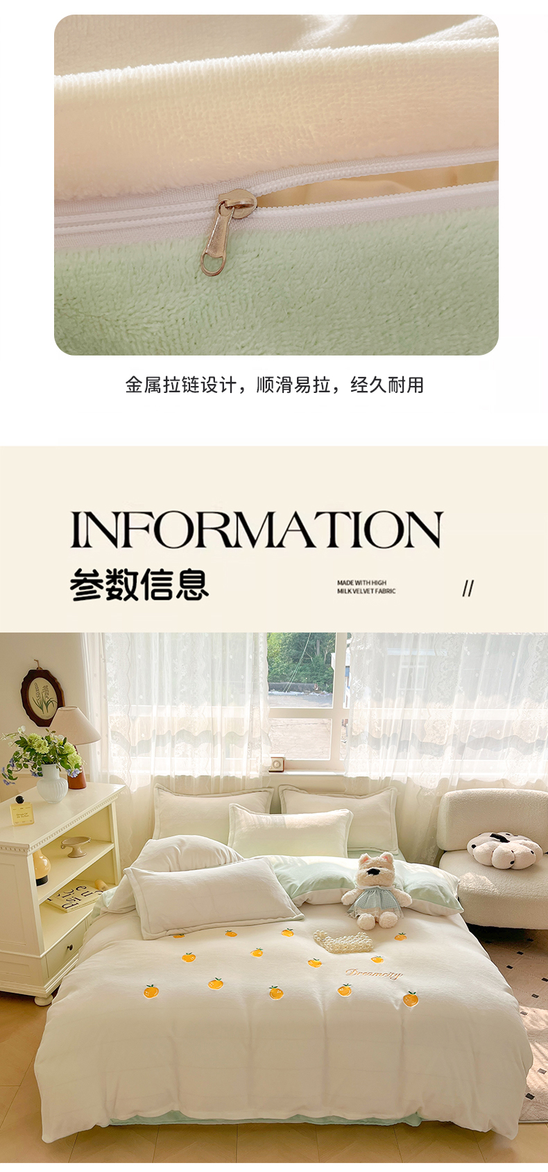 商品名称:伊梵居2025新款加厚贴布绣牛奶绒四件套 沙糖桔-奶白绿