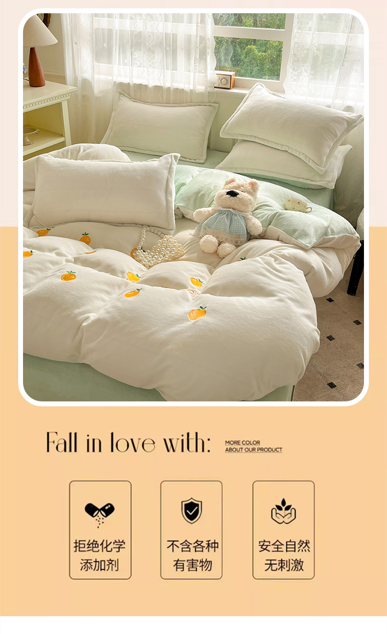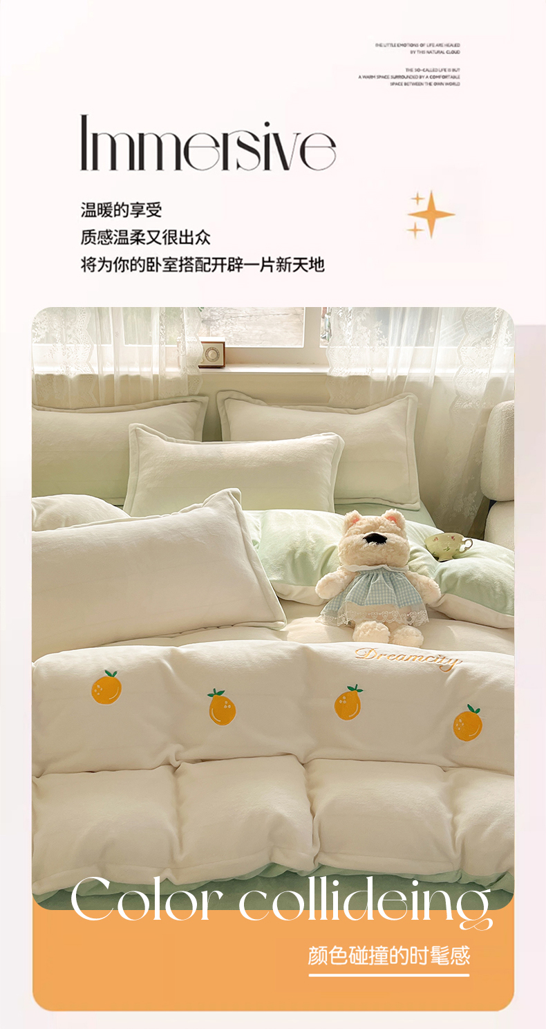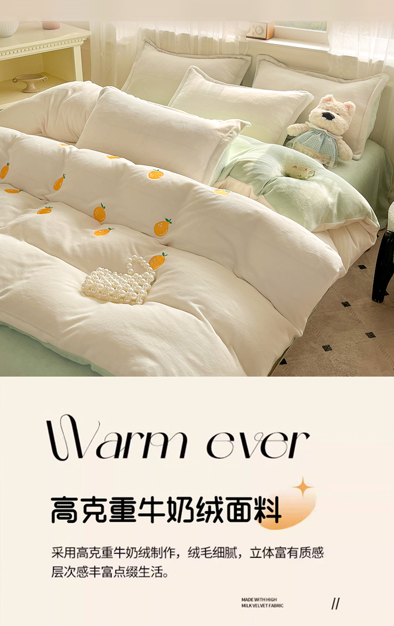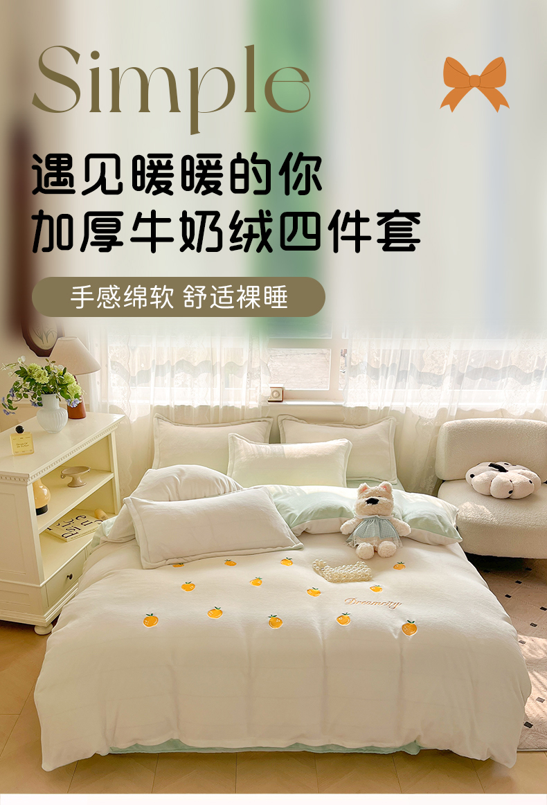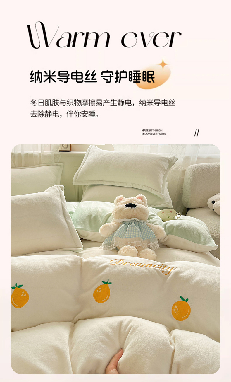 商品名称:伊梵居2025新款加厚贴布绣牛奶绒四件套 沙糖桔-奶白绿