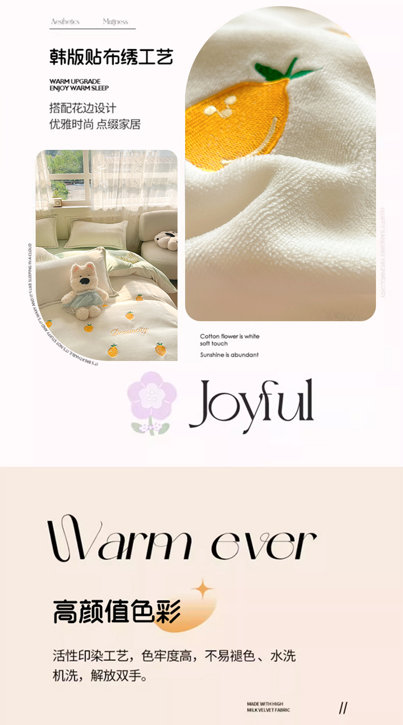 伊梵居2025新款加厚贴布绣牛奶绒四件套 沙糖桔-奶白绿