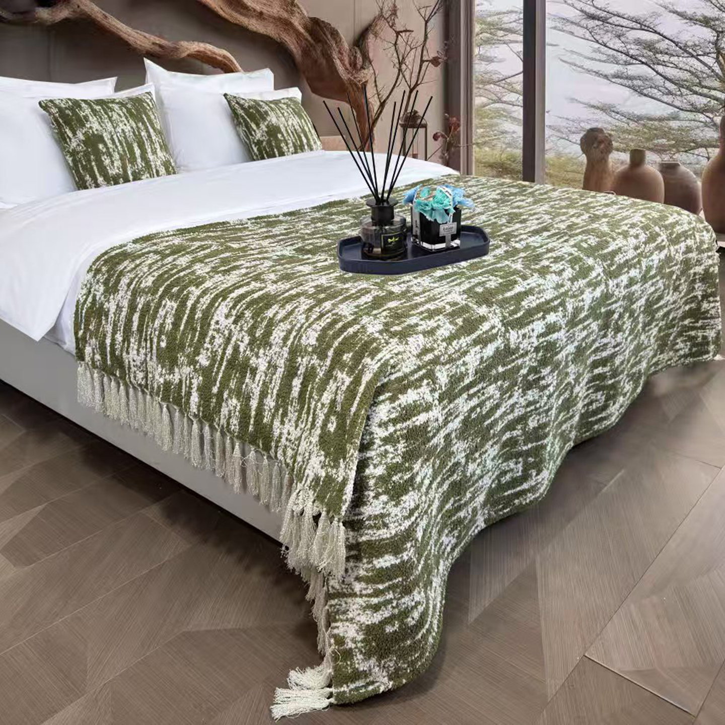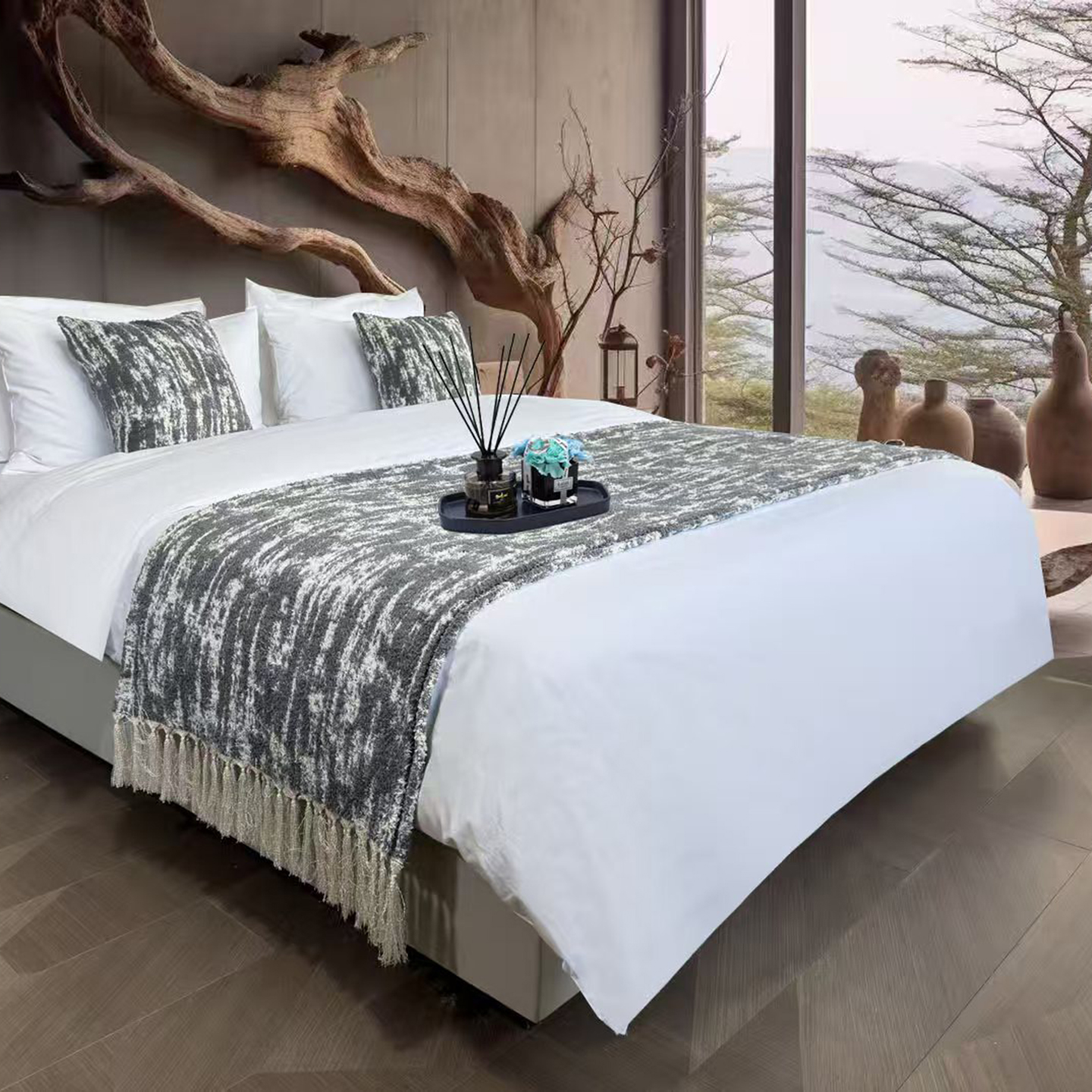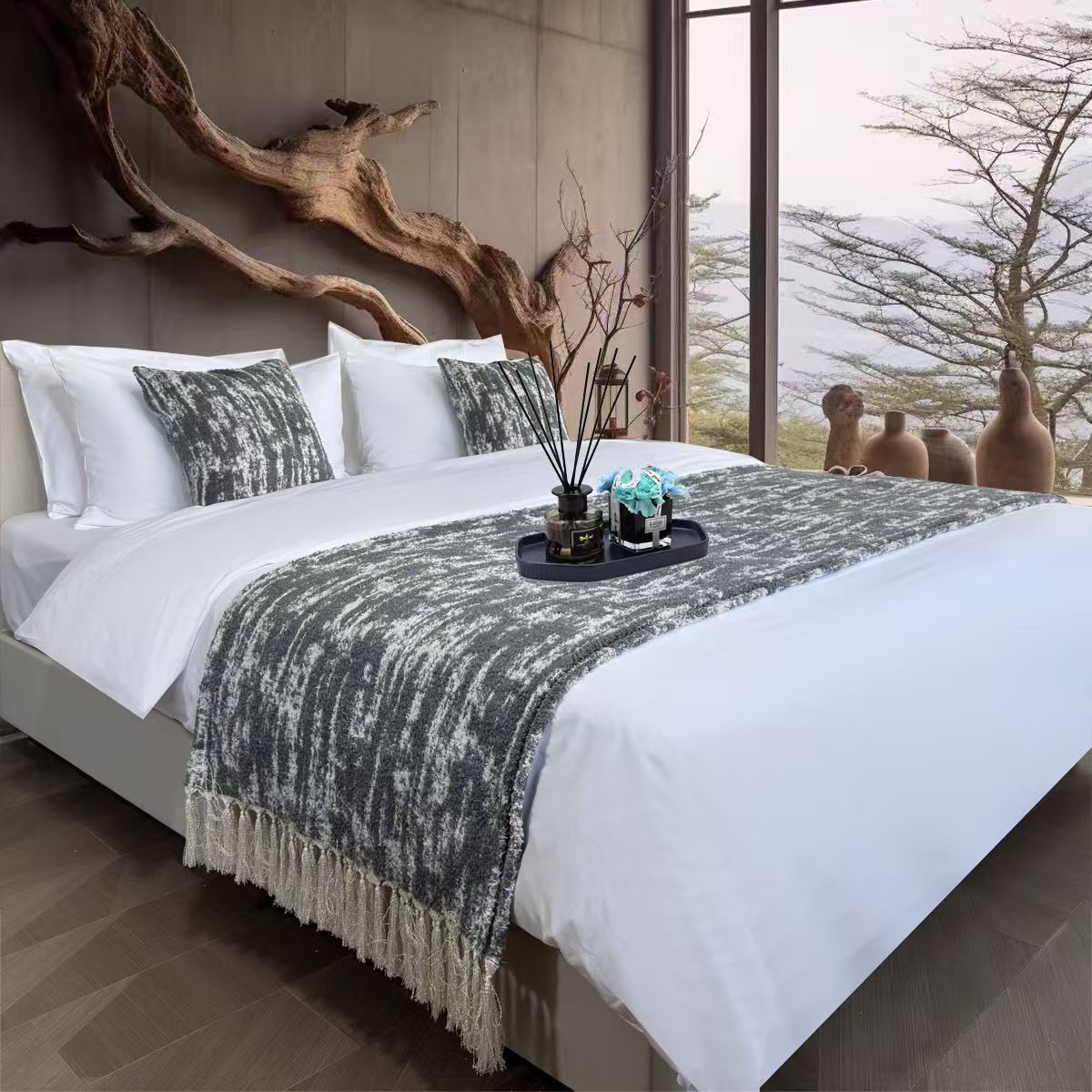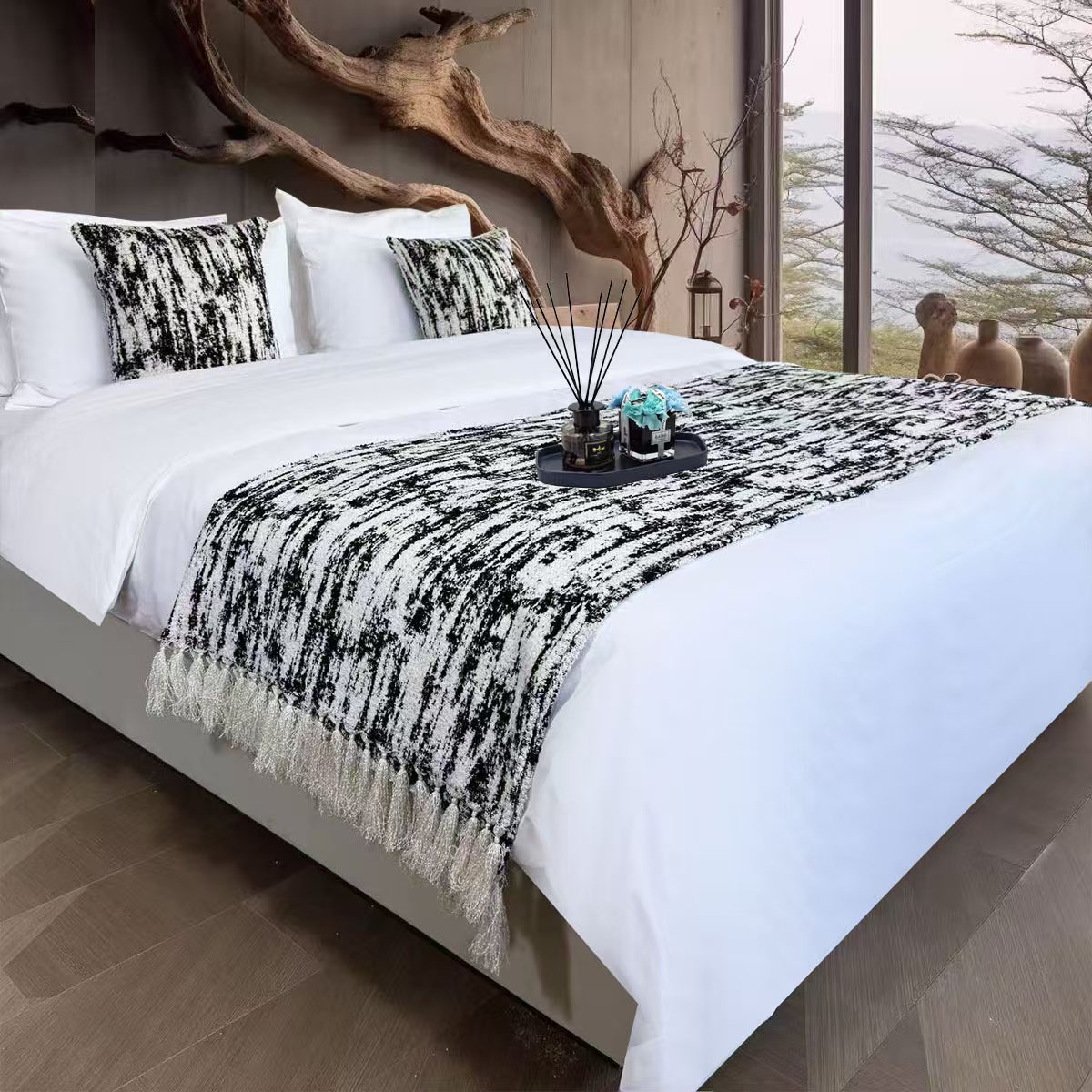 安力森/诚臻酒店用品 2025新款轻奢毛绒卡其色床尾巾高级酒店床旗简约诧寂风搭巾民宿床尾毯搭毯 轻奢抽象刷纹浅咖