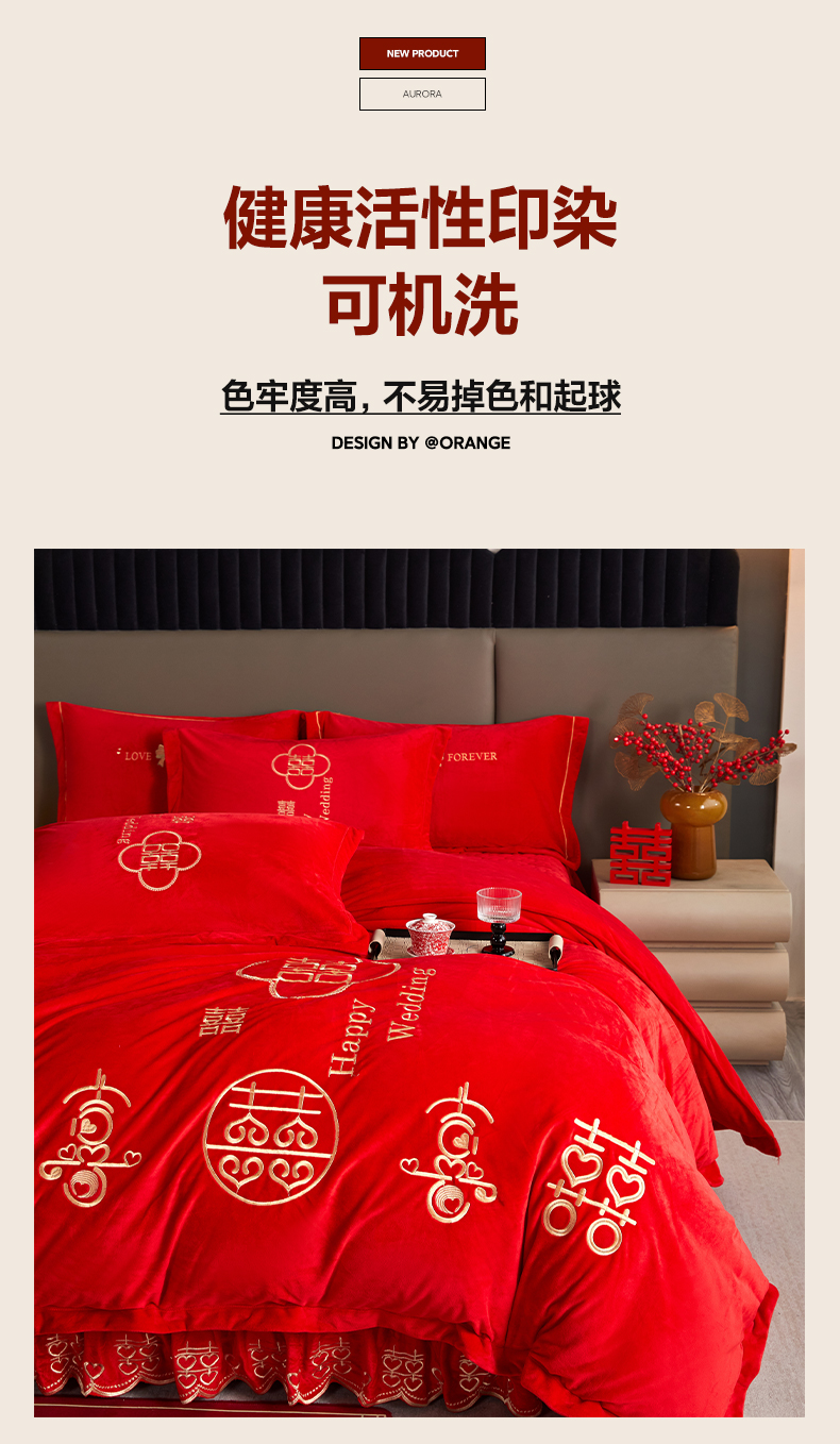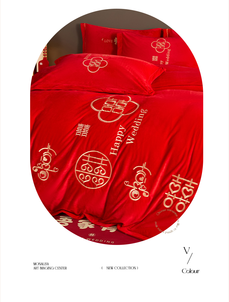 默忆 2025新款婴儿绒刺绣婚庆四件套 喜气连连