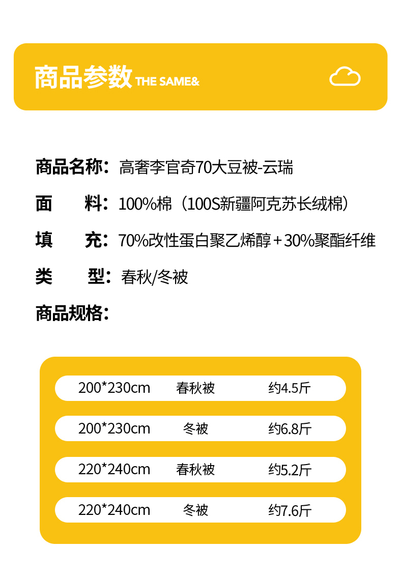 商品名称:(总)丽笙被芯 高奢李官奇70大豆被子被芯-云瑞