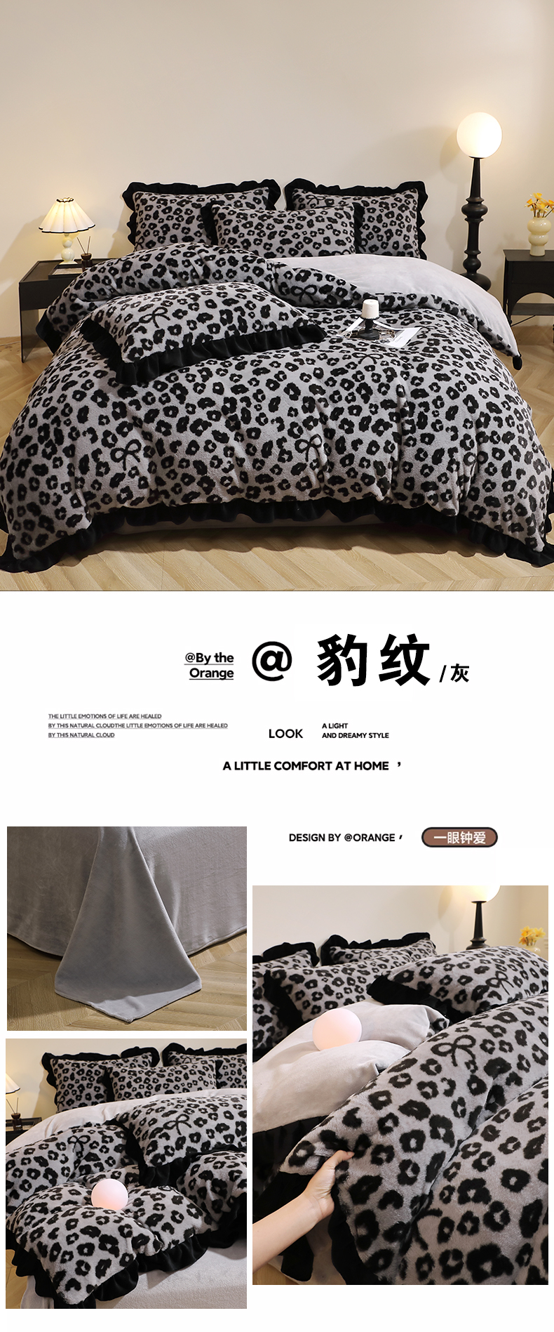 席之家 2025新款韩版黑色花边美拉德系加厚皮草兔毛绒四件套 豹纹 灰
