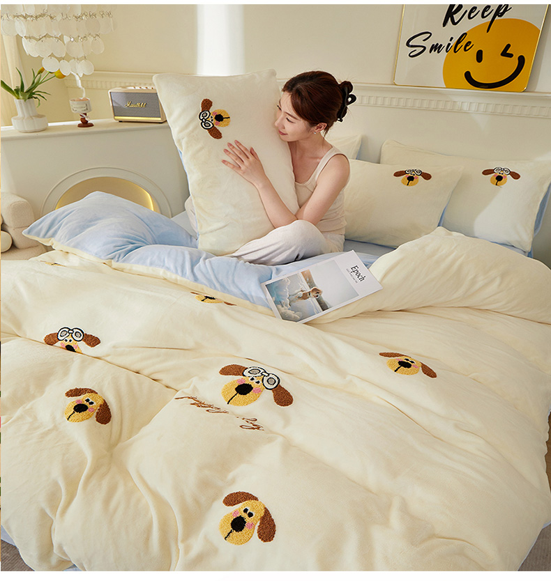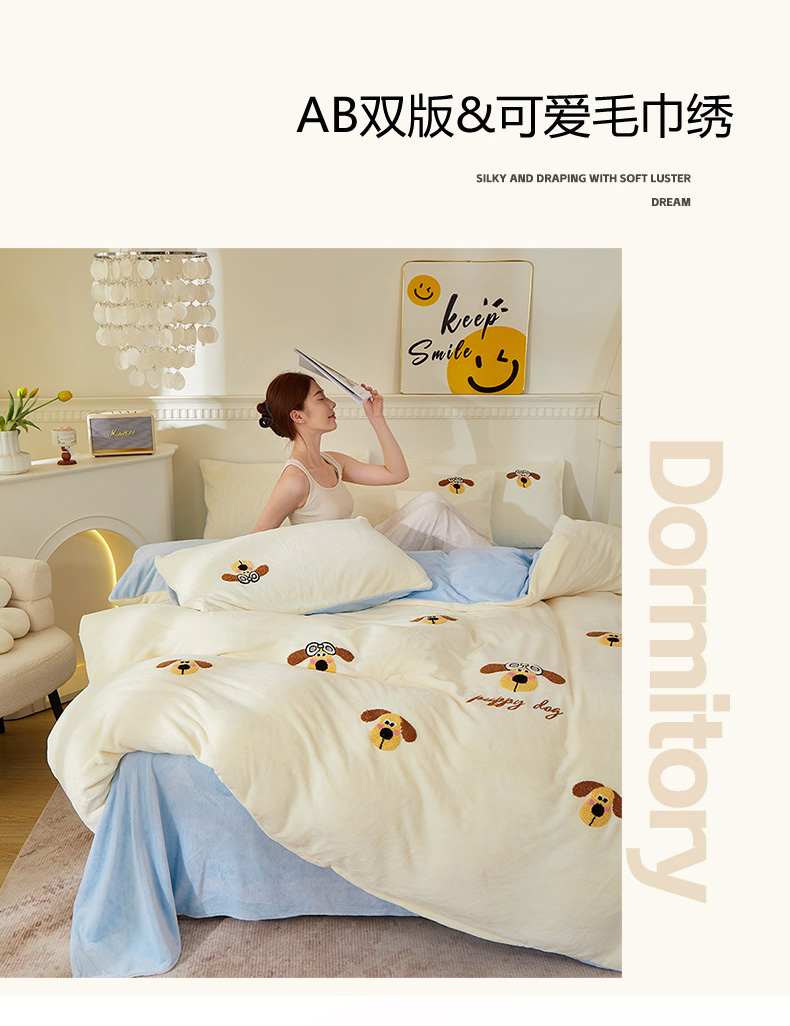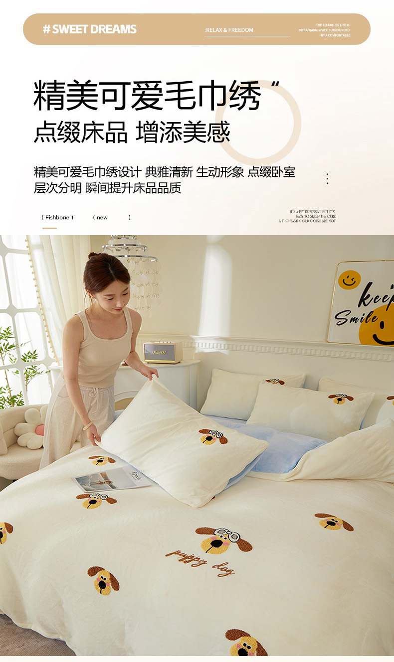 (总)楼兰公主毛毯专供 2025新款高克重230g牛奶绒数码印花毛巾绣卡通四件套,布拉拉,腊肠狗,奶油熊,淘气狗,小粉猫,小男孩,小苹果,小企鹅