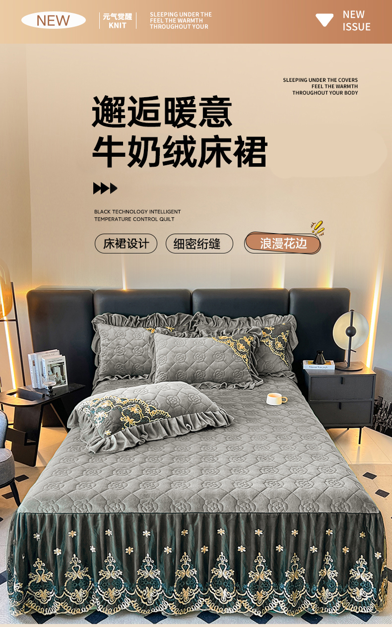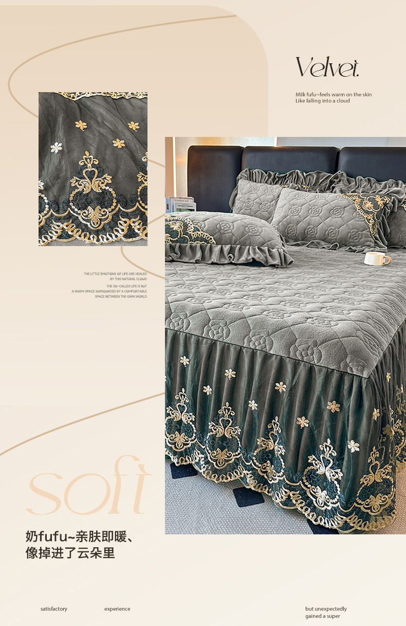 • 91家纺网 家纺一手货源 找家纺 罗艺轩 2025新款牛奶绒浪漫花边床裙款三件套-暖洋洋 暖洋洋-灰