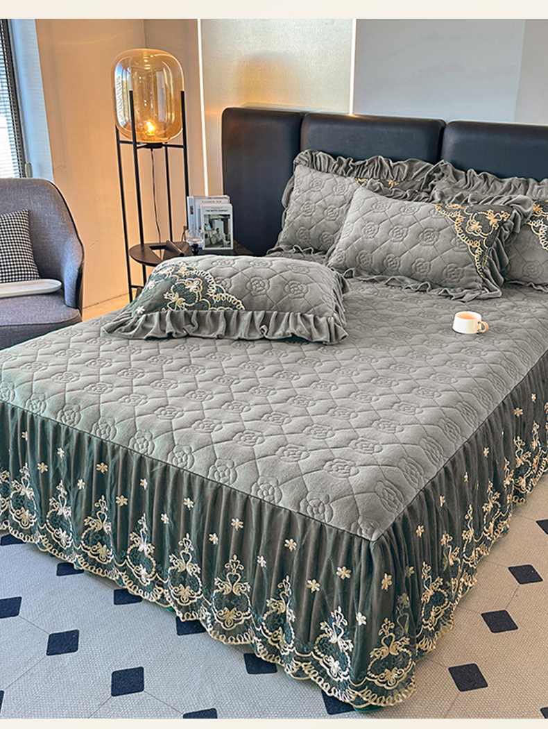 罗艺轩 2025新款牛奶绒浪漫花边床裙款三件套-暖洋洋 暖洋洋-灰