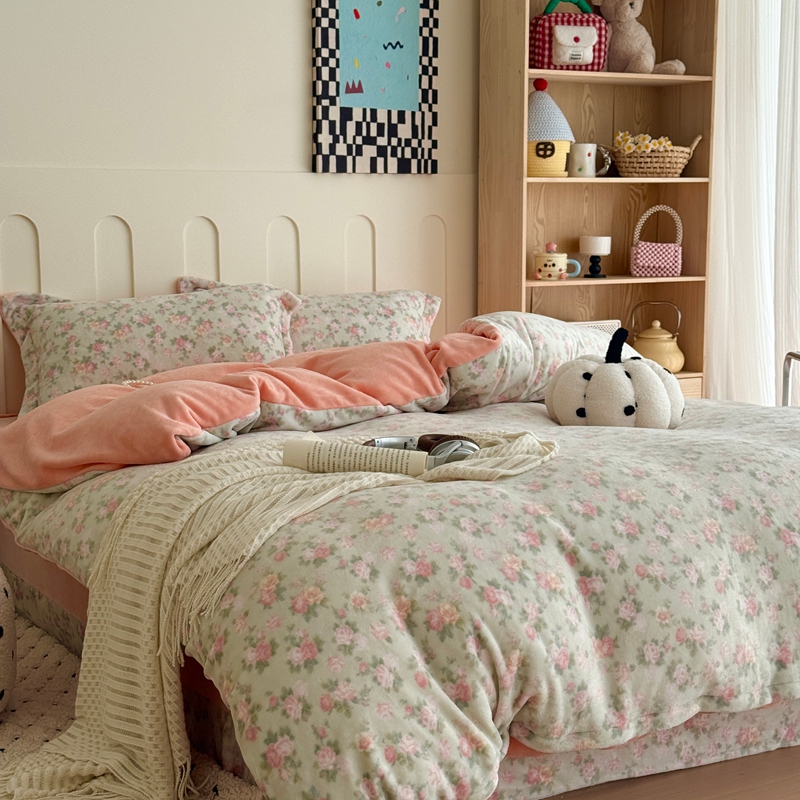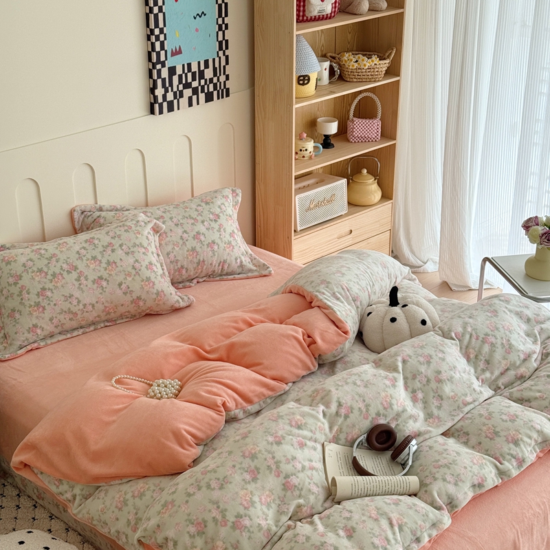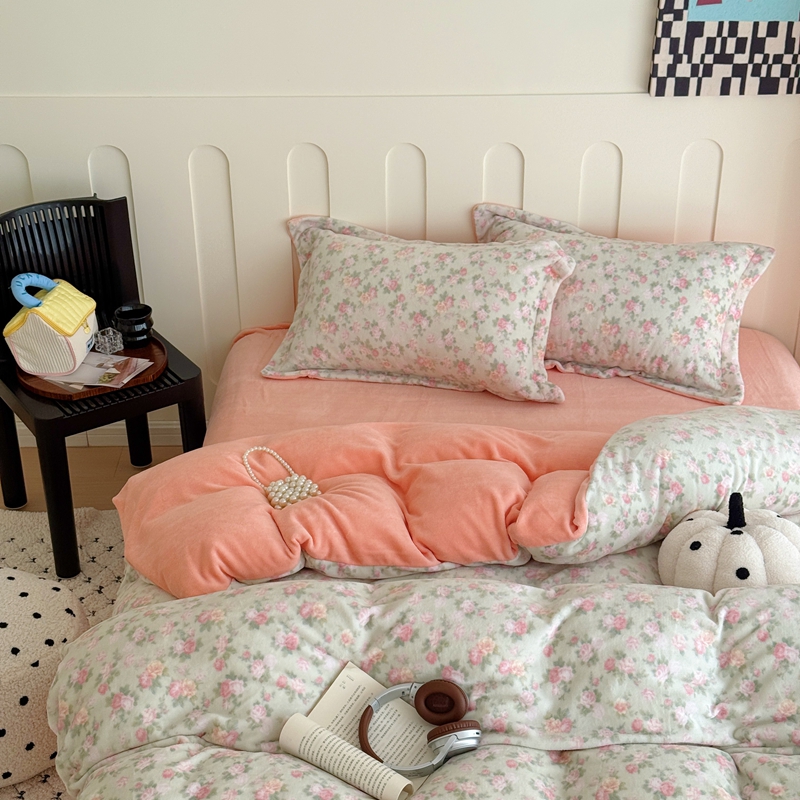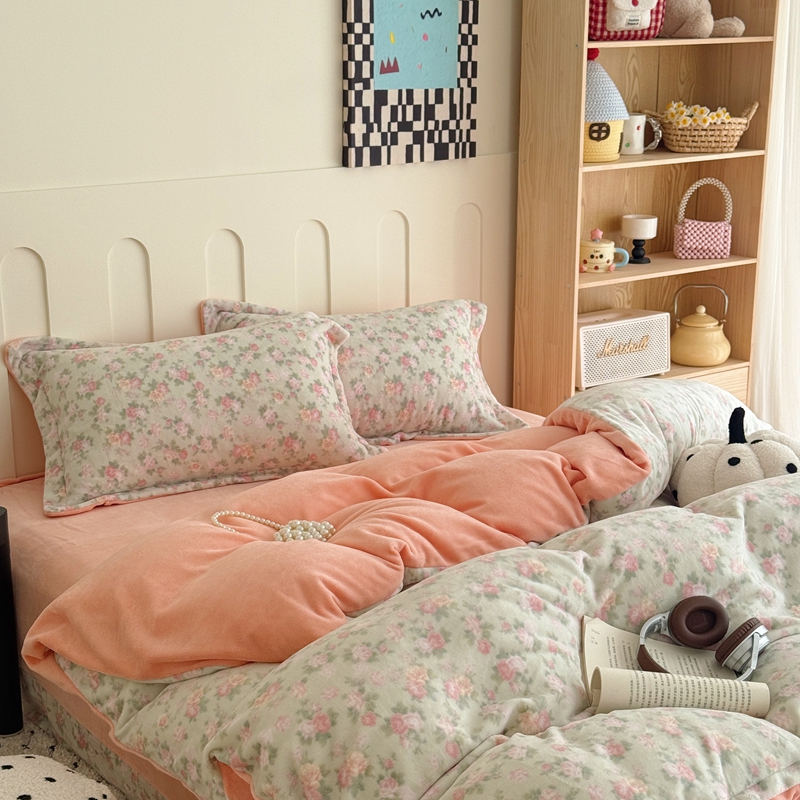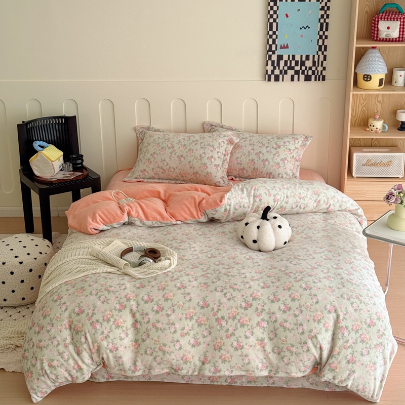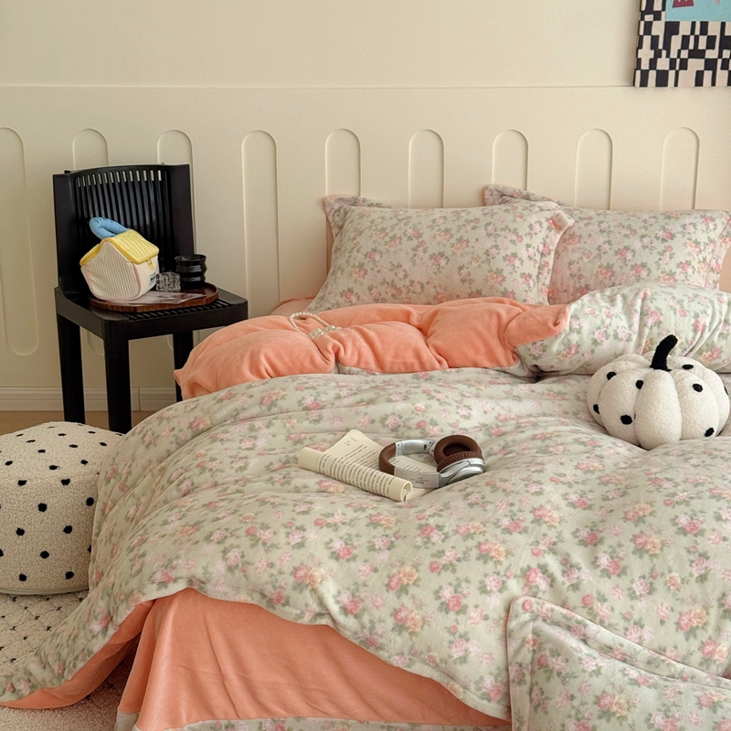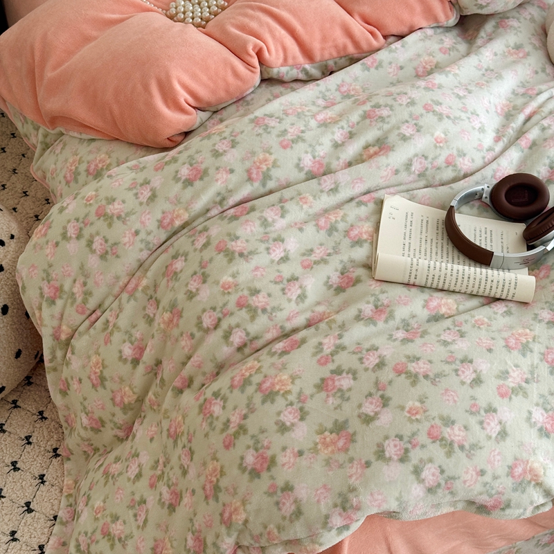 于果 2025新款牛奶绒印花四件套 温馨花语-绿