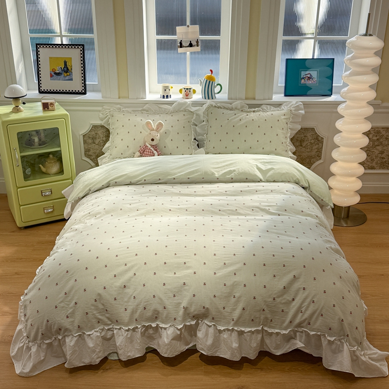 (总)觅糖家纺 2025新款牛奶绒荷叶边小小系列四件套,小小爱心白,小小樱桃酱