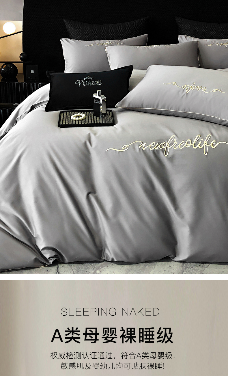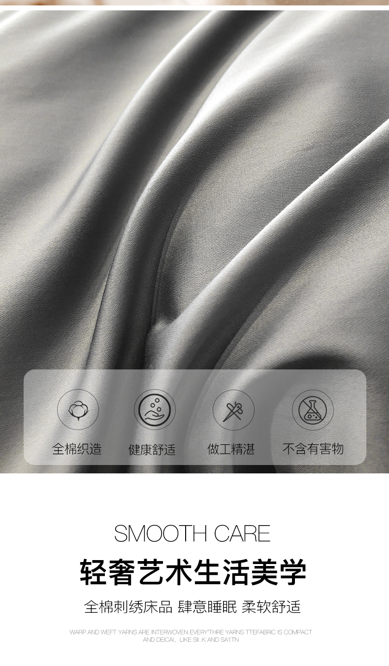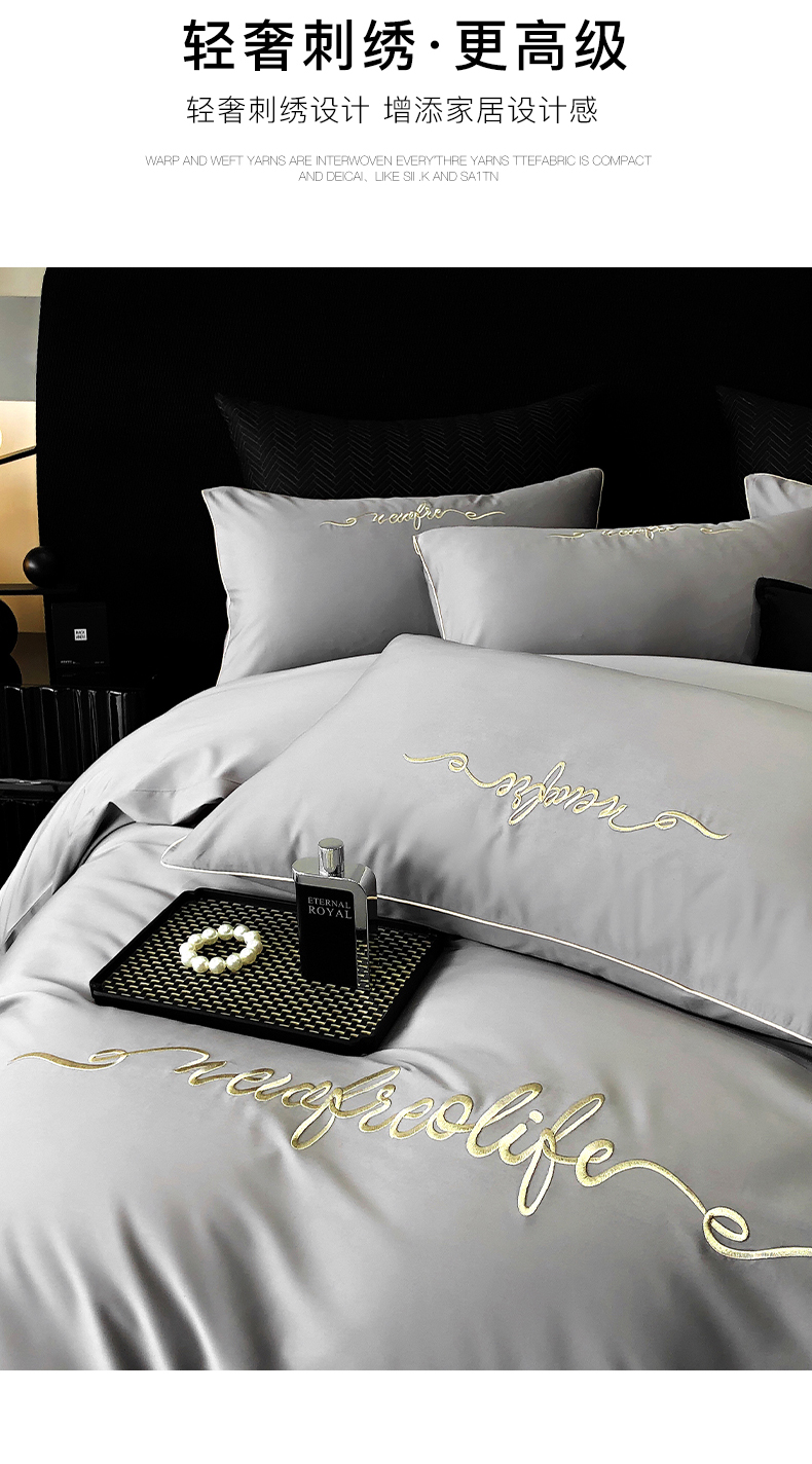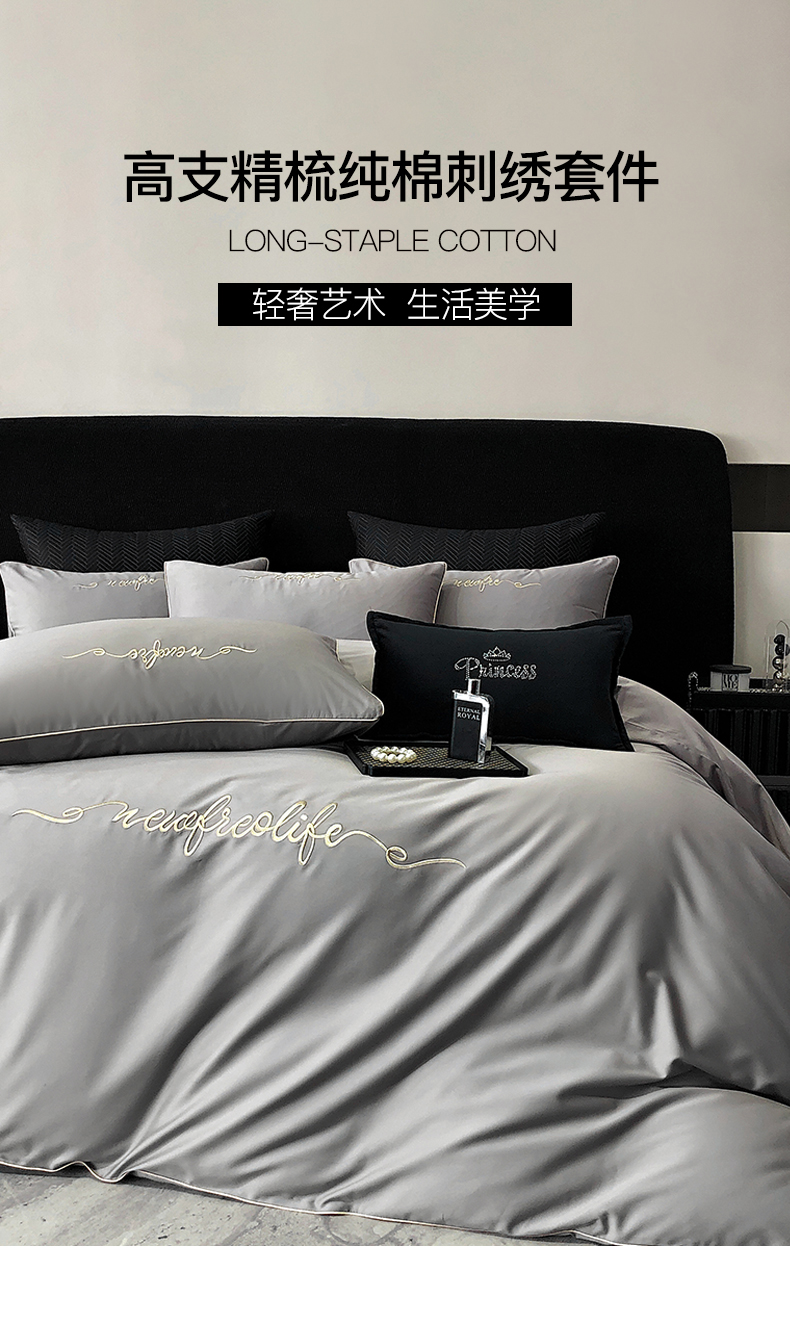 商品名称:禧澜庭 2026新款高支纯棉全棉斜纹四件套刺绣绣花款轻奢三件套--卡罗系列 布鲁灰