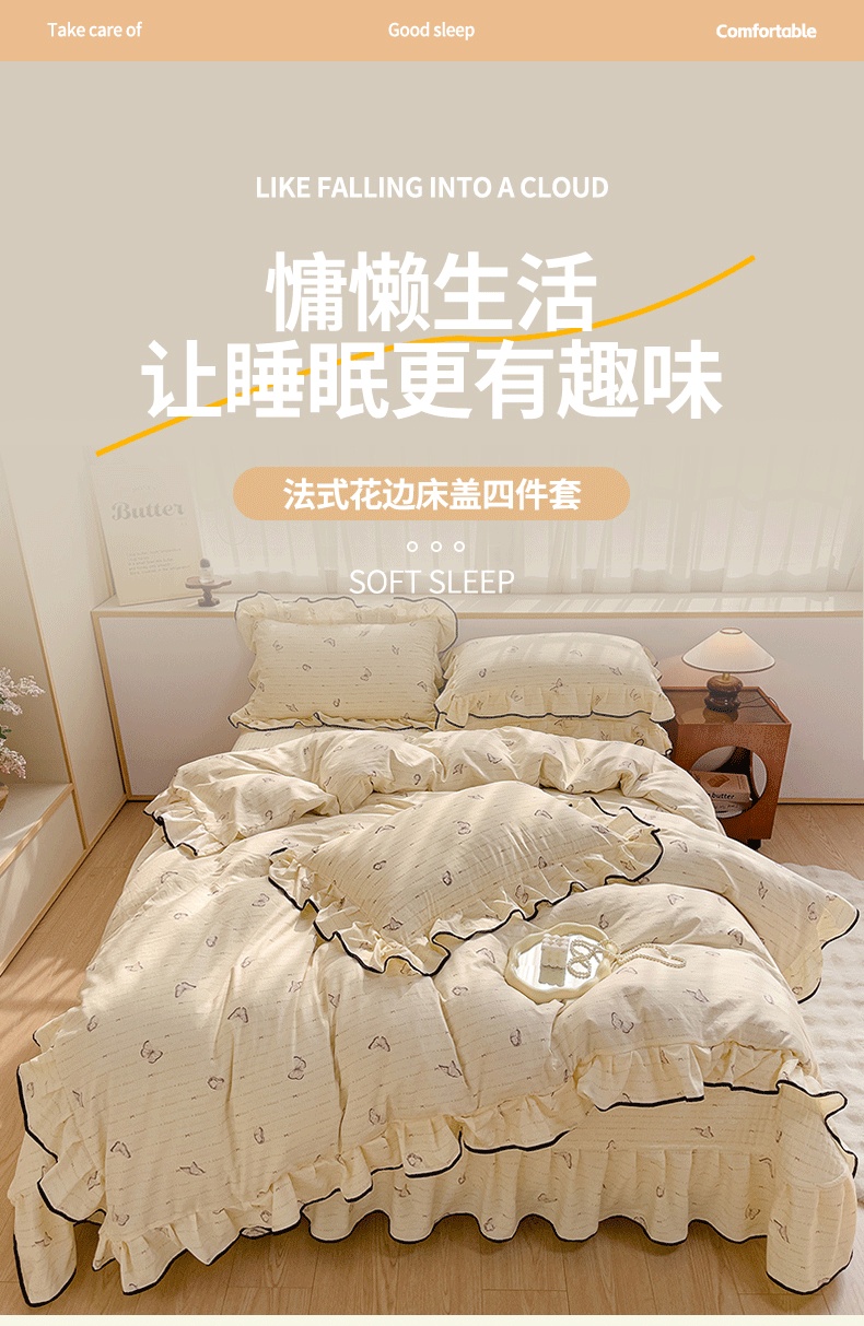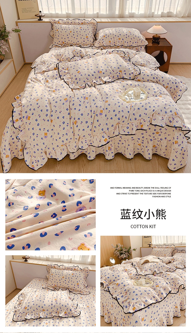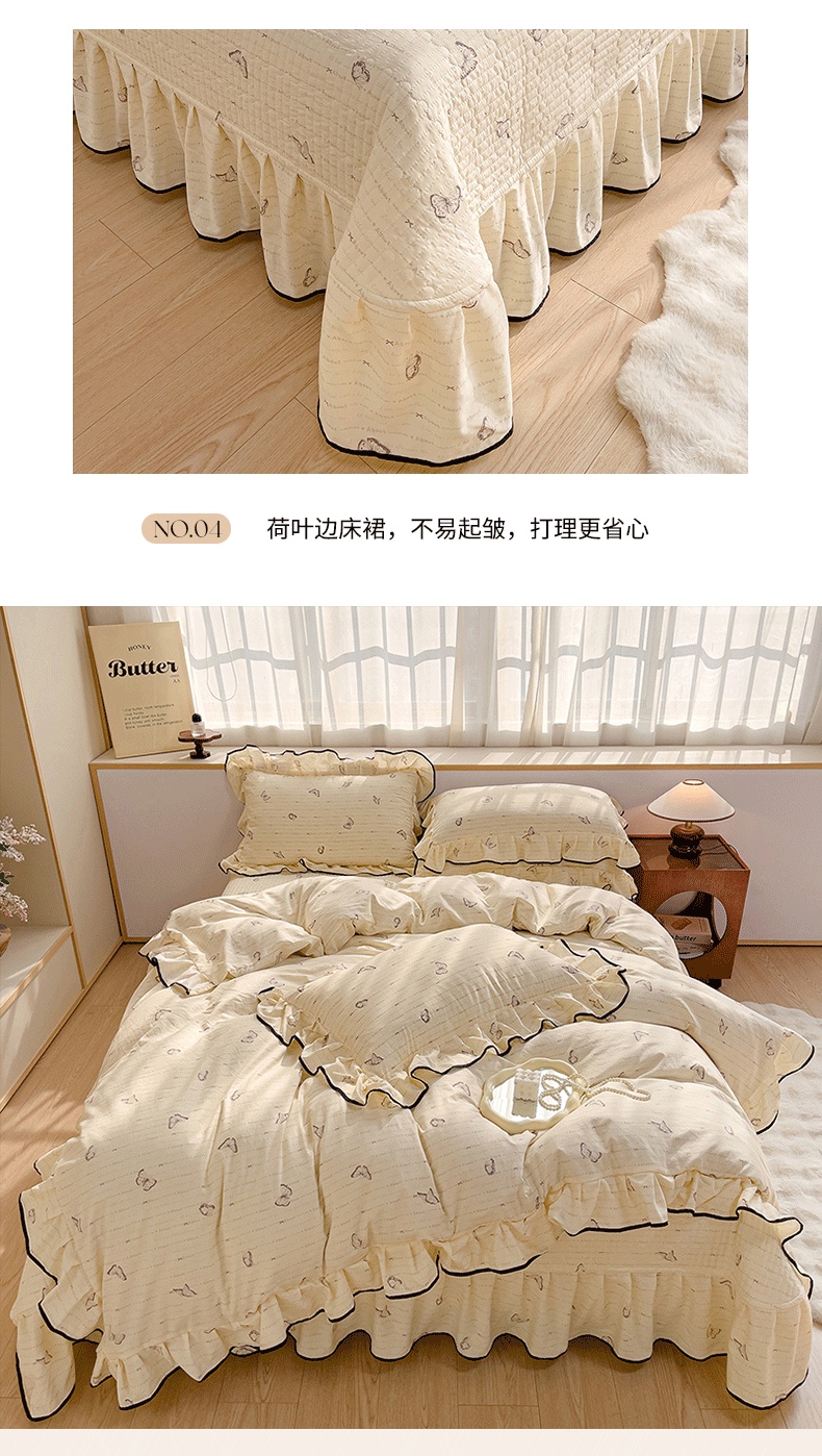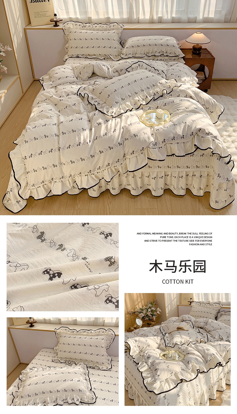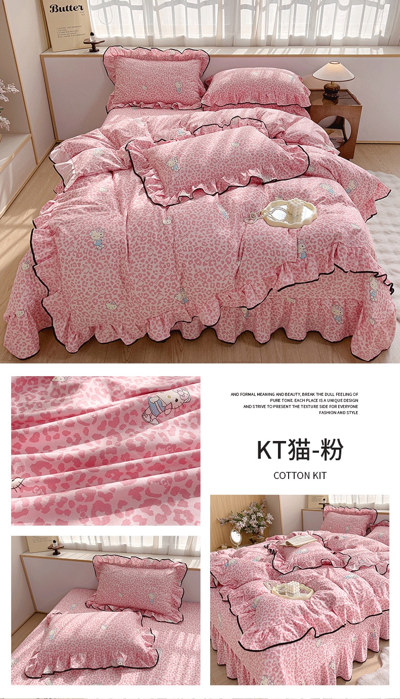 (总)赛丽雅 2026春夏新款古法水洗棉法式花边床盖四件套,KT猫-粉,豹纹猫咪,波点,彩色波点,狗狗家族,花田错,灰蝴蝶,可爱兔,兰黛,蓝纹小熊,漫花蝶舞,木马乐园,暖兔,苹果乐园,七分甜,甜星人