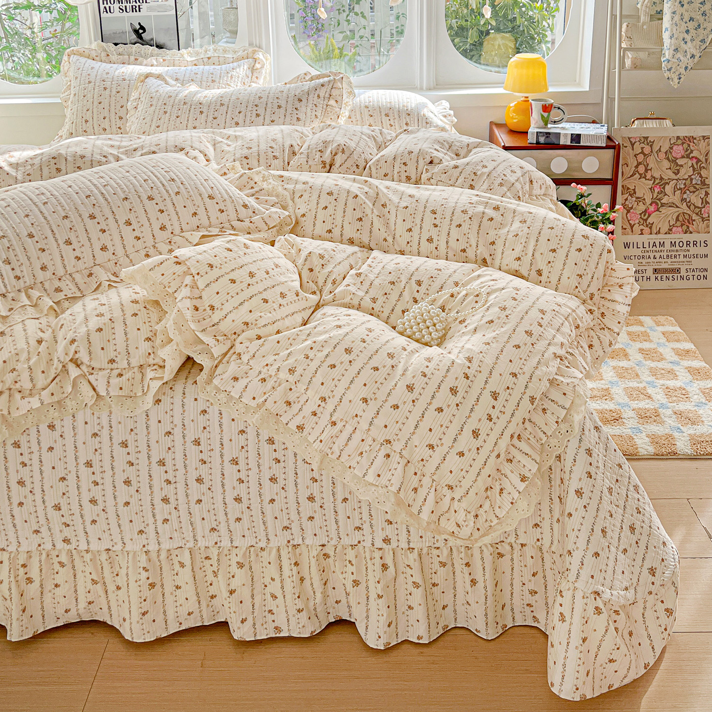 梦莱斯 2026新款小清新可爱风纯棉花边床盖四件套 奶白条纹花