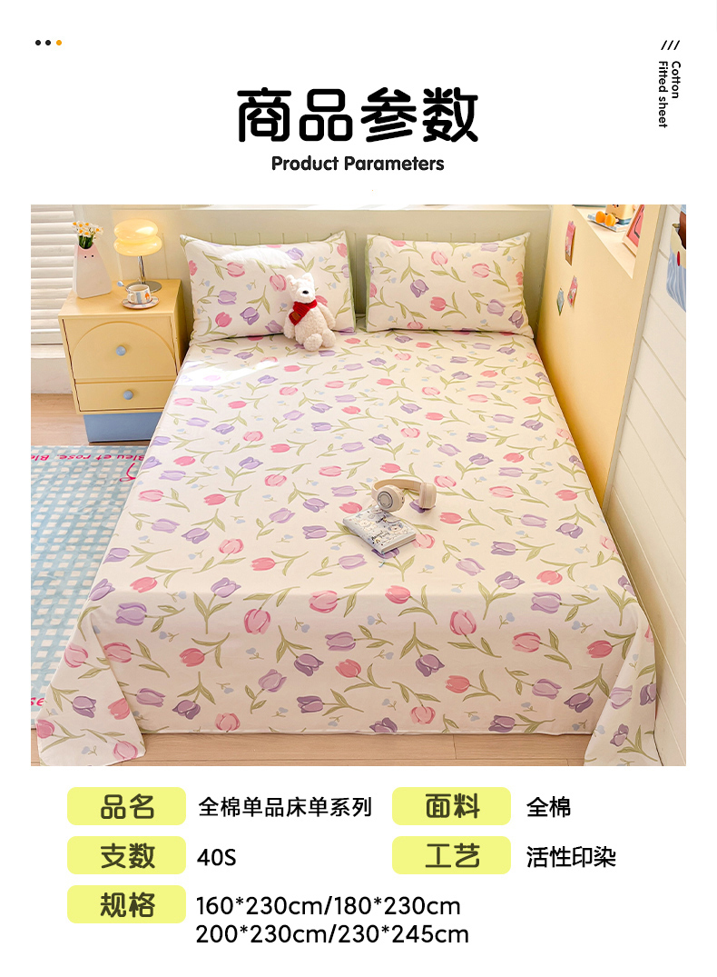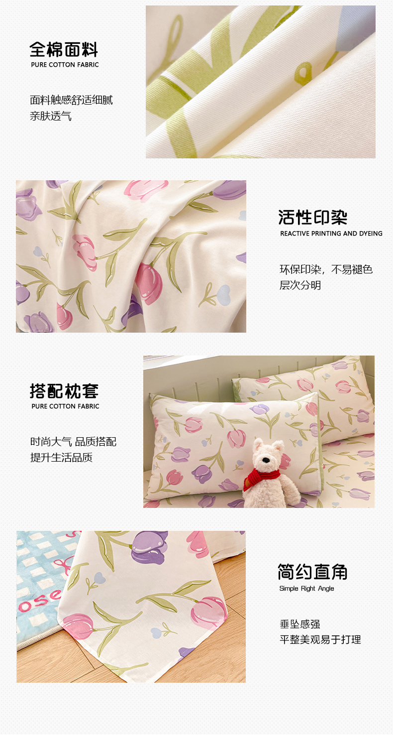 商品名称:瑞莱 2026新款纯棉全棉单品印花卡通床单枕套系列 绽放