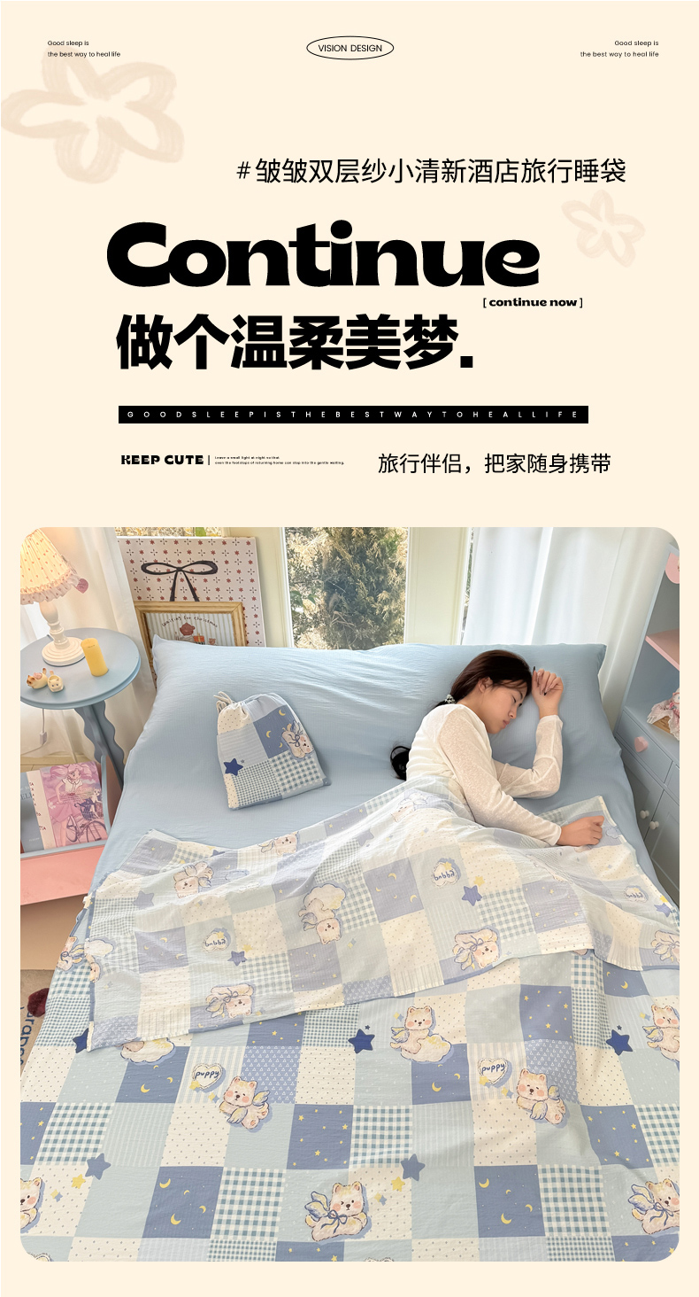 Sweet dreams甜梦 2026新款A类皱皱双层纱小清新酒店一体式旅行睡袋 晚安小熊