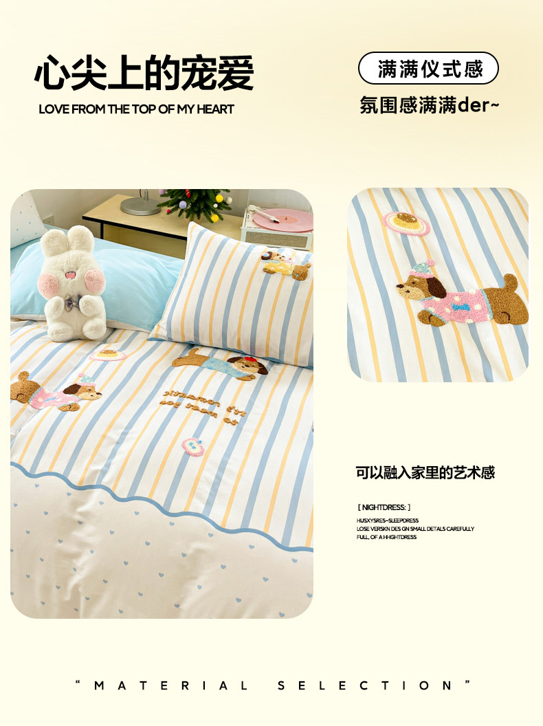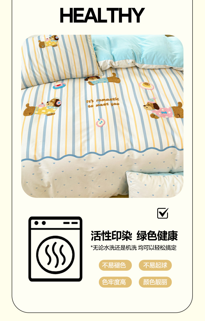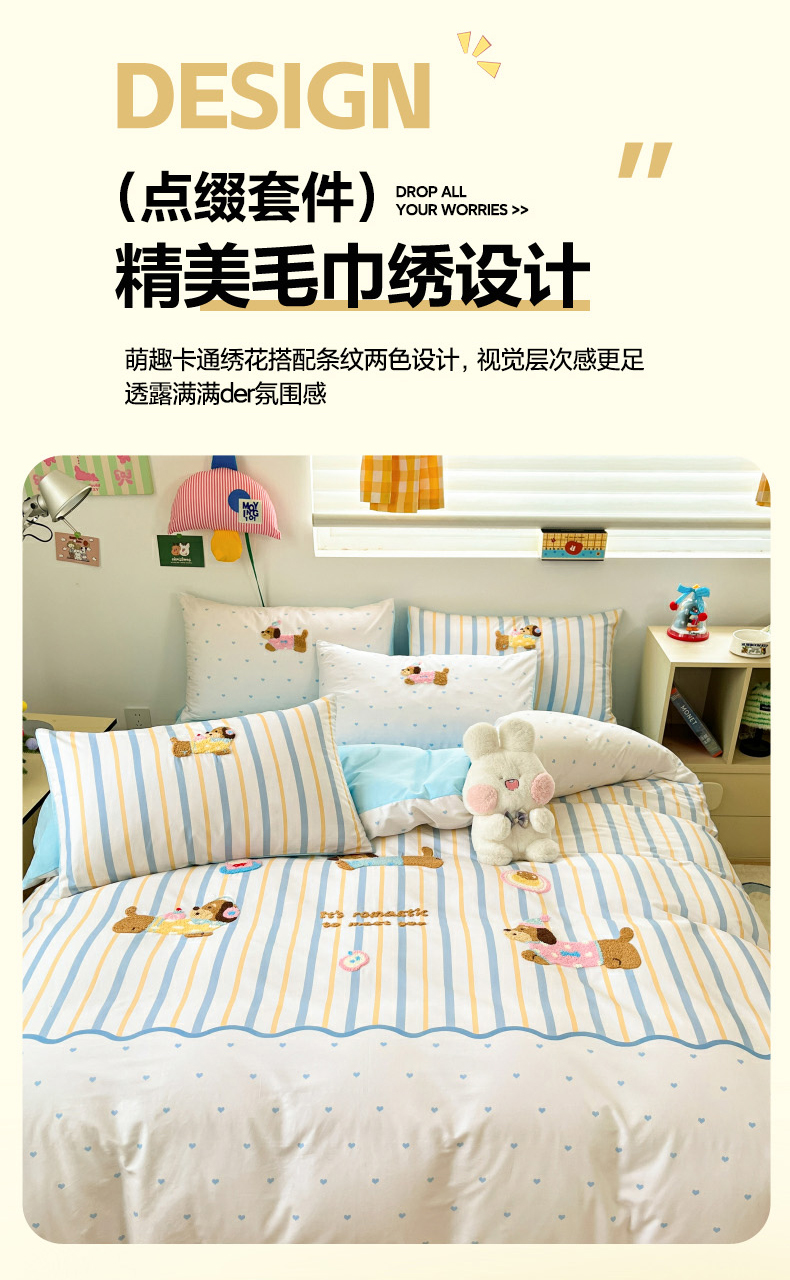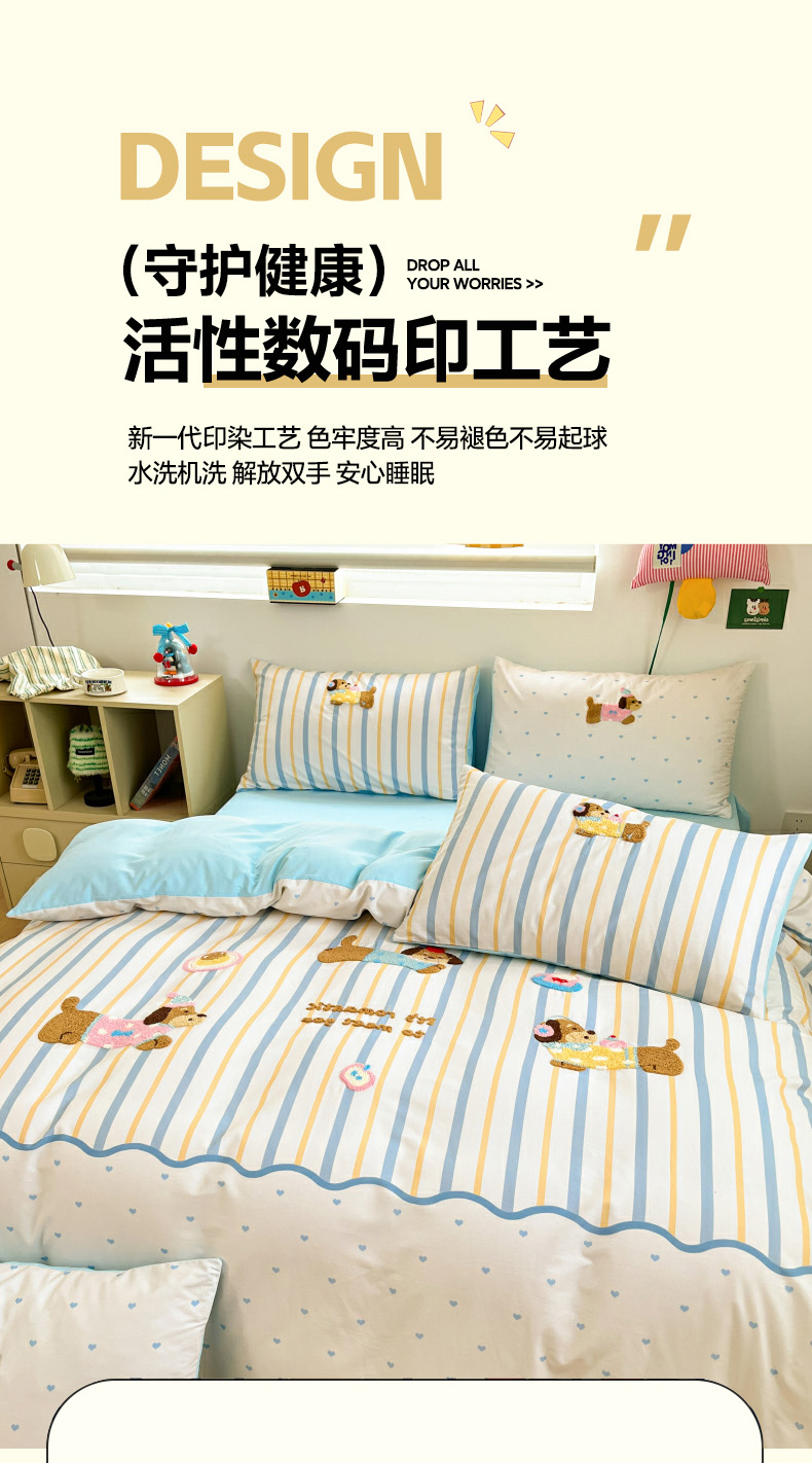 当前位置: 91家纺网 > 商品网购 > 床品套件 > 四件套 > 全棉普通四件套 > 丽涵家纺 2026新款全棉纯棉数码印大版定位毛巾绣四件套 休闲音乐狗