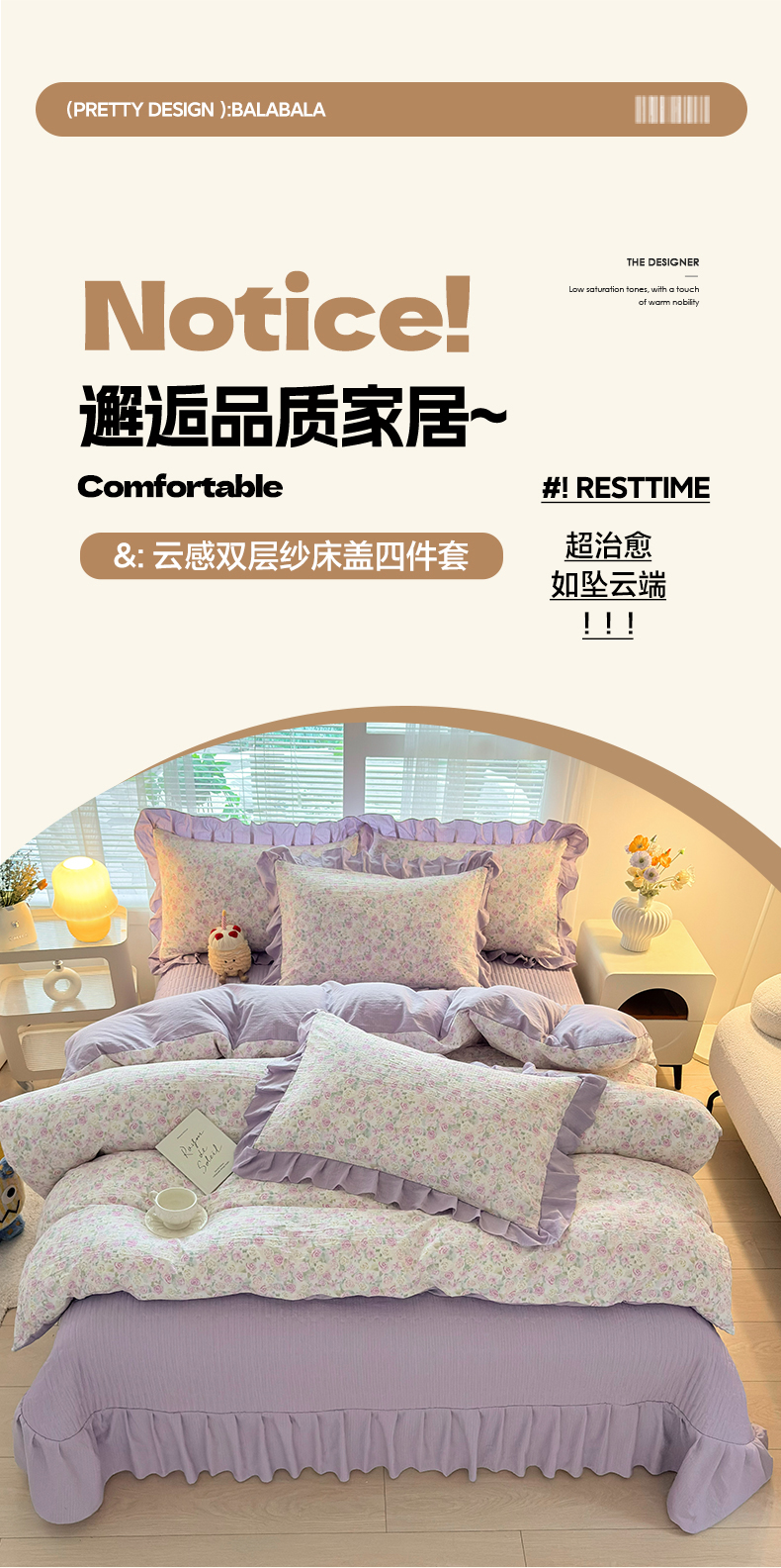 (总)民新家纺 2026新款泡芙双层纱床盖款四件套,鸿运小马,星星人,爱心小马,晨雾花园,乖乖兔,蝴蝶飞舞,蝴蝶结-灰,水彩玫瑰,小雪人-红,小雪人-蓝,心心相印,幸运星,仲夏之梦,紫梦花语,紫薇花开