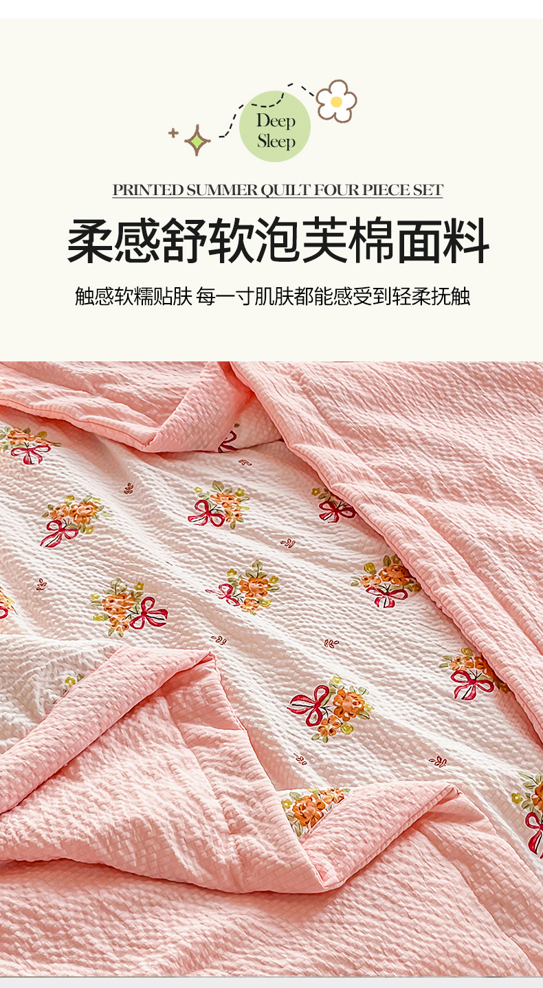 默忆 2026新款A类泡泡棉夏被泡芙棉印花夏被四件套空调被夏凉被 手捧花粉