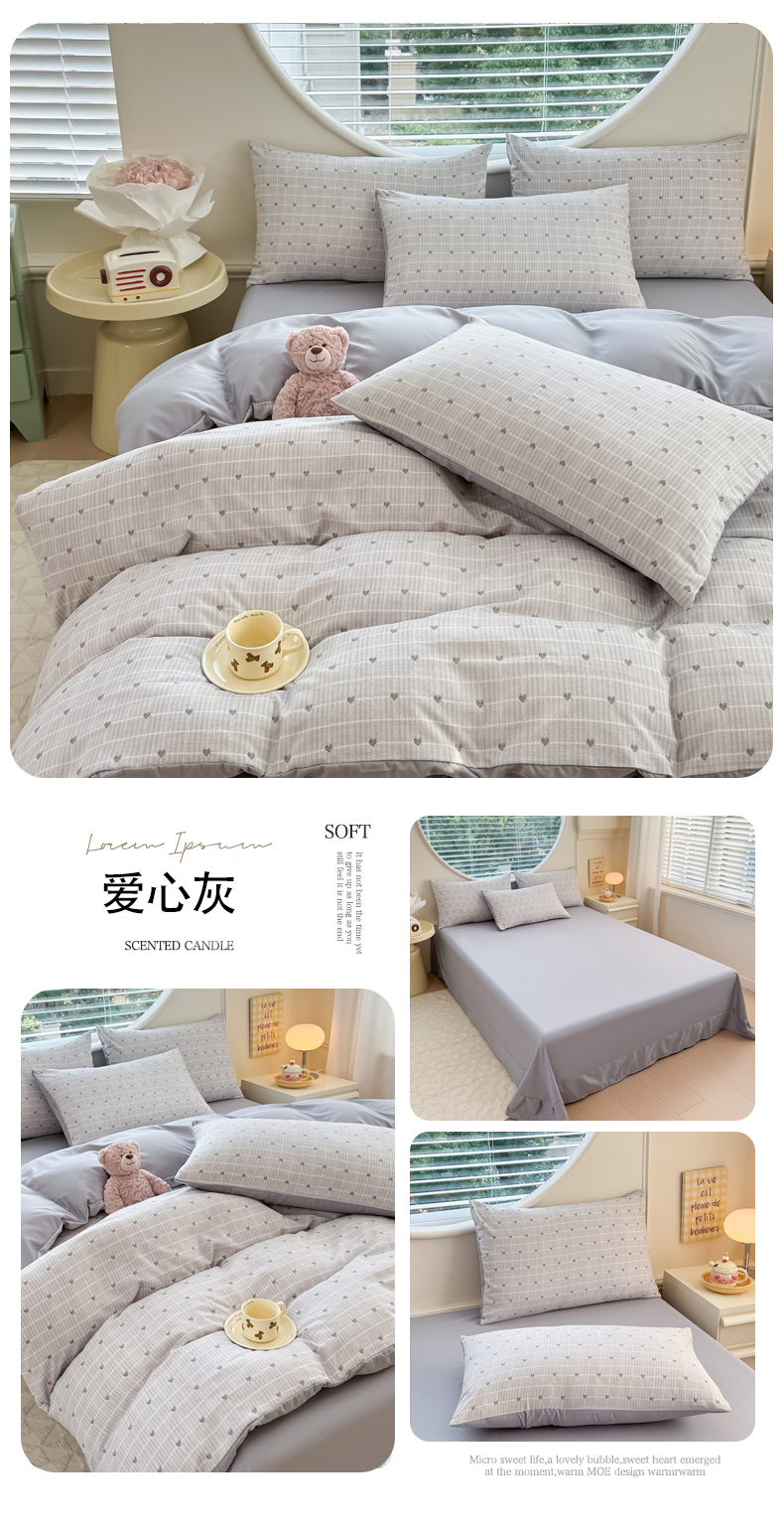 • 91家纺网 家纺一手货源 找家纺 (总)爱多多家居 2026新款双层纱针织棉印花四件套,格子熊,爱心灰,初夏,花丛灰,花丛咖,欢乐颂,玫瑰花园,南瓜派,小豹纹,熊猫绿,郁金香
