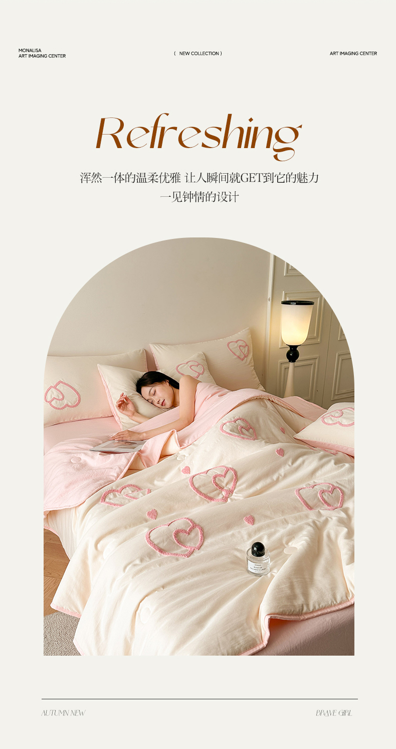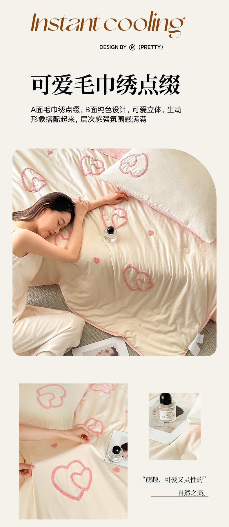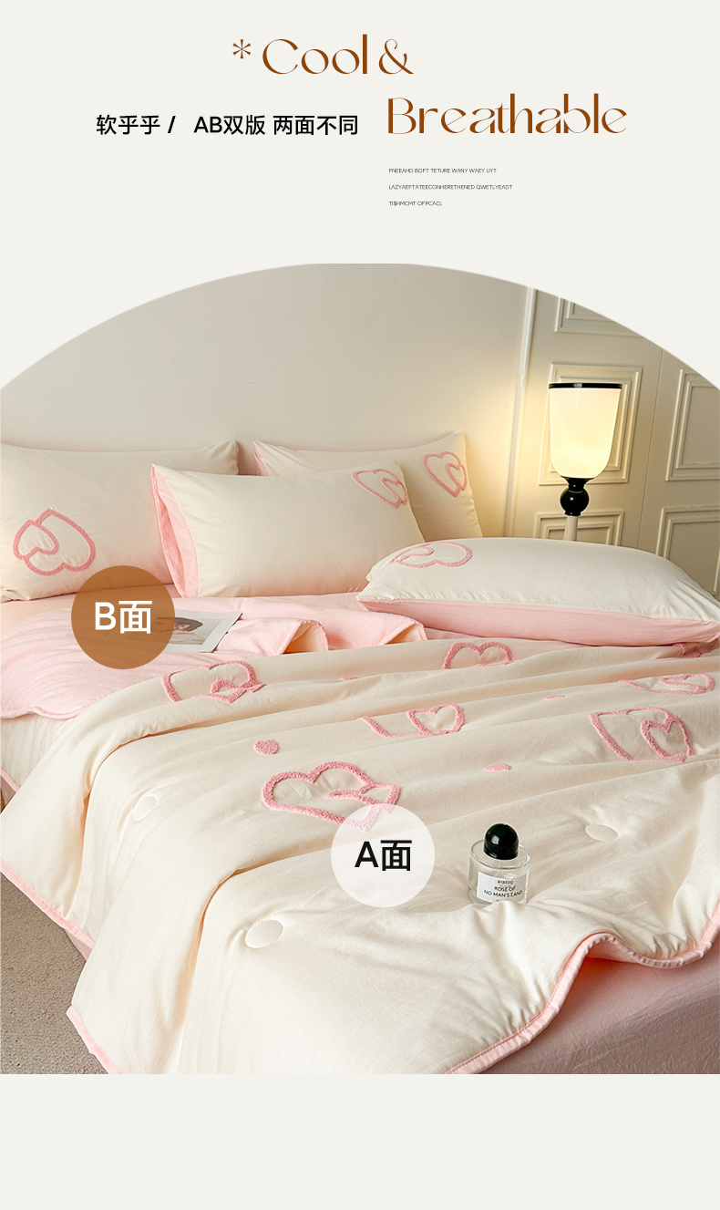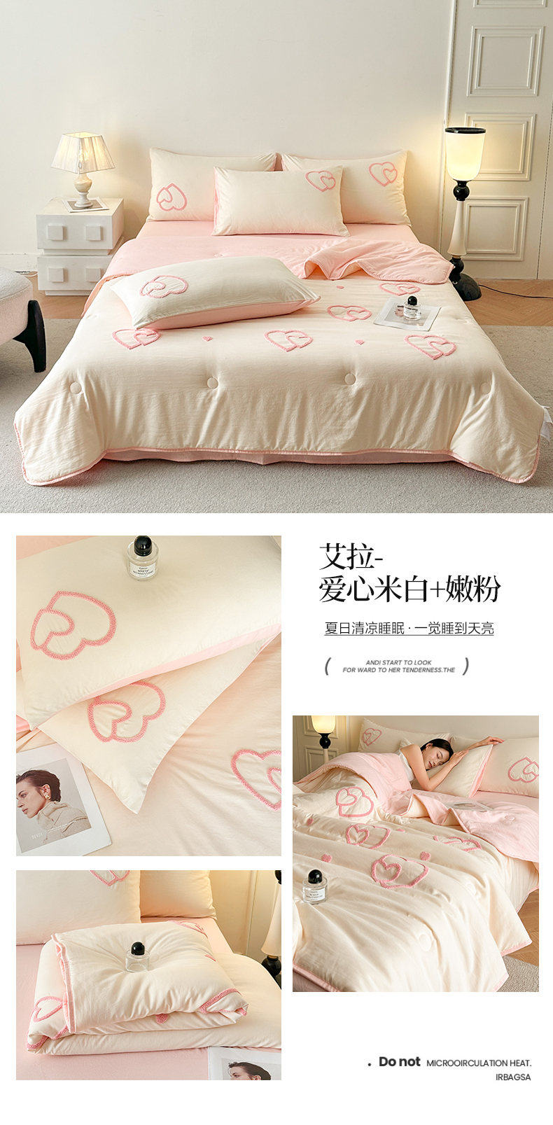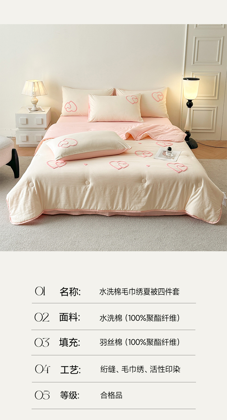 • 91家纺网 家纺一手货源 找家纺 遇见家居生活馆 2026新款水洗棉毛巾绣夏被四件套-艾拉 艾拉-爱心米白+嫩粉