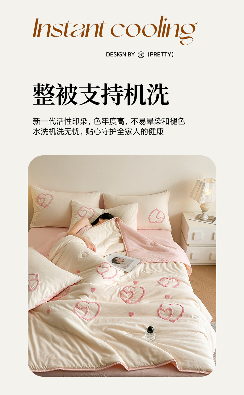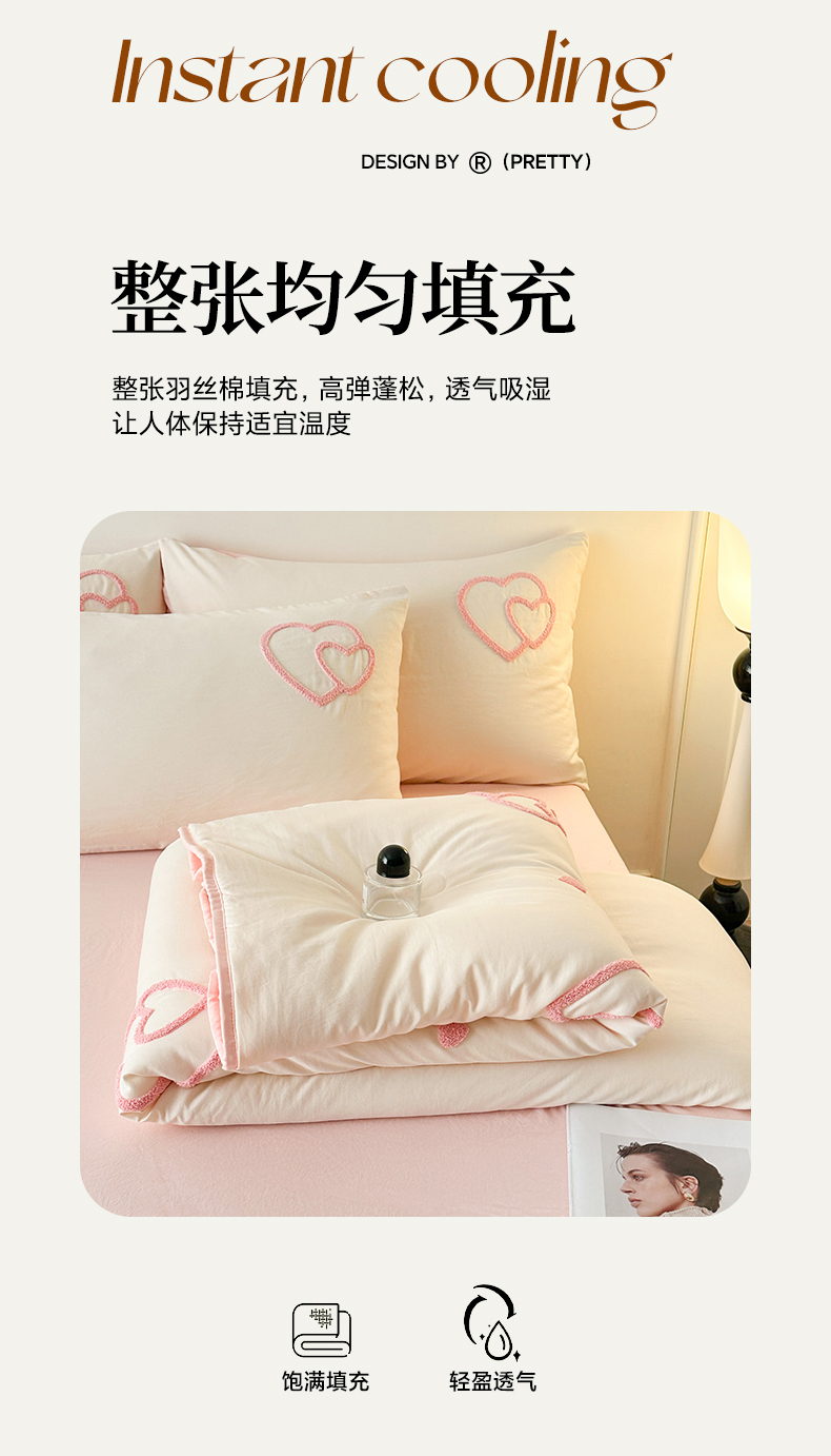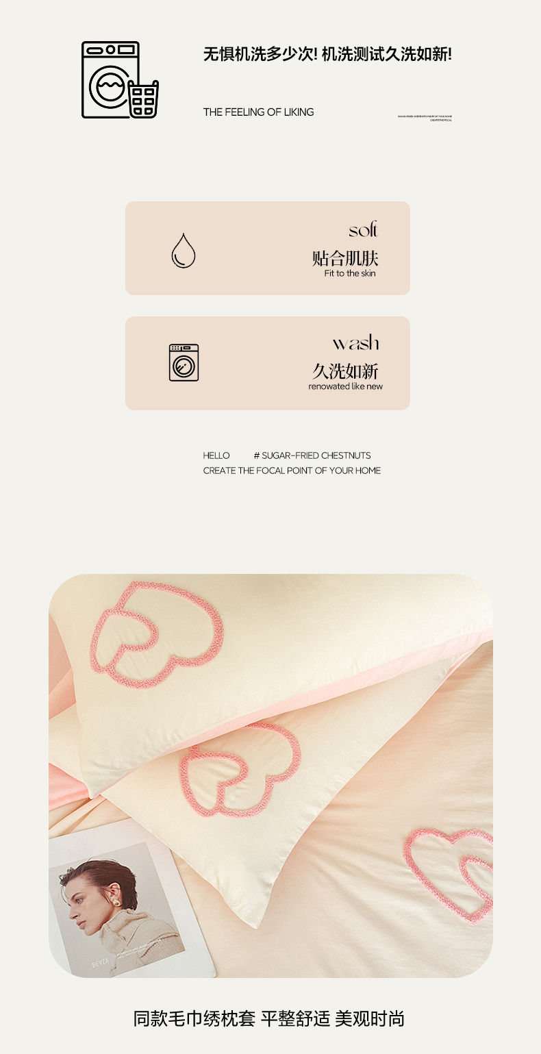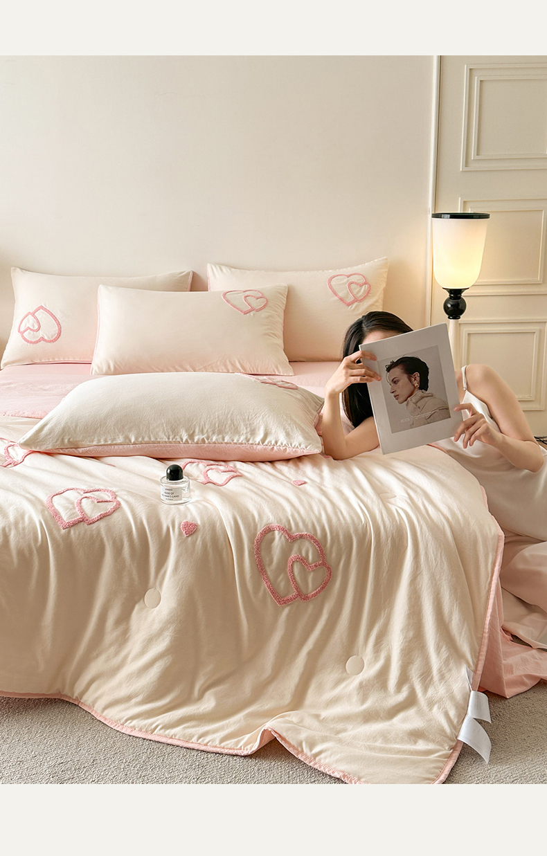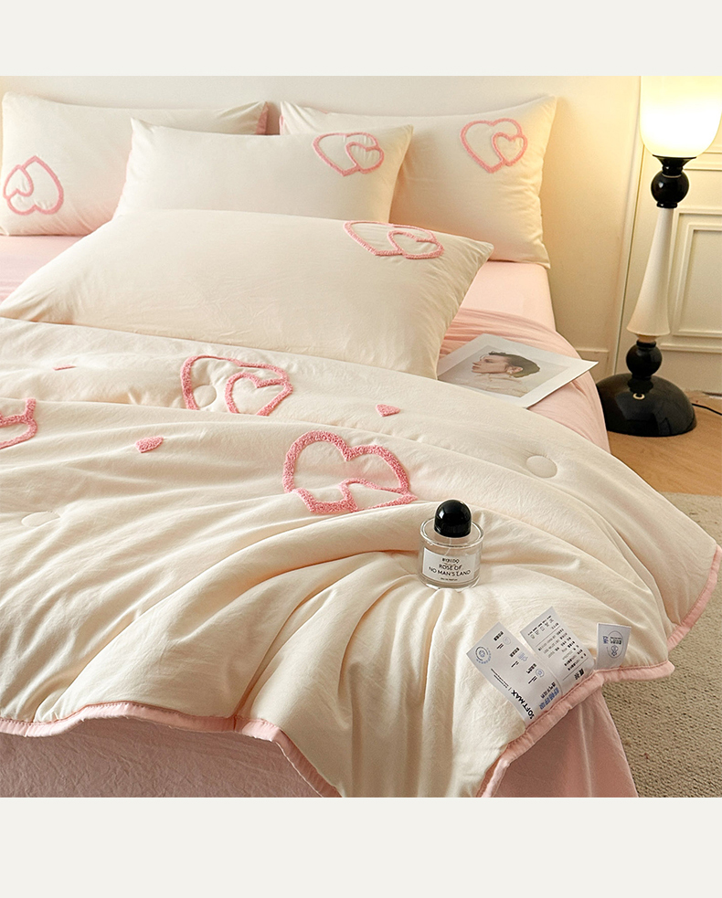 • 91家纺网 家纺一手货源 找家纺 遇见家居生活馆 2026新款水洗棉毛巾绣夏被四件套-艾拉 艾拉-爱心米白+嫩粉