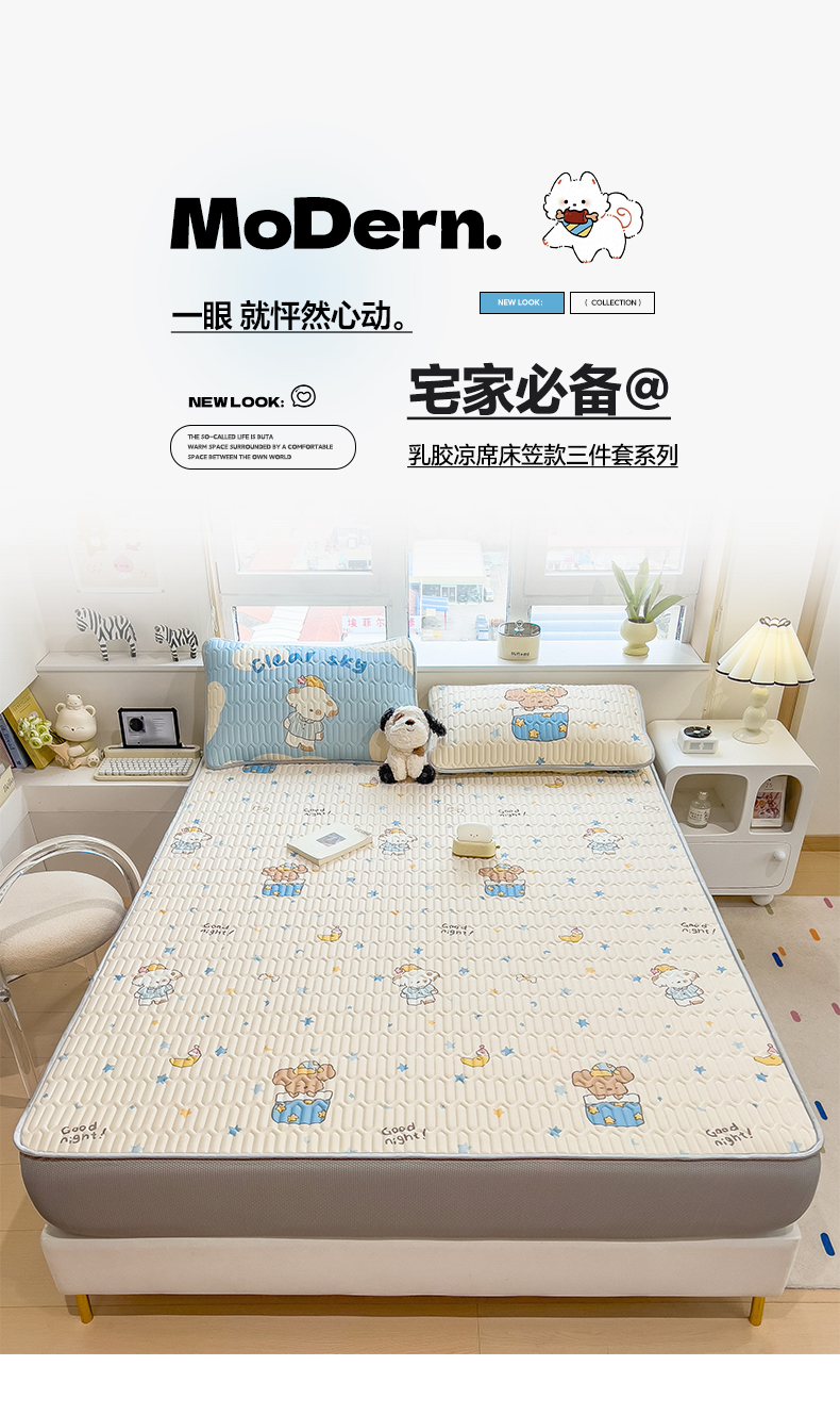 摩妮卡 2026春夏新款凉感丝印花小清新乳胶凉席席子床笠款三件套 萌宠星夜奇遇