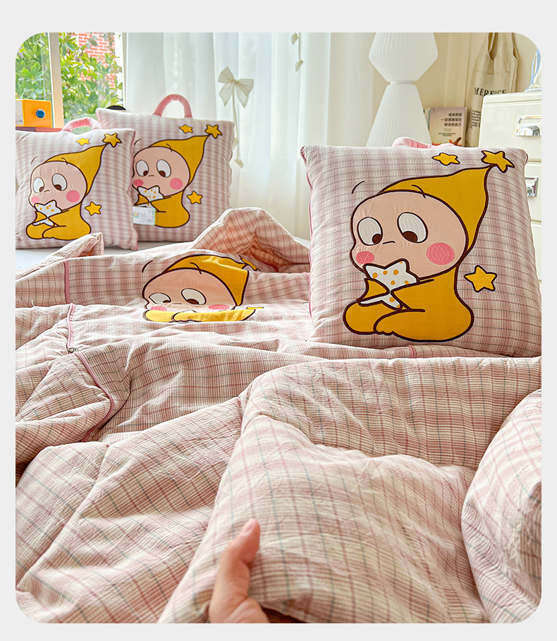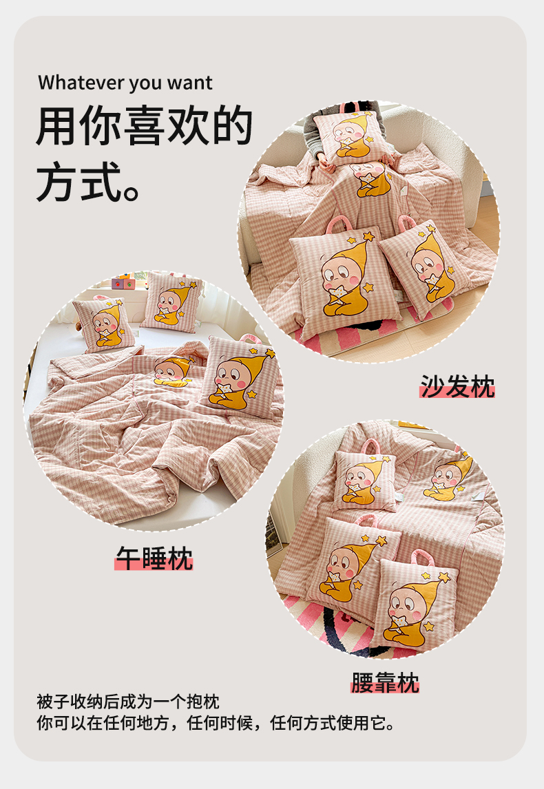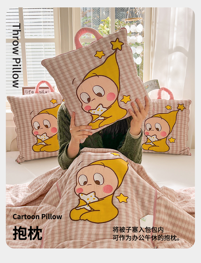 (总)古本家居 2026新款四季款水洗小星人抱枕被,四季小星人绿格,四季小星人粉格,四季小星人黄格,四季小星人蓝格