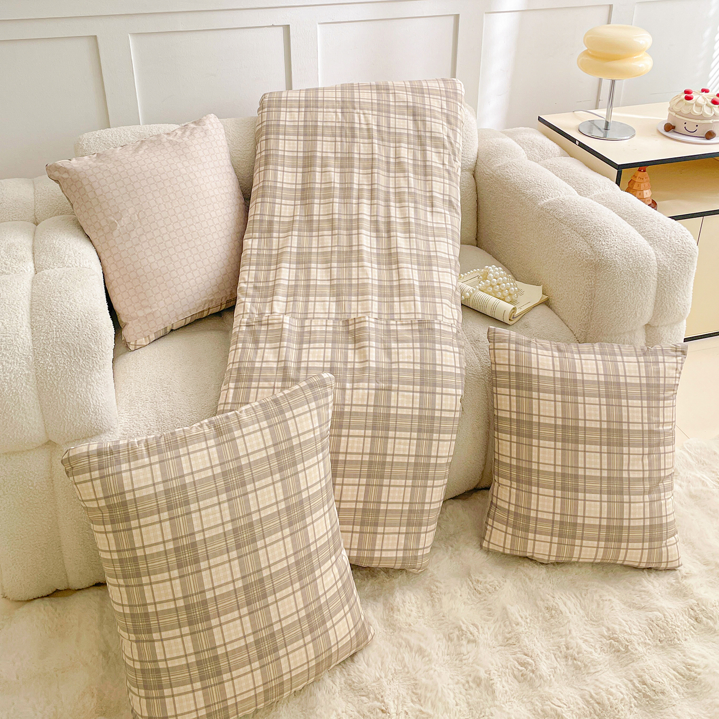 商品名称:多米家居 2025新款全棉口袋印花抱枕被 格韵-咖