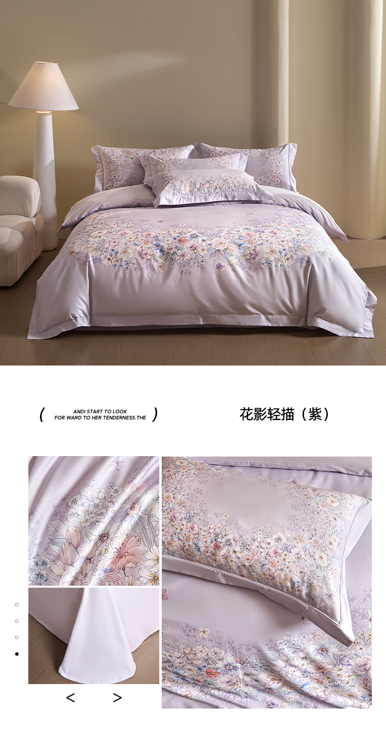 商品名称:U品汇 2026新品纯棉全棉平网大版数码印花四件套高端60支长绒棉贡缎埋绳宽边系列 淡墨春山(紫)
