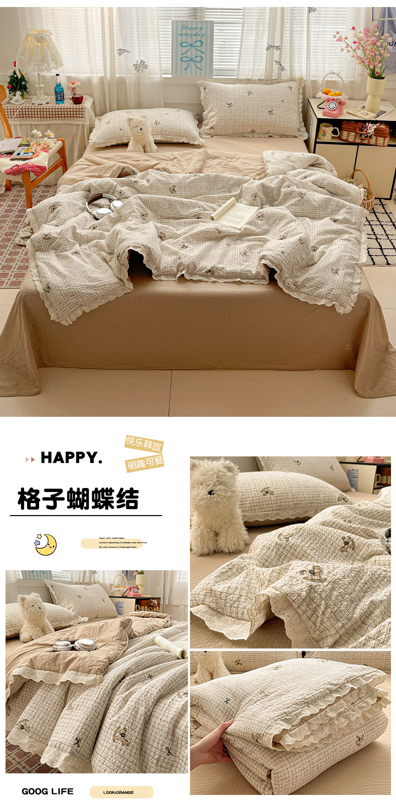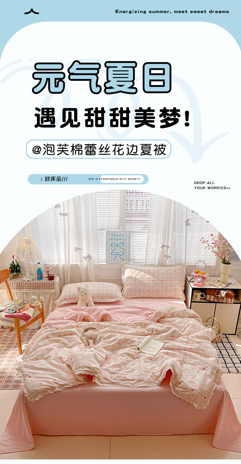 优承佳生活馆 2026新款超柔高克重泡芙纱蝴蝶结全棉花边夏被套件单夏被 组合图