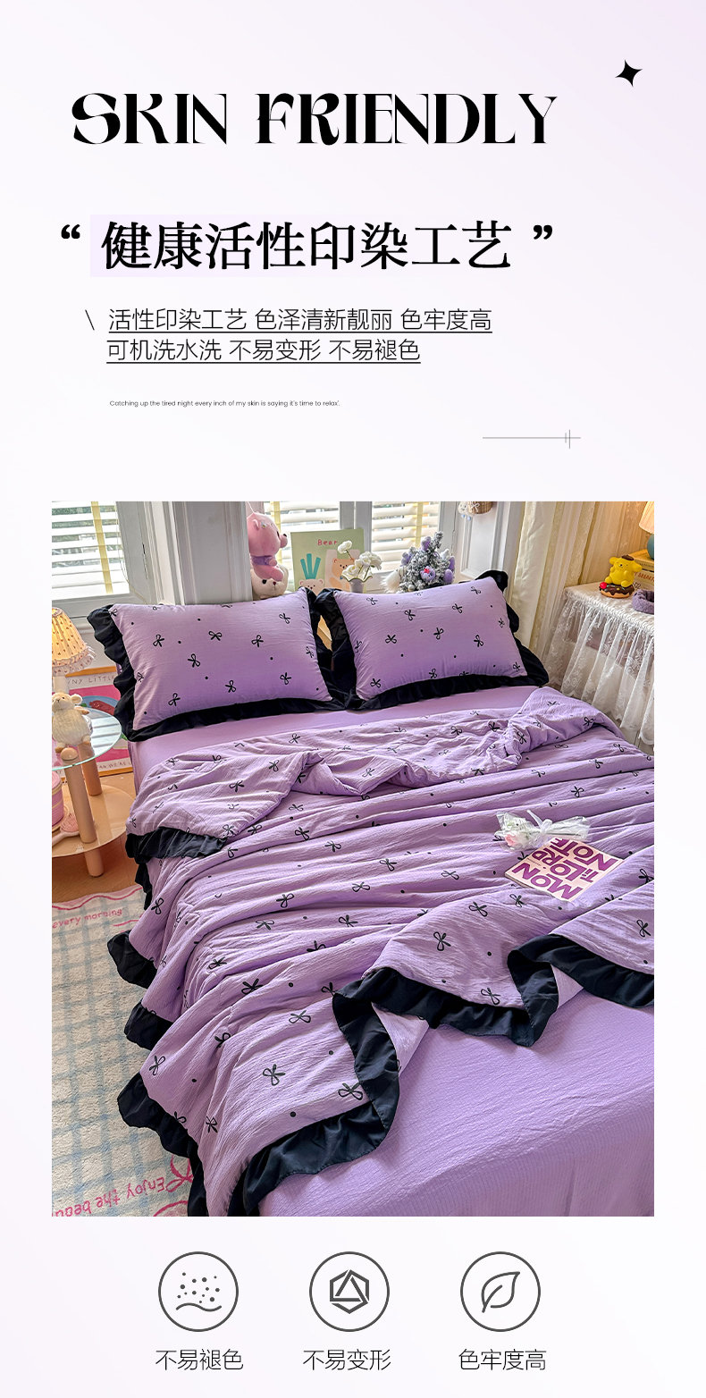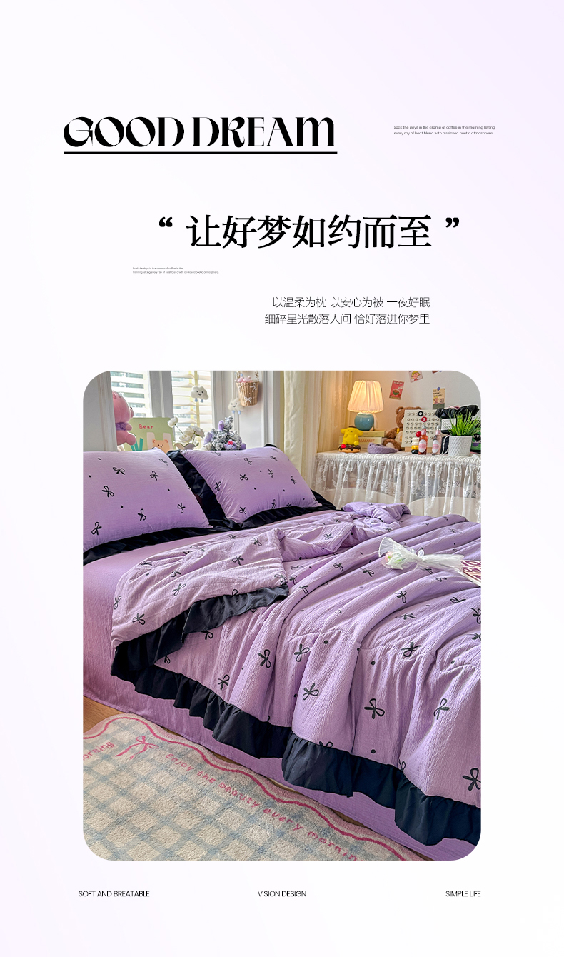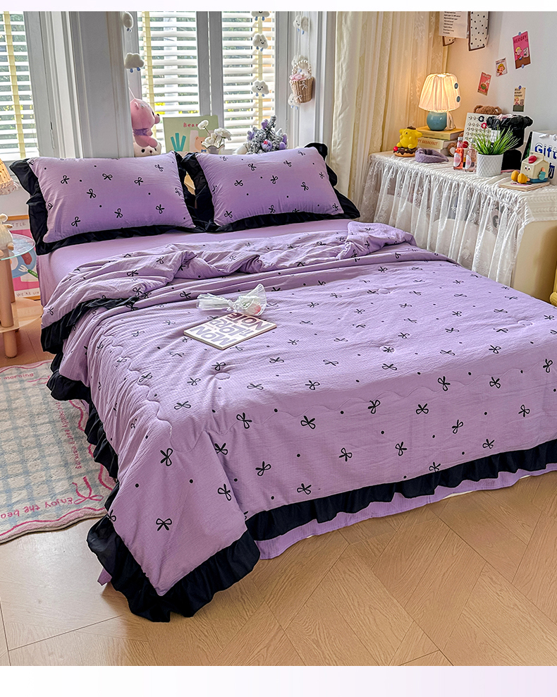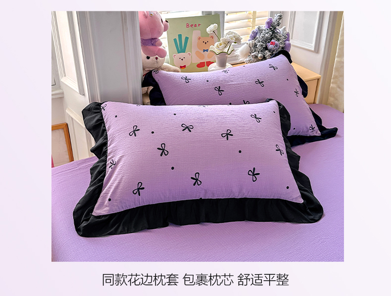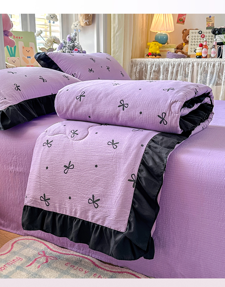 优卡迪家纺馆 2026新款皱皱棉黑花边夏被四件套下载文件包含买家秀 紫苏(花边款)