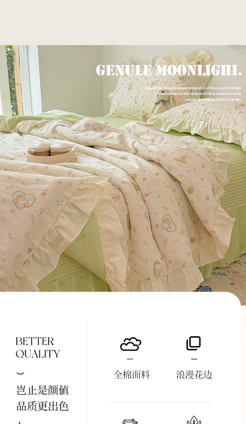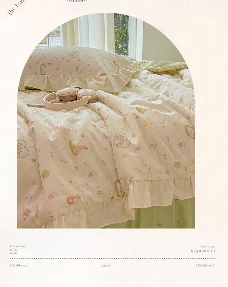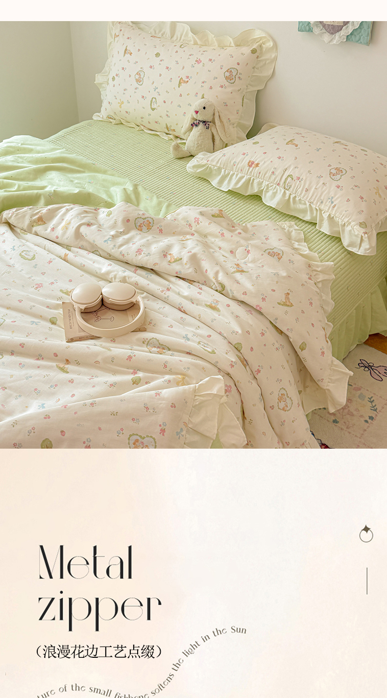 当前位置: 91家纺网 > 商品网购 > 床品套件 > 四件套 > 夏被四件套 > 简宜家居(朝初家纺) 2026新款全棉花边夏被全棉床盖夏被四件套 兔与花笺