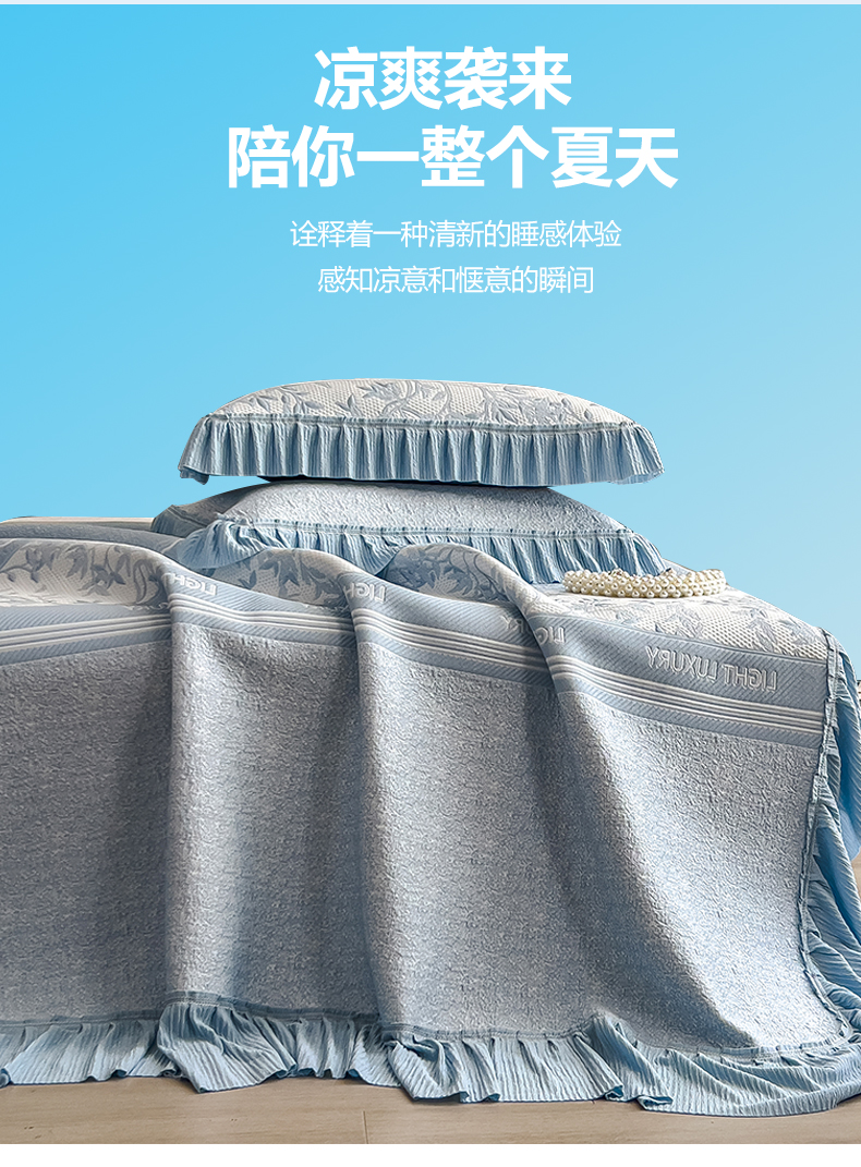 (总)慕木家纺 2026新款A类乙纶双面提花560克冰豆豆花边床盖款床裙迎客松系列(提供买家秀),迎客松-蓝,迎客松-绿,迎客松-粉,迎客松-灰