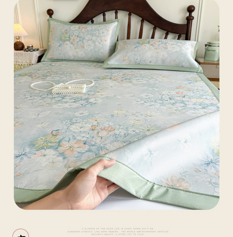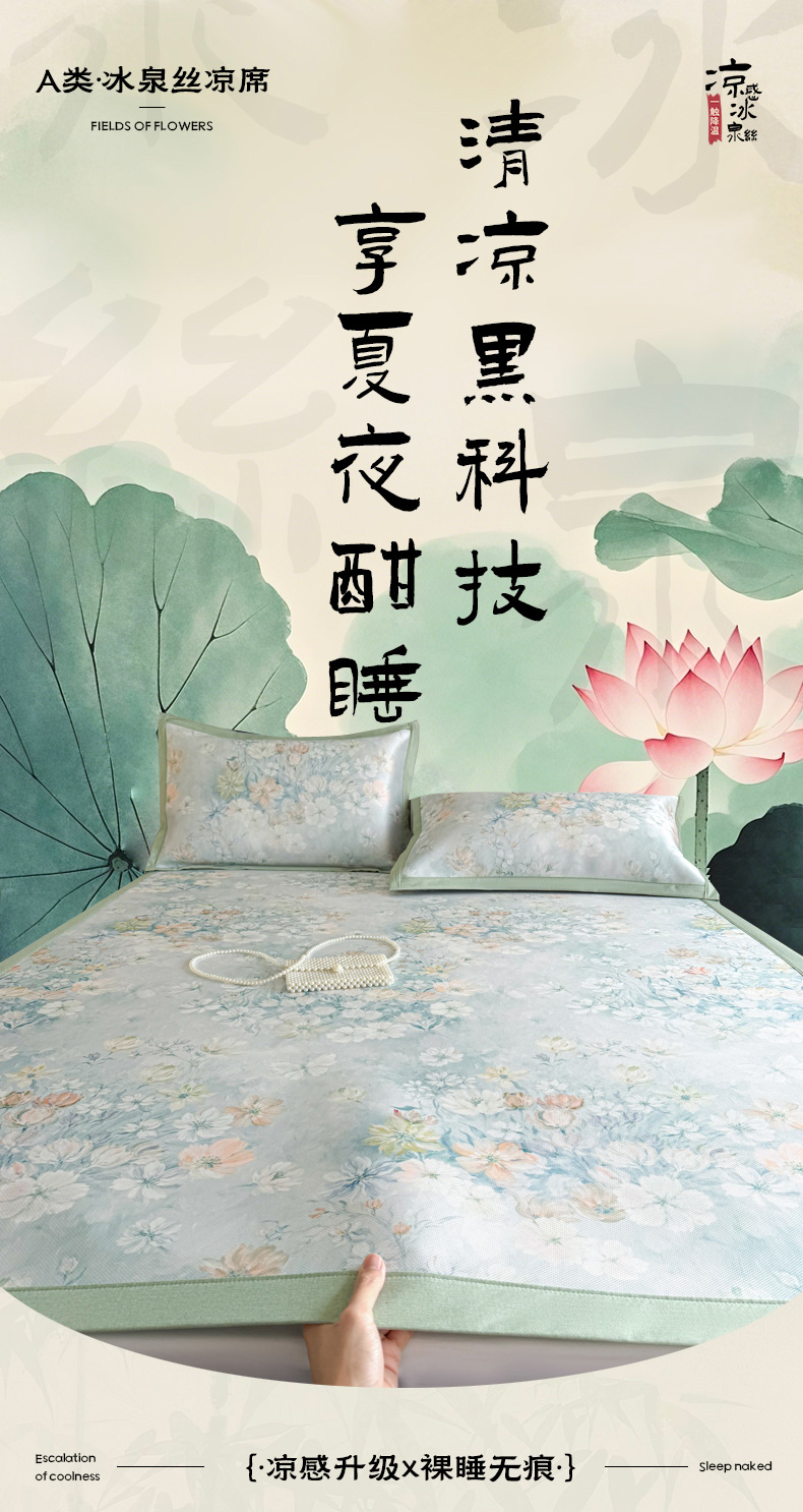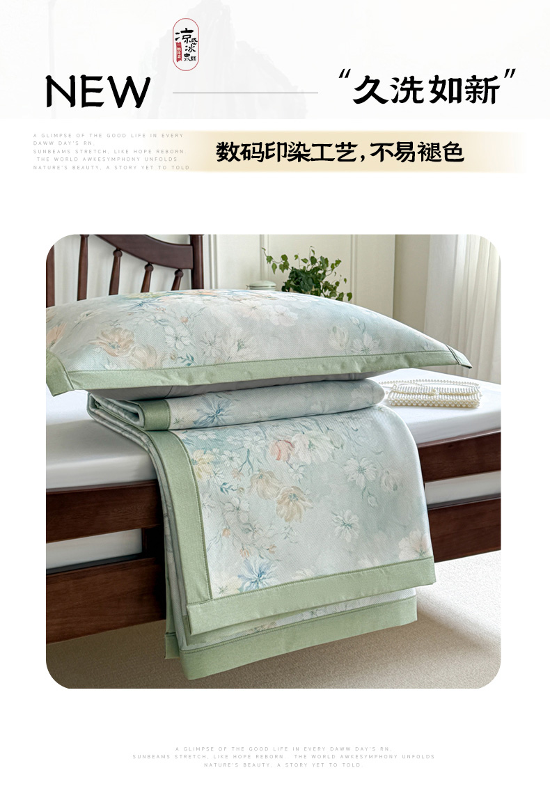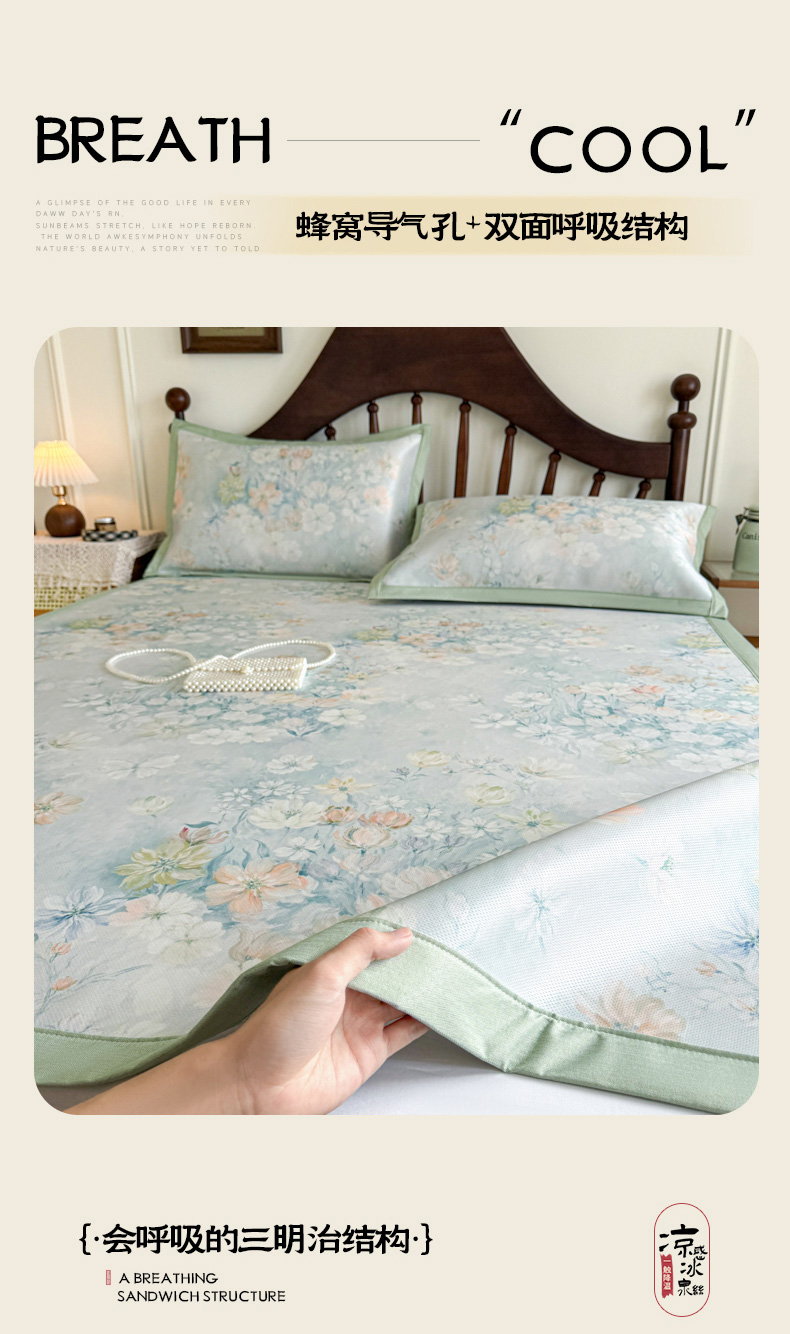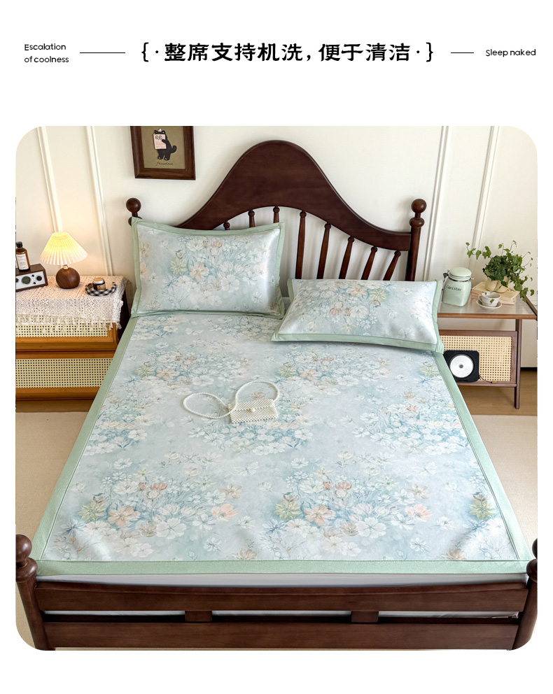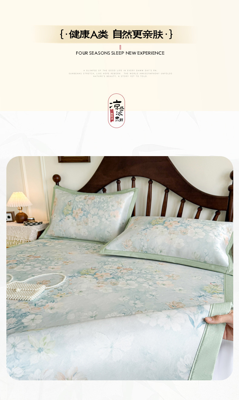 商品名称:倾慕家纺 2026新款A类数码印花冰泉丝凉席 玉兰花绿
