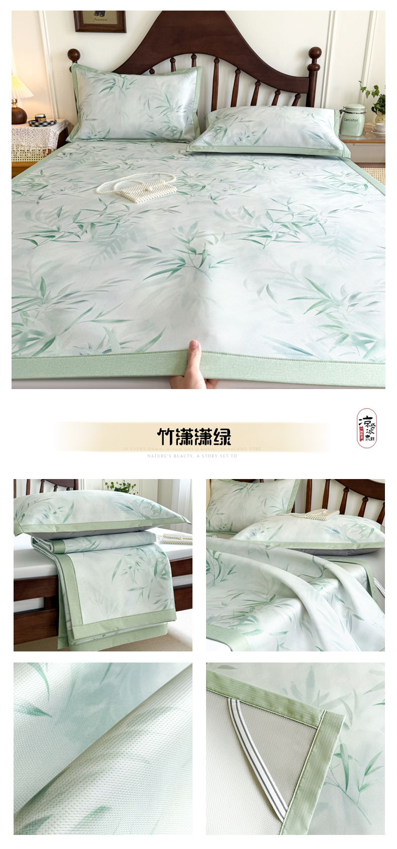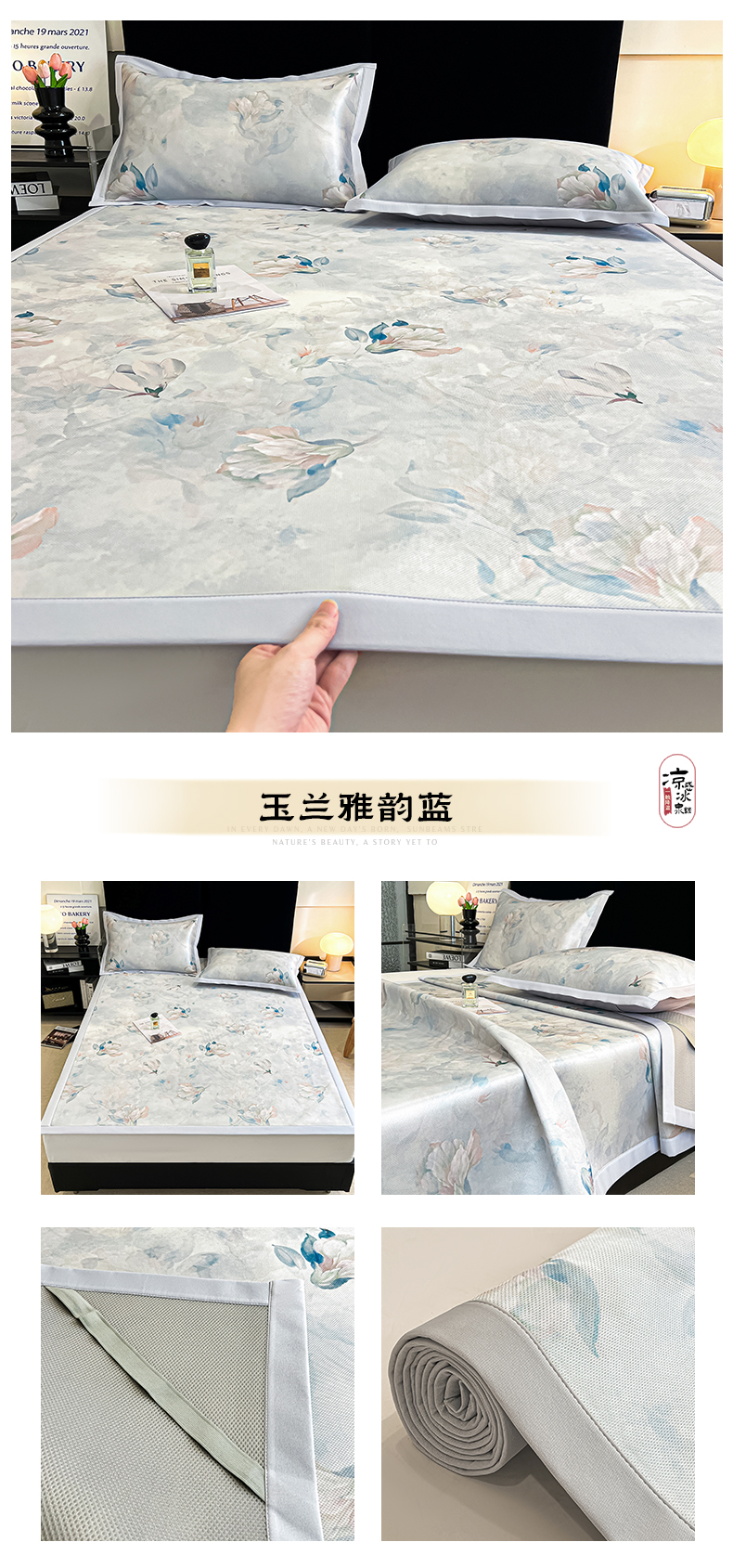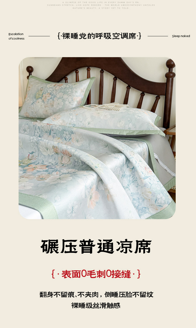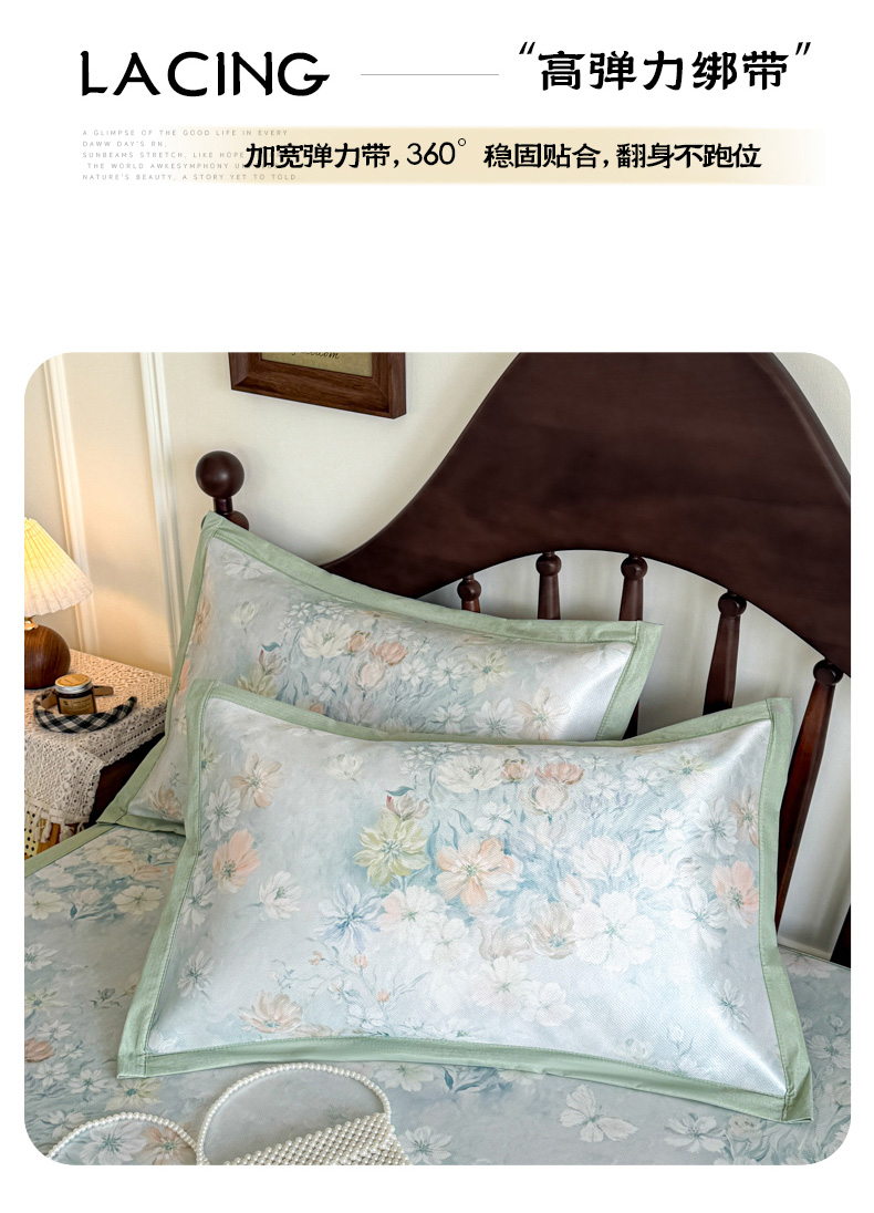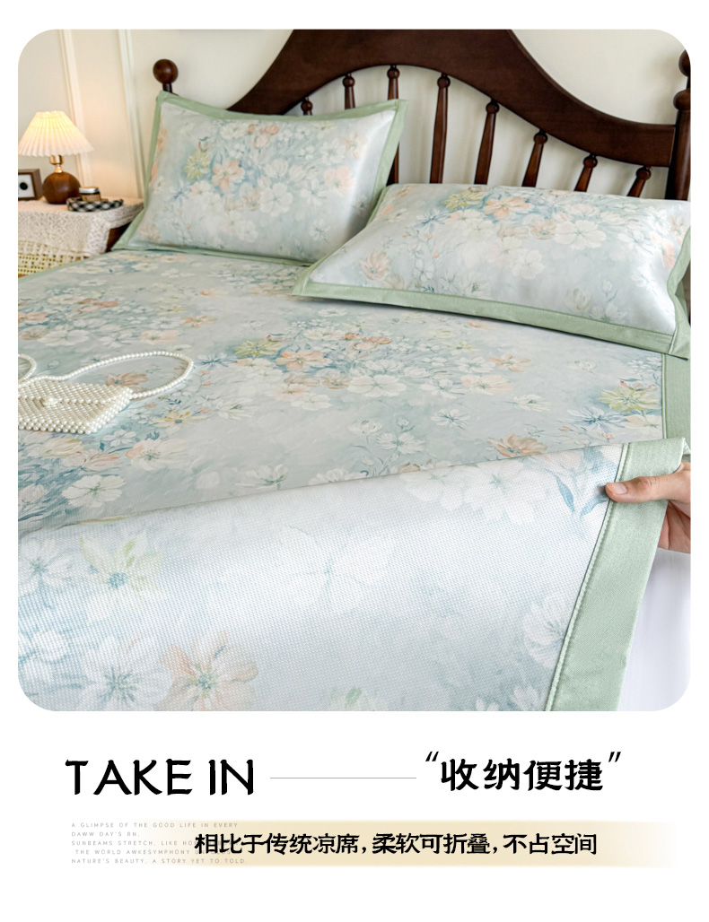 商品名称:倾慕家纺 2026新款A类数码印花冰泉丝凉席 玉兰花绿