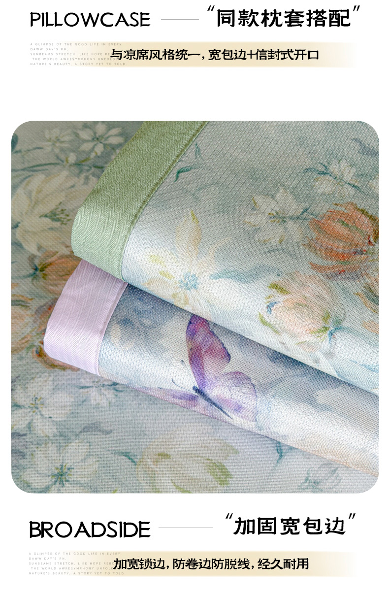 (总)倾慕家纺 2026新款A类数码印花冰泉丝凉席,蝴蝶之舞粉,蝴蝶之舞绿,花艺绿,摩尼粉,摩尼紫,水墨江南绿,素情,鲜花小镇,玉兰花绿,玉兰花紫,云梦海棠,竹潇潇绿,组合,玉兰雅韵蓝,玉兰雅韵青