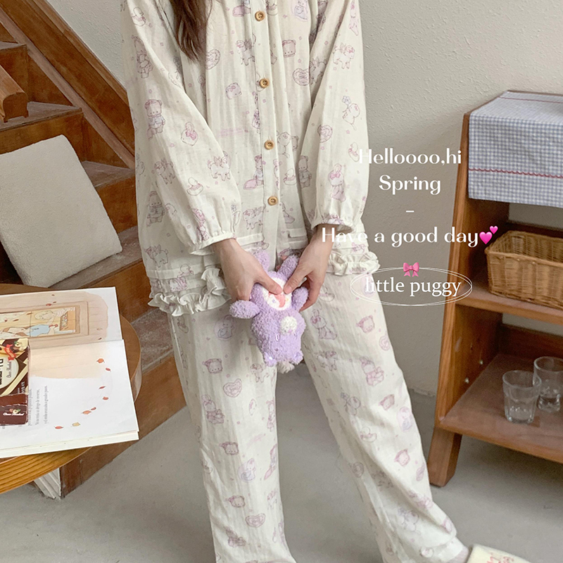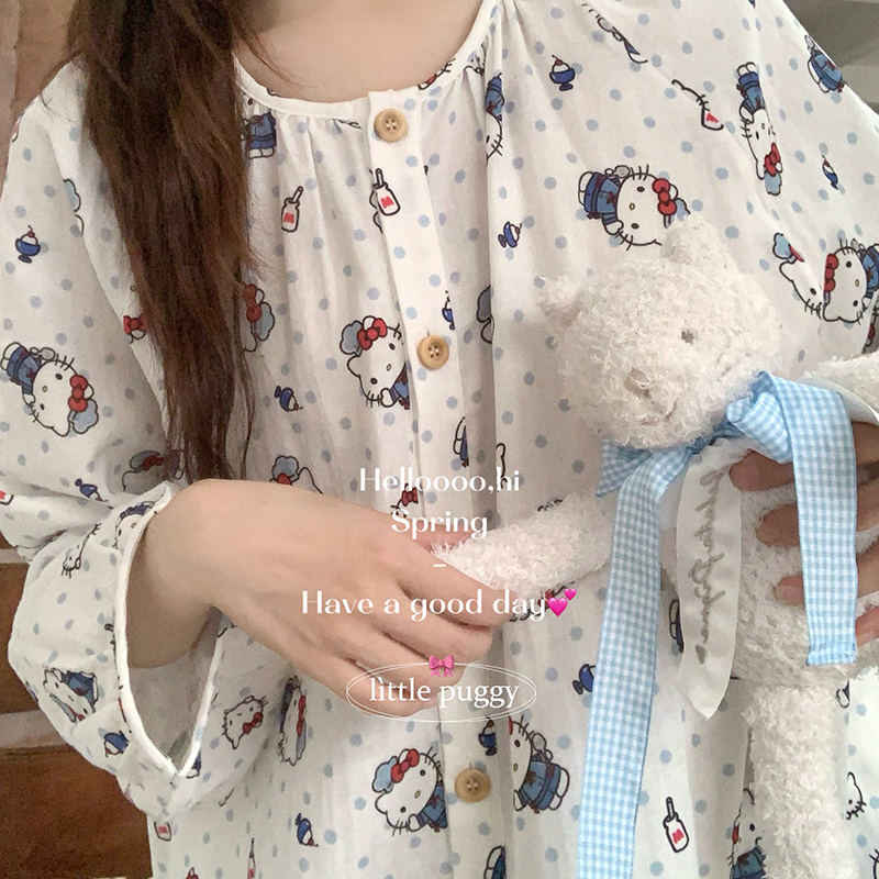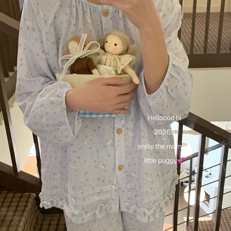 当前位置: 91家纺网 > 商品网购 > 居家日用 > 睡衣/家居服套装 > 妍景家居生活馆 2026新款木耳边纱布套装 黄格子雪糕小猫